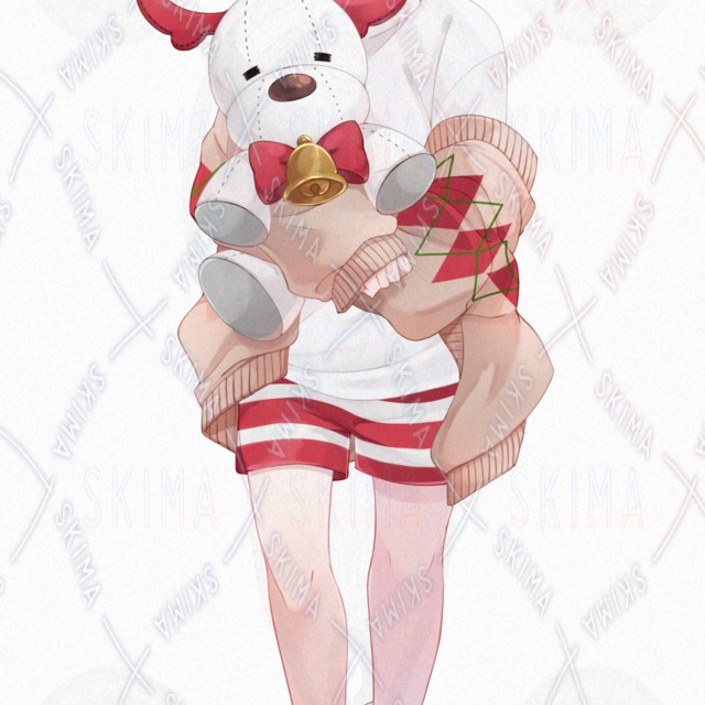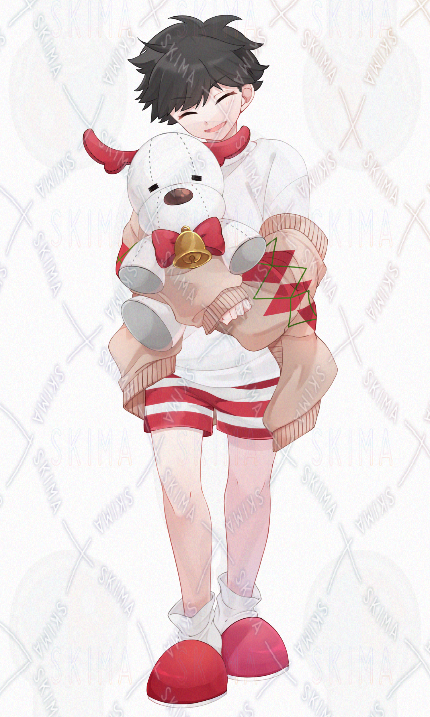 立ち絵/少年/男の子/かわいい/かっこいい/冬/クリスマス/クリスマスイブ/サンタ/サンタクロース/プレゼント/カーデ/ニット/赤/白/スリッパ/ズボン/黒髪/金/黒目/琥珀/つり目/短パン/短髪/ぬいぐるみ/トナカイ/白シャツ/もこもこ/ふわふわ/ボーダー/縞/しましま/ルームウェア/パジャマ/