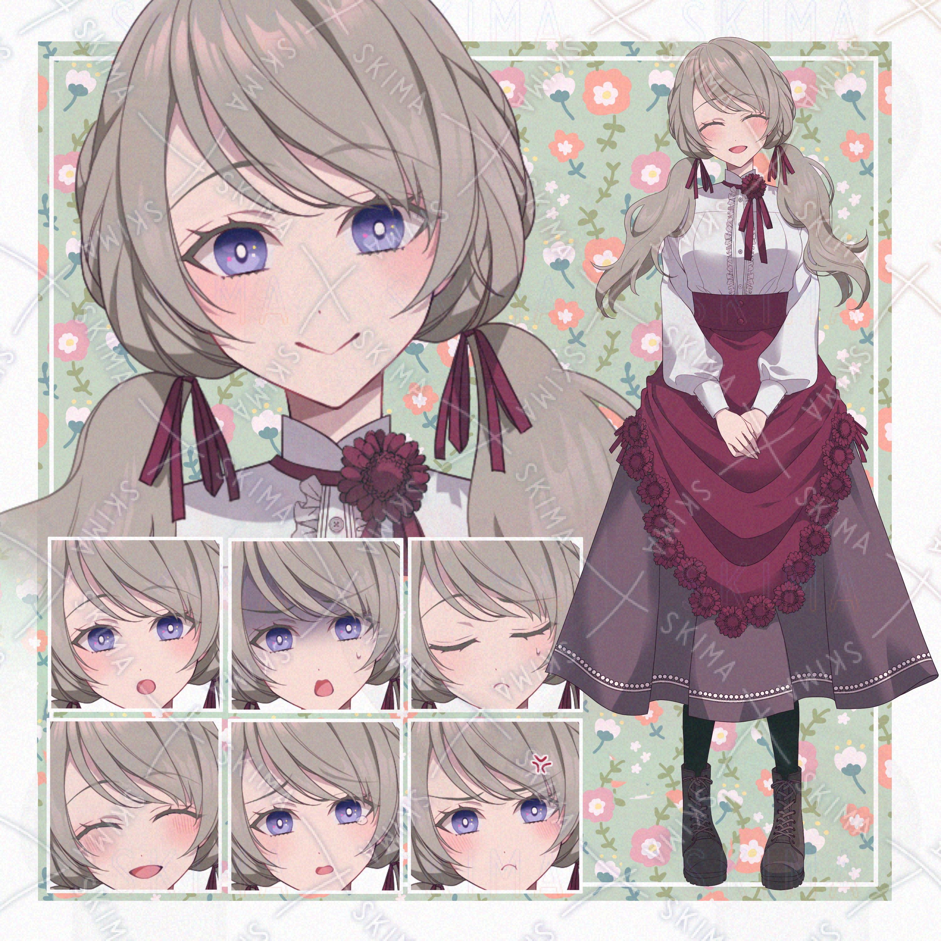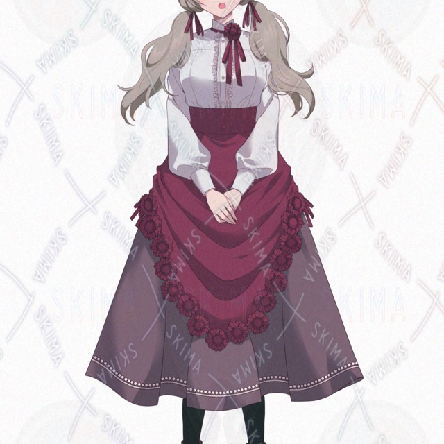 女子、女の子、ツインテール、二つ結び、スカート、髪飾り、花、ブーツ、リボン、ファンタジー、お嬢様、令嬢、赤、臙脂、ワインレッド