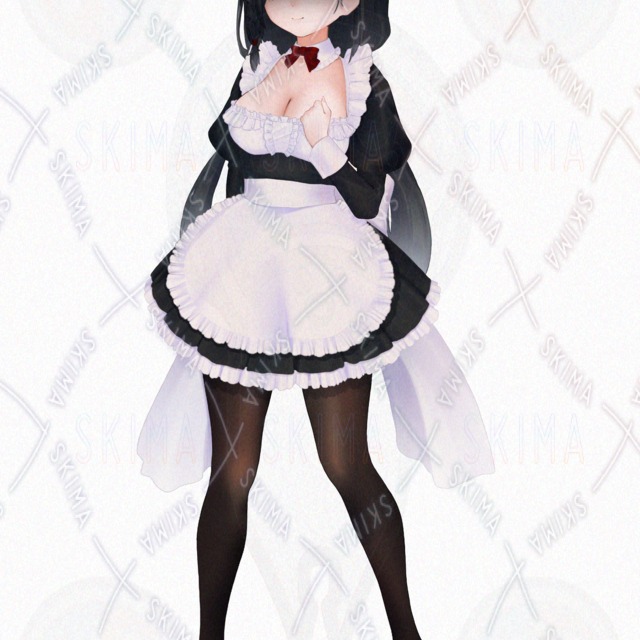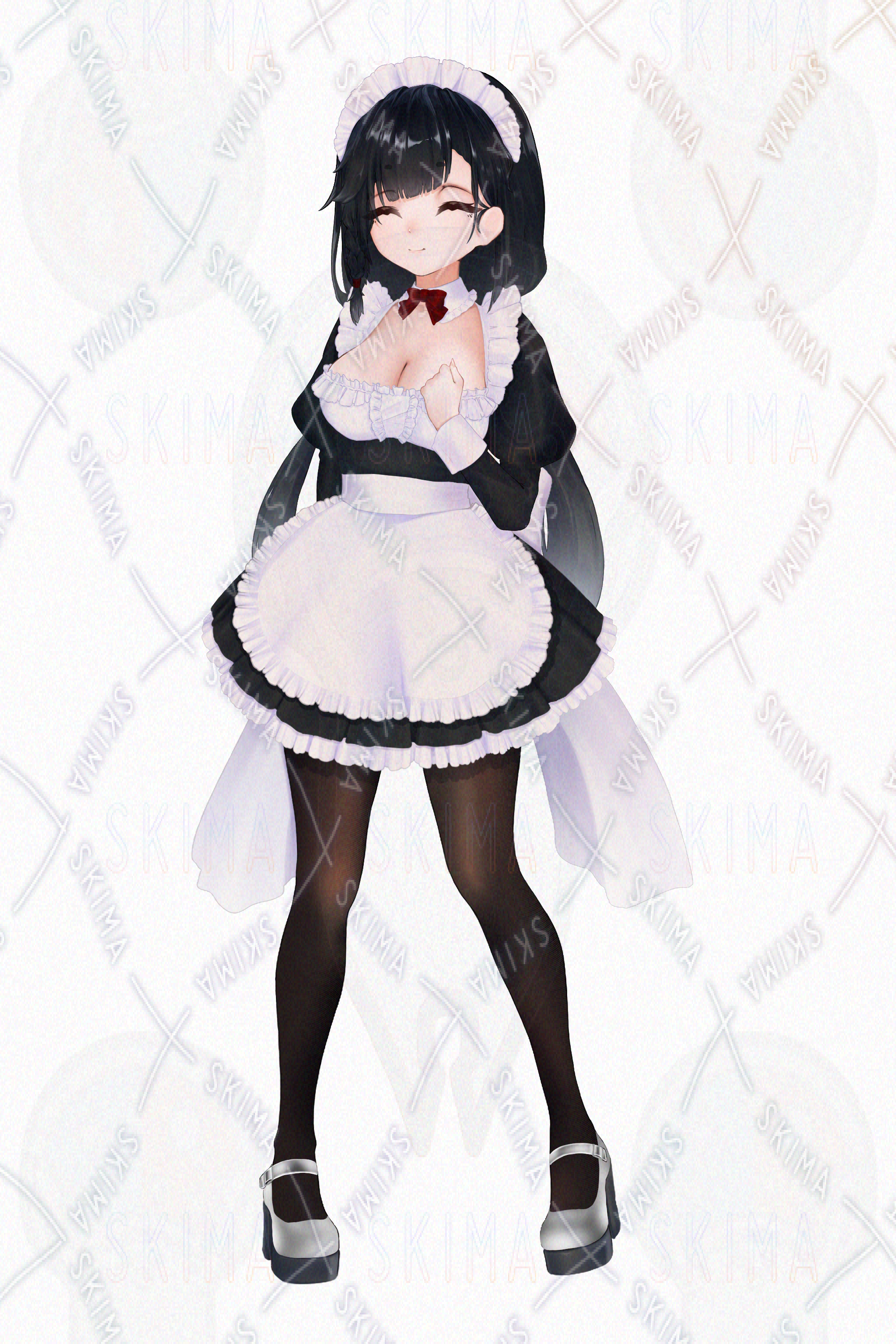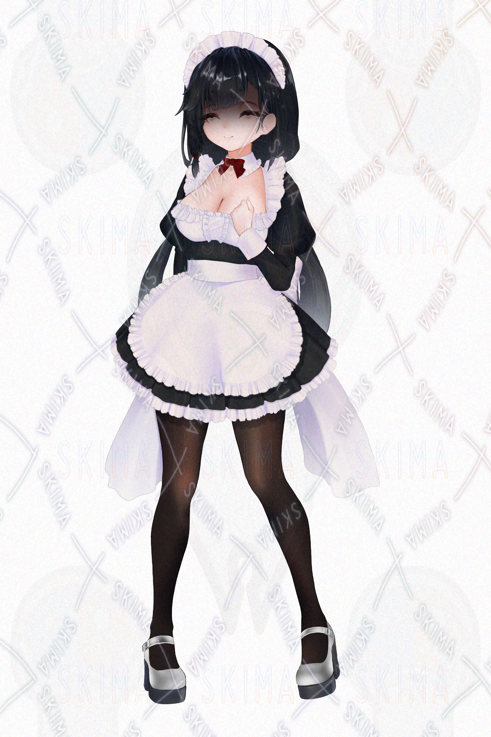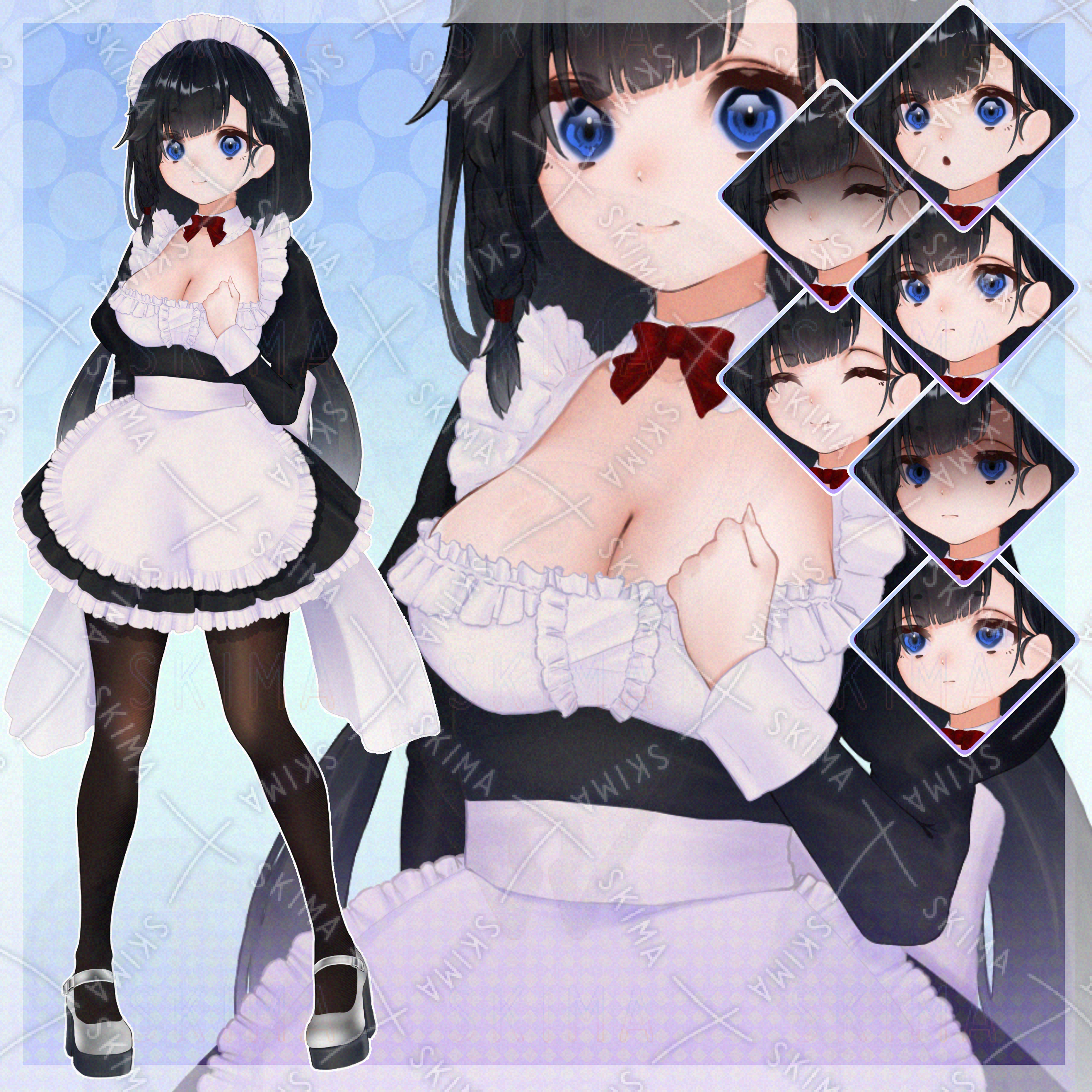 女の子、女子、少女、女性、フレンチメイド、フレンチ、メイド、巨乳、、黒髪、おさげ、二つ結び、三つ編み、青、かわいい、立ち絵