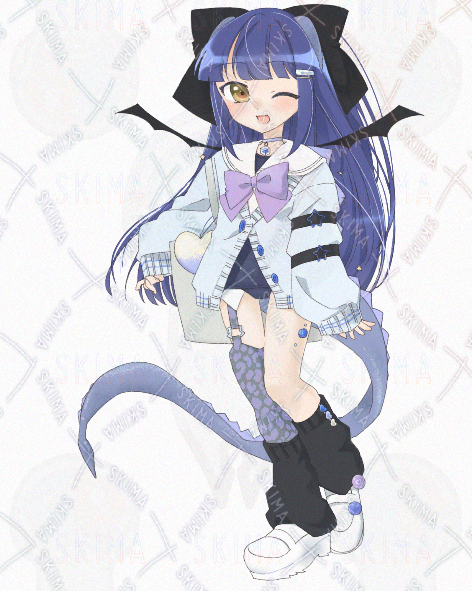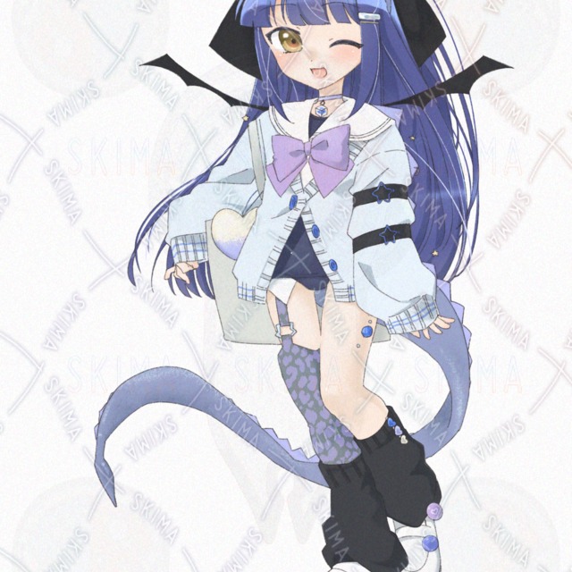 羽根と尻尾に耳?がついたセーラースク水のドラゴン娘です。