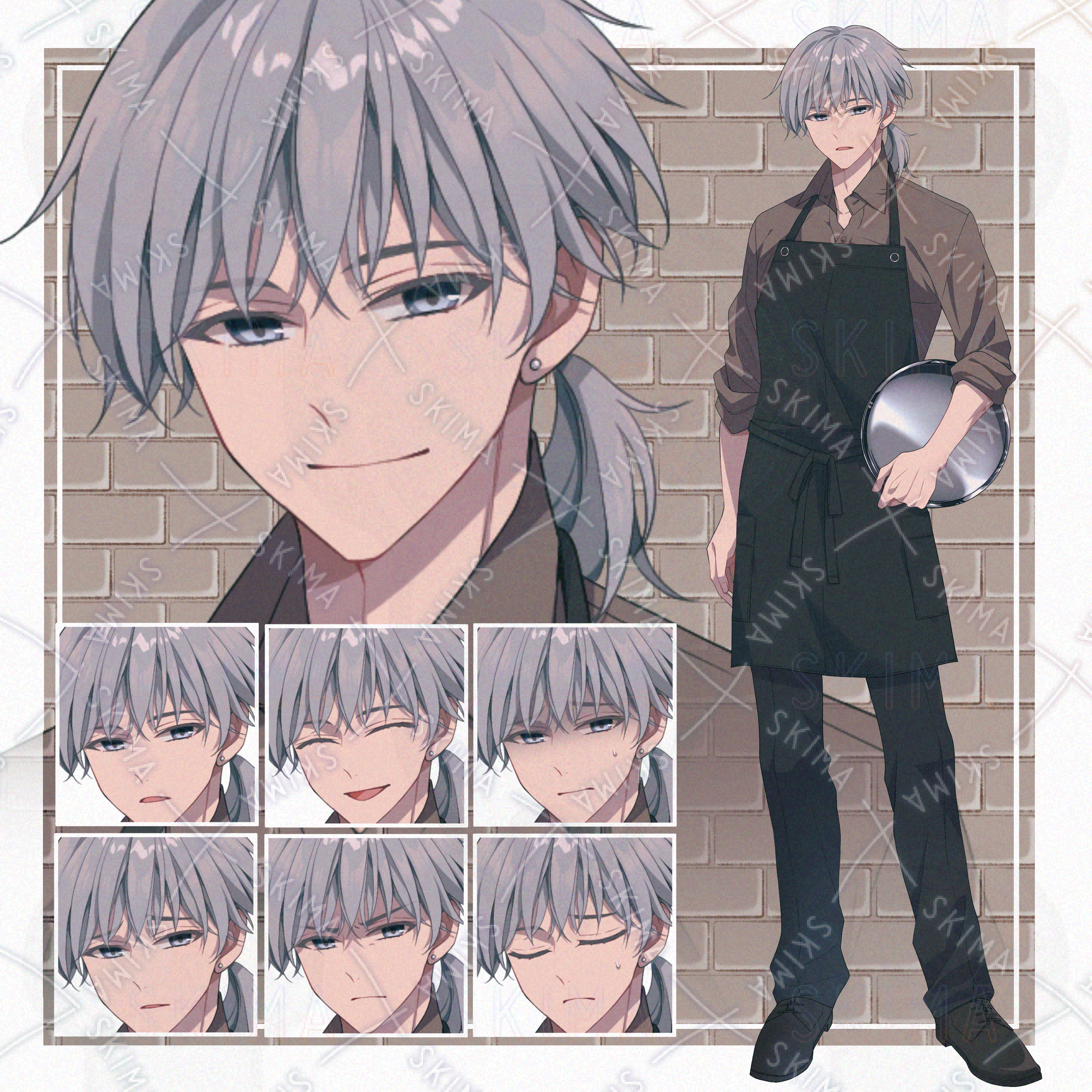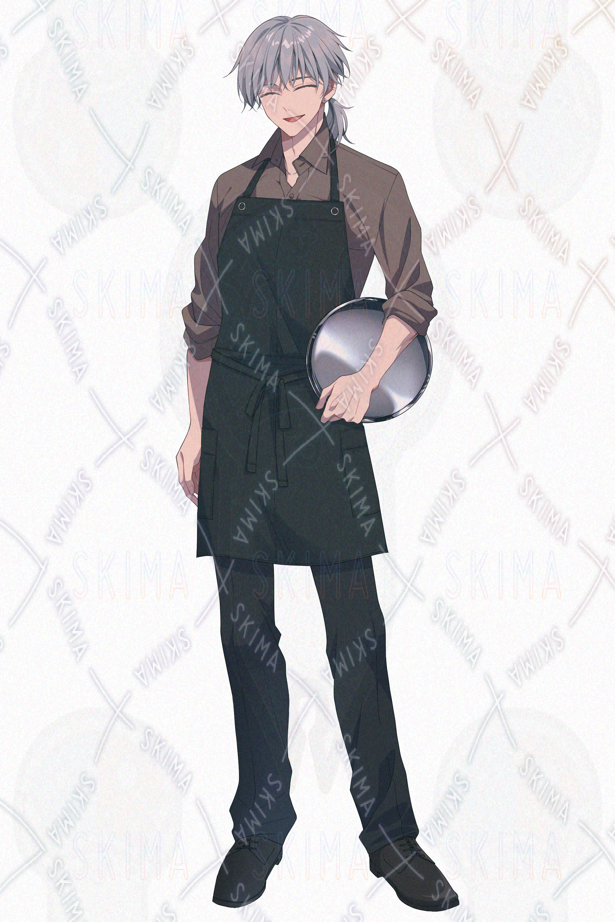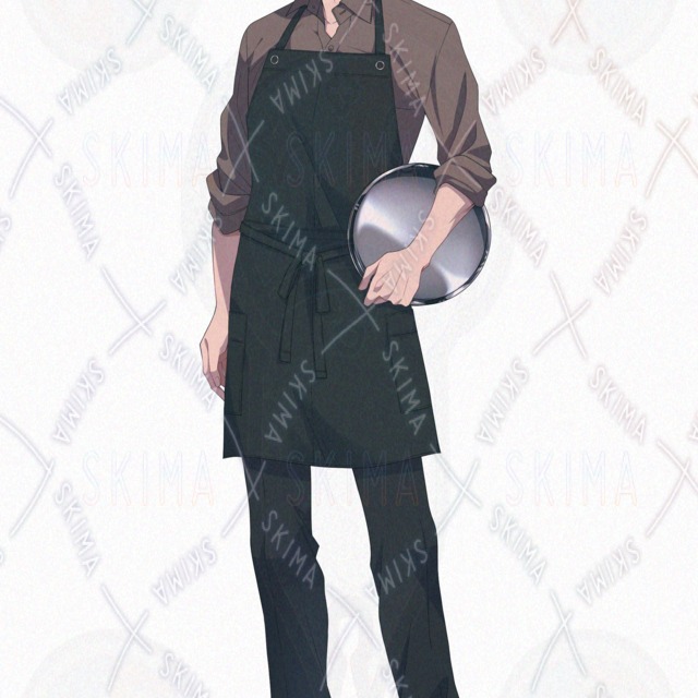 銀髪、青年、レストラン、カフェ、給仕、店員、エプロン、制服