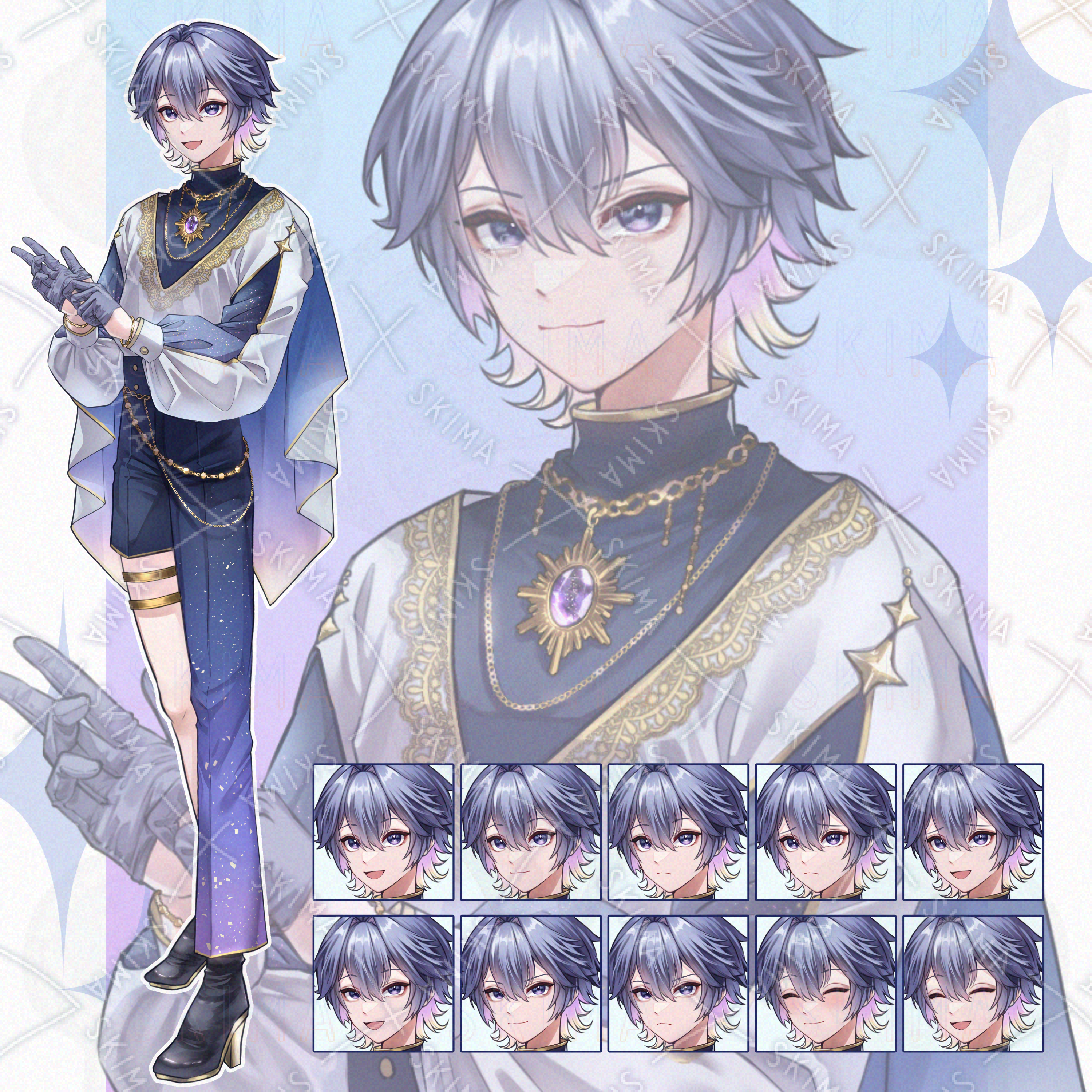 夜明けの空の色と、アイオライトサンストーンなどの青紫系の宝石をイメージした少年です。