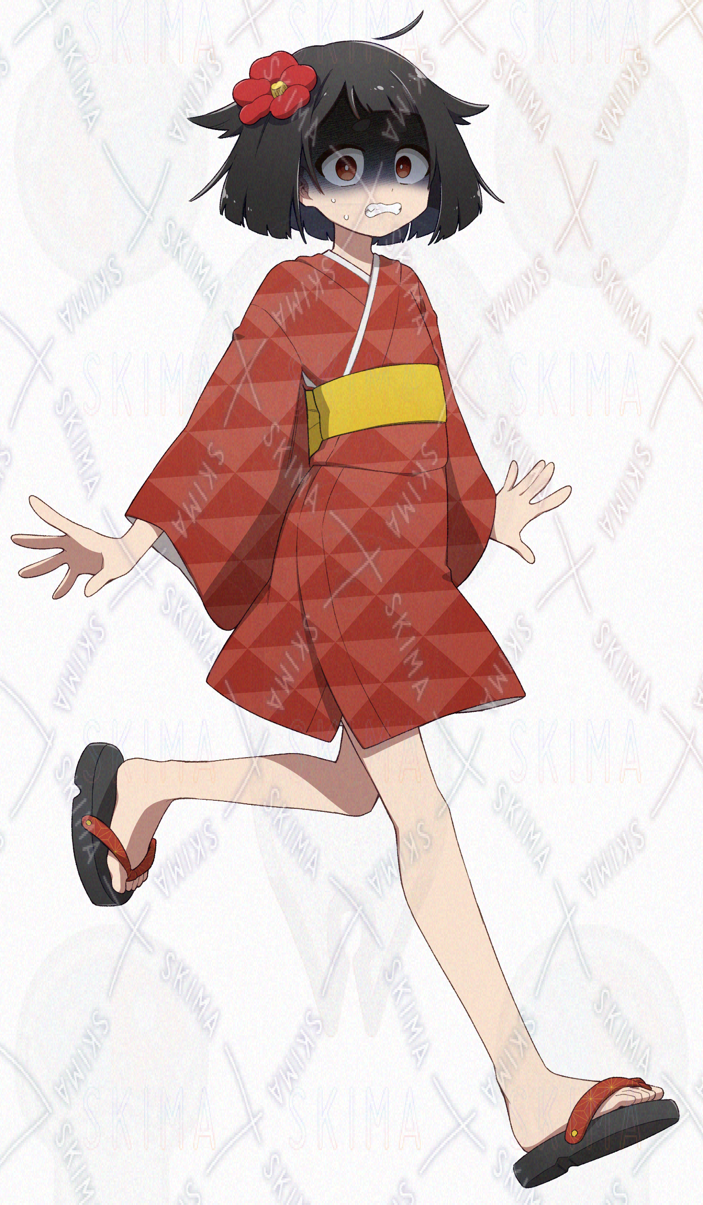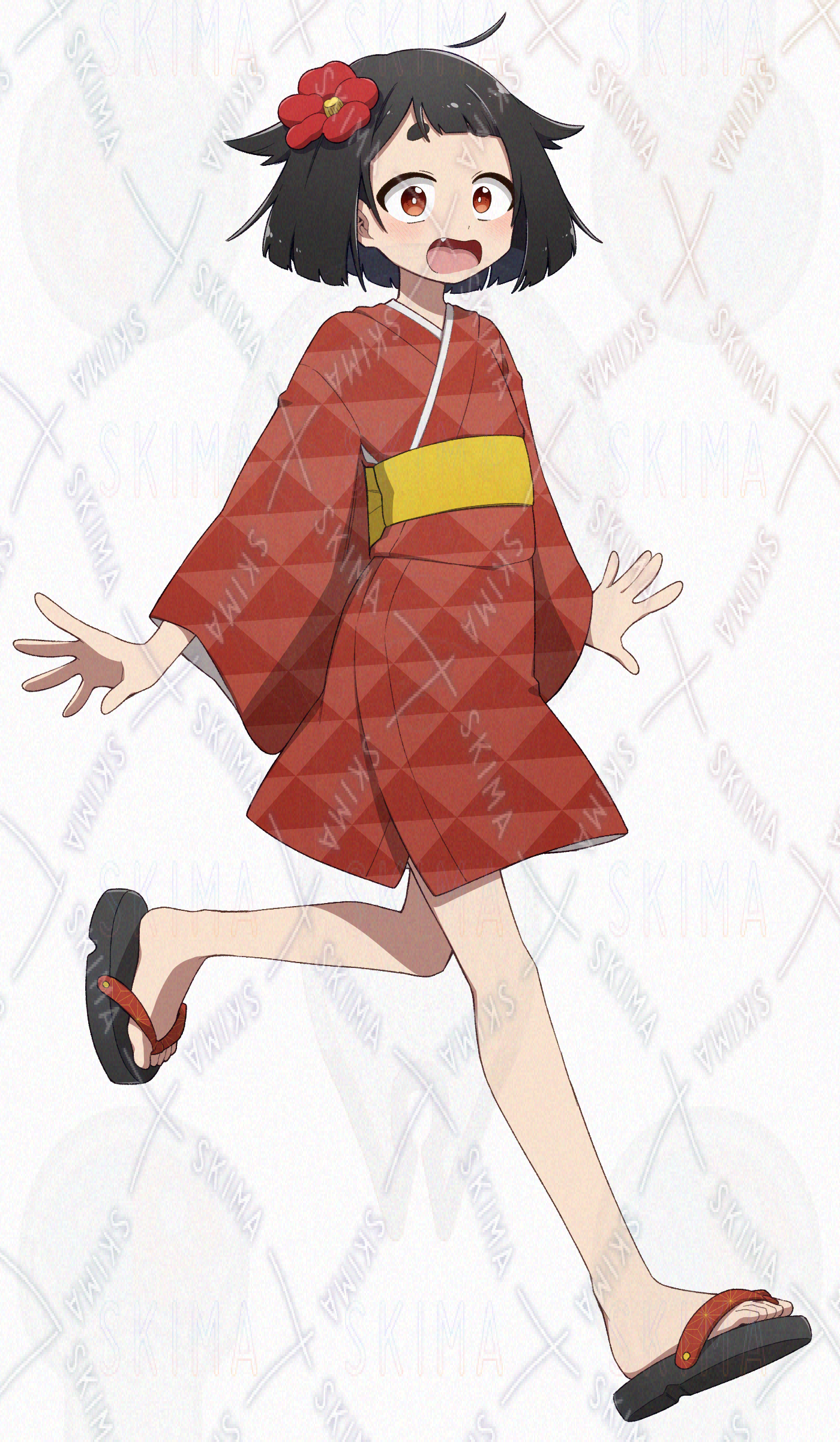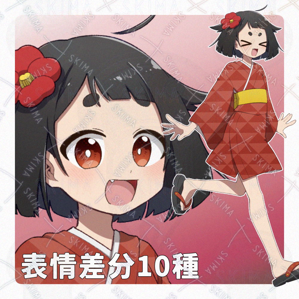 黒髪に赤い着物を着た座敷童系ロリです。太眉八重歯のおてんばな女の子!
