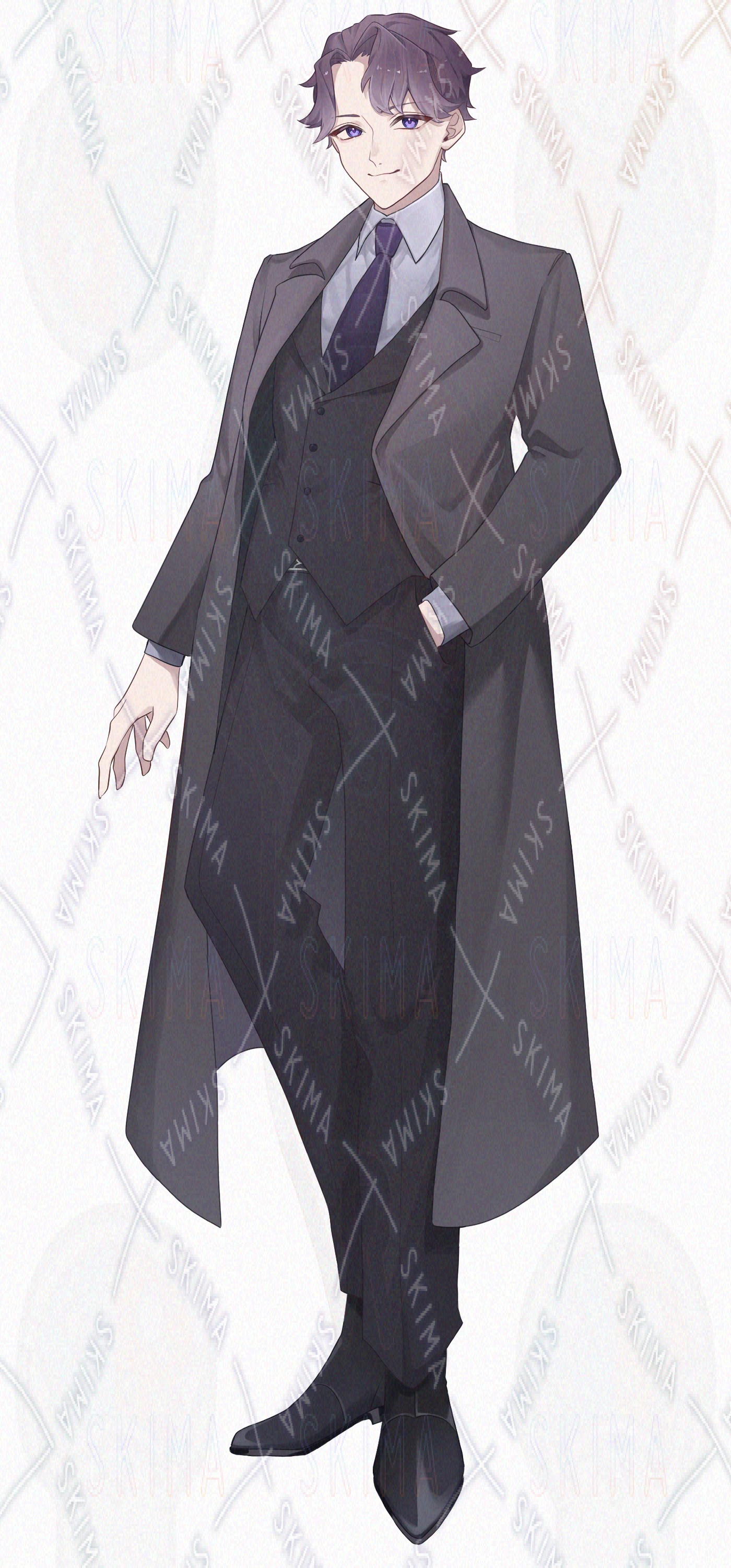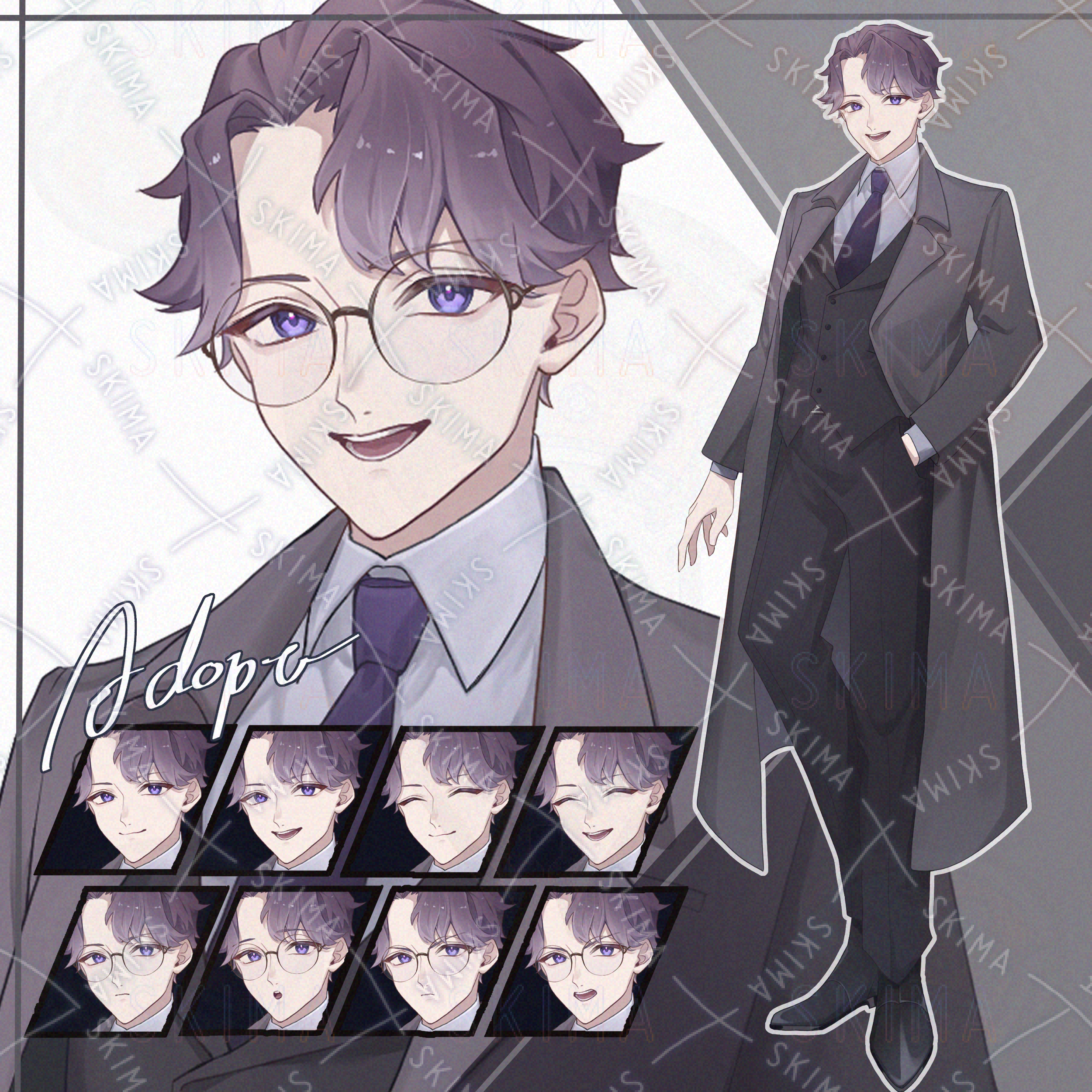 メガネ差分あり、表情差分8種、紫髪のコートを着たスーツの男性キャラです。