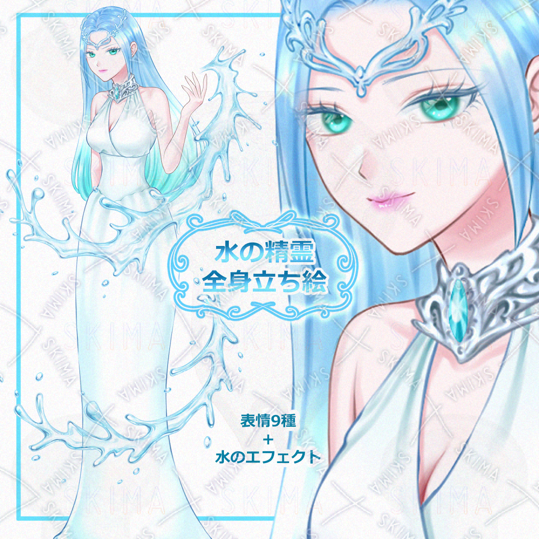 水の精霊と言った感じの女性の全身立ち絵です。表情9種類+水のエフェクト素材です。
