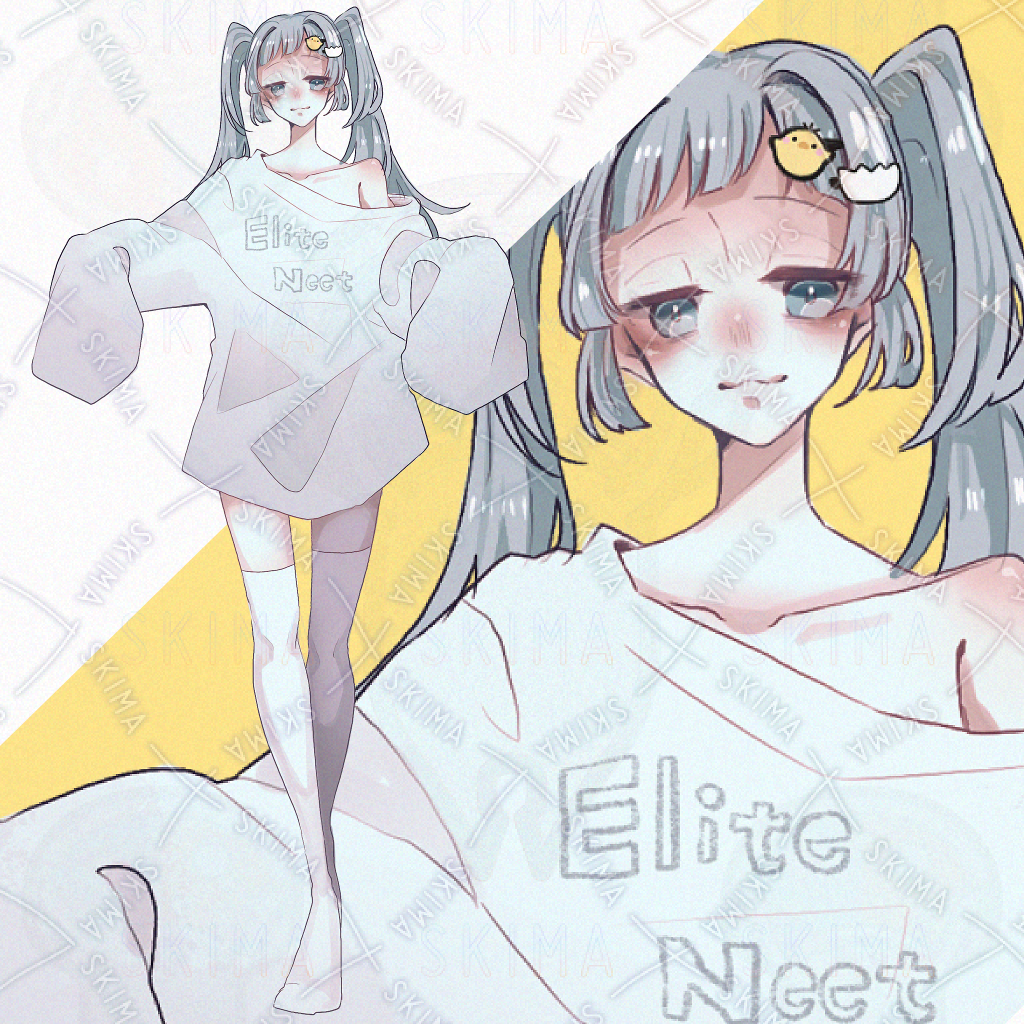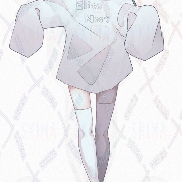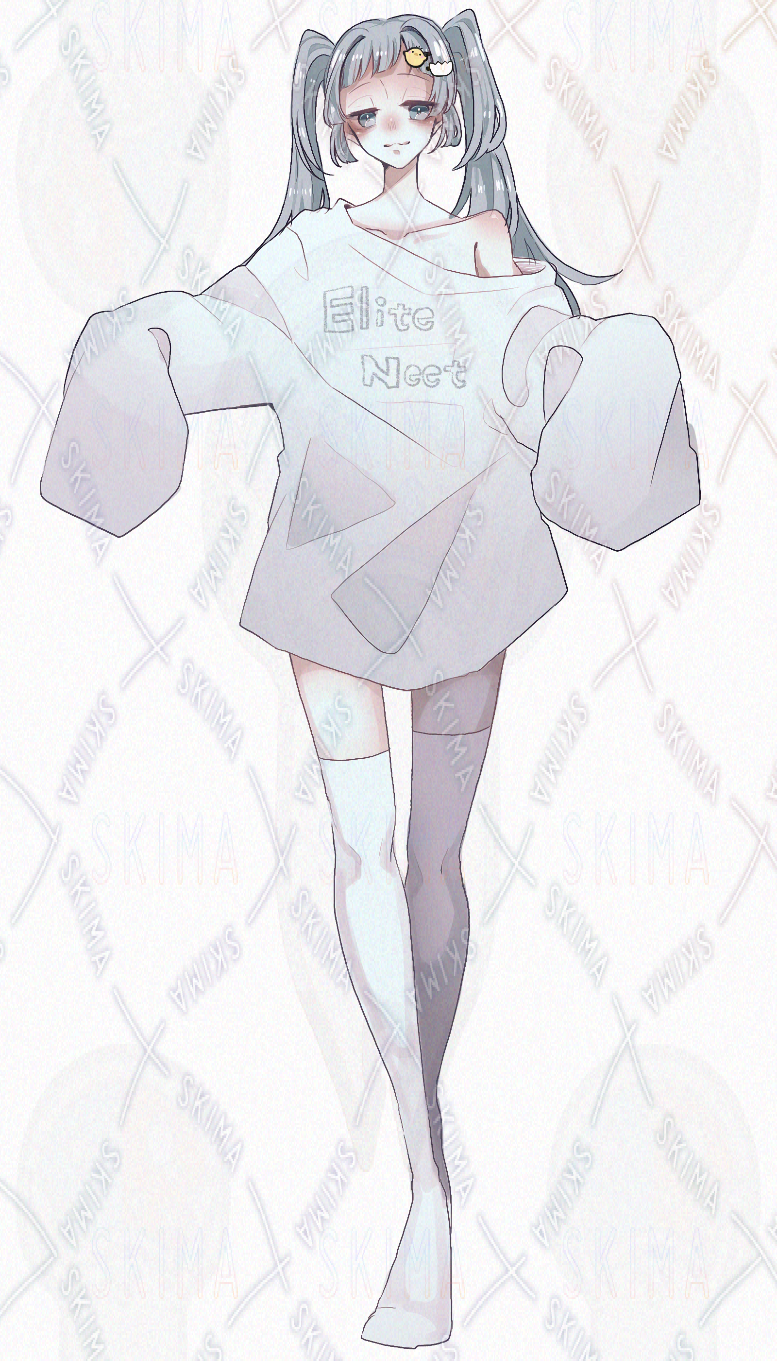 ツインテール/女の子/水色髪/碧眼/アヒル口/萌え袖/ニーハイソックス/ジト目/下がり眉/困り眉