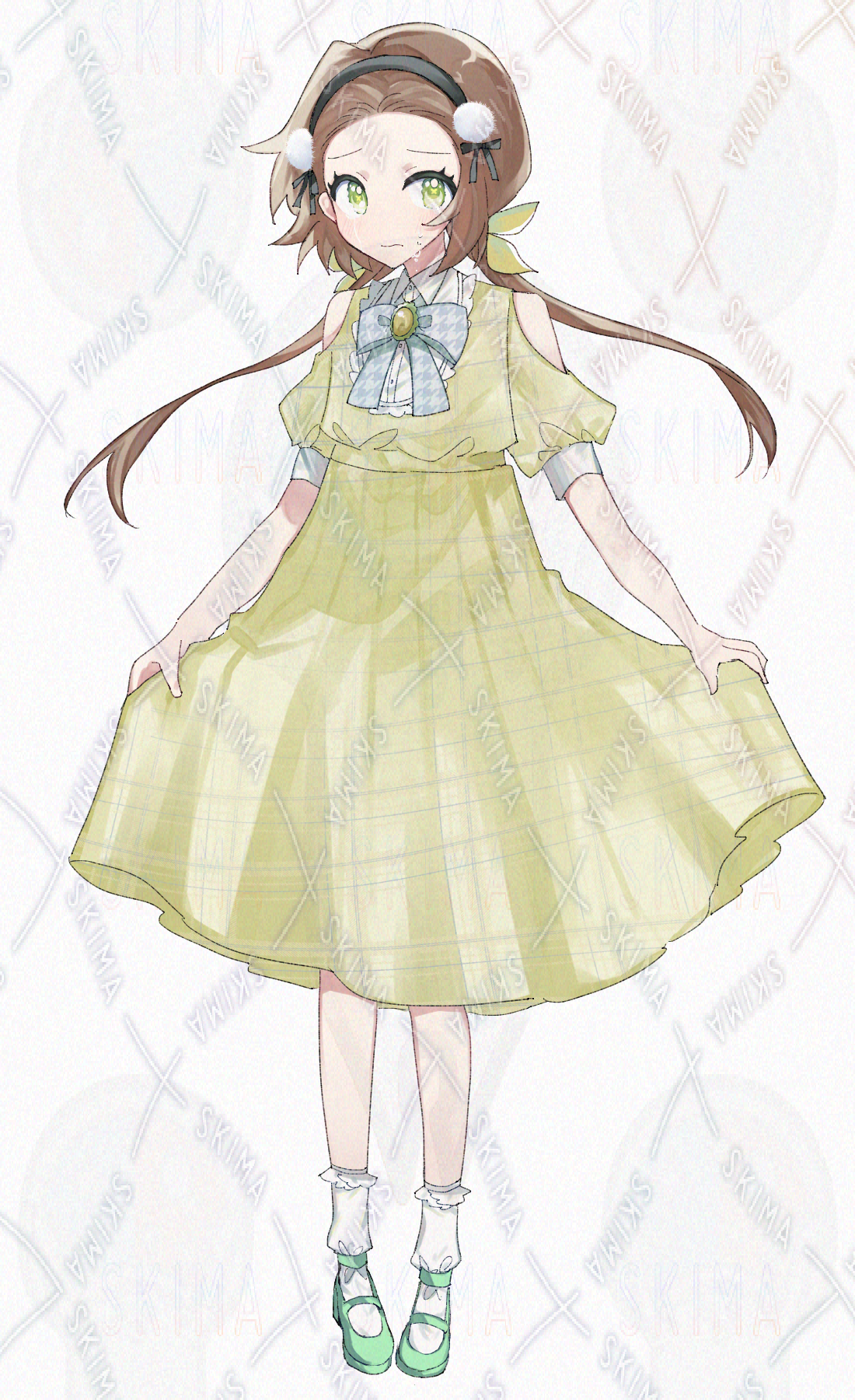 茶髪おさげにカチューシャを付けたイエローのチェック柄ワンピースを着た少女の立ち絵です。