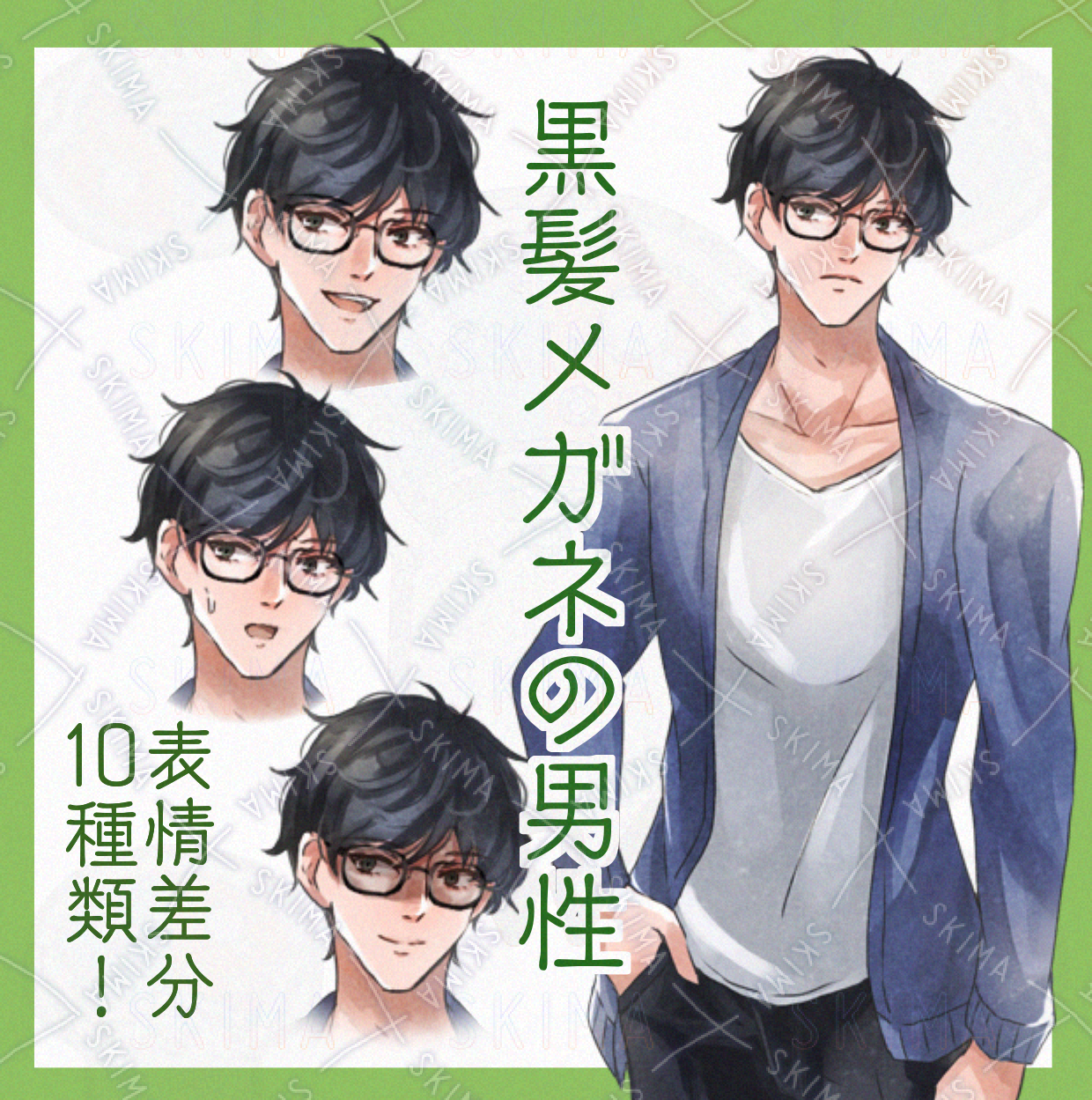 【表情10種】くせ毛黒髪メガネの男性
