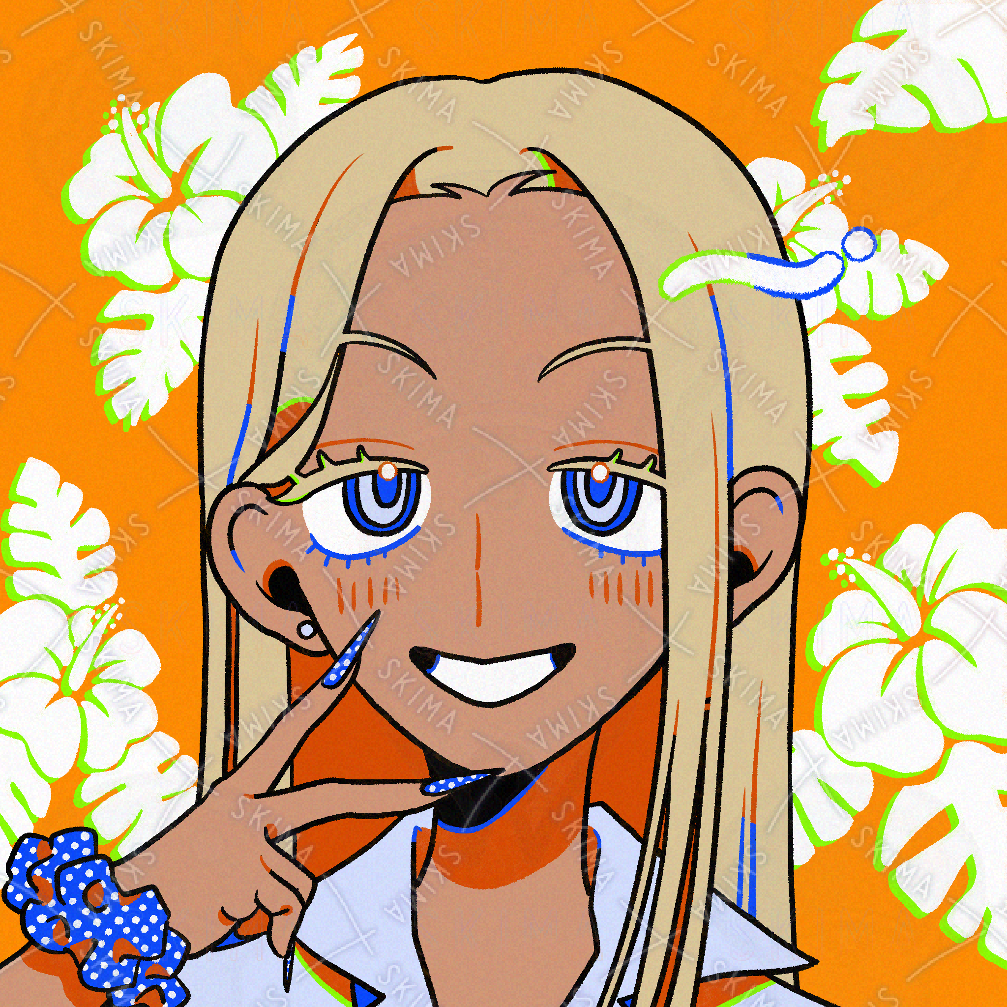 検索用/少女/女性/女の子/ギャル/平成ギャル/金髪/センター分け/タレ目/つり眉/ハイビスカス/ロングネイル/ピアス/ロングヘアー/ストレートヘアー