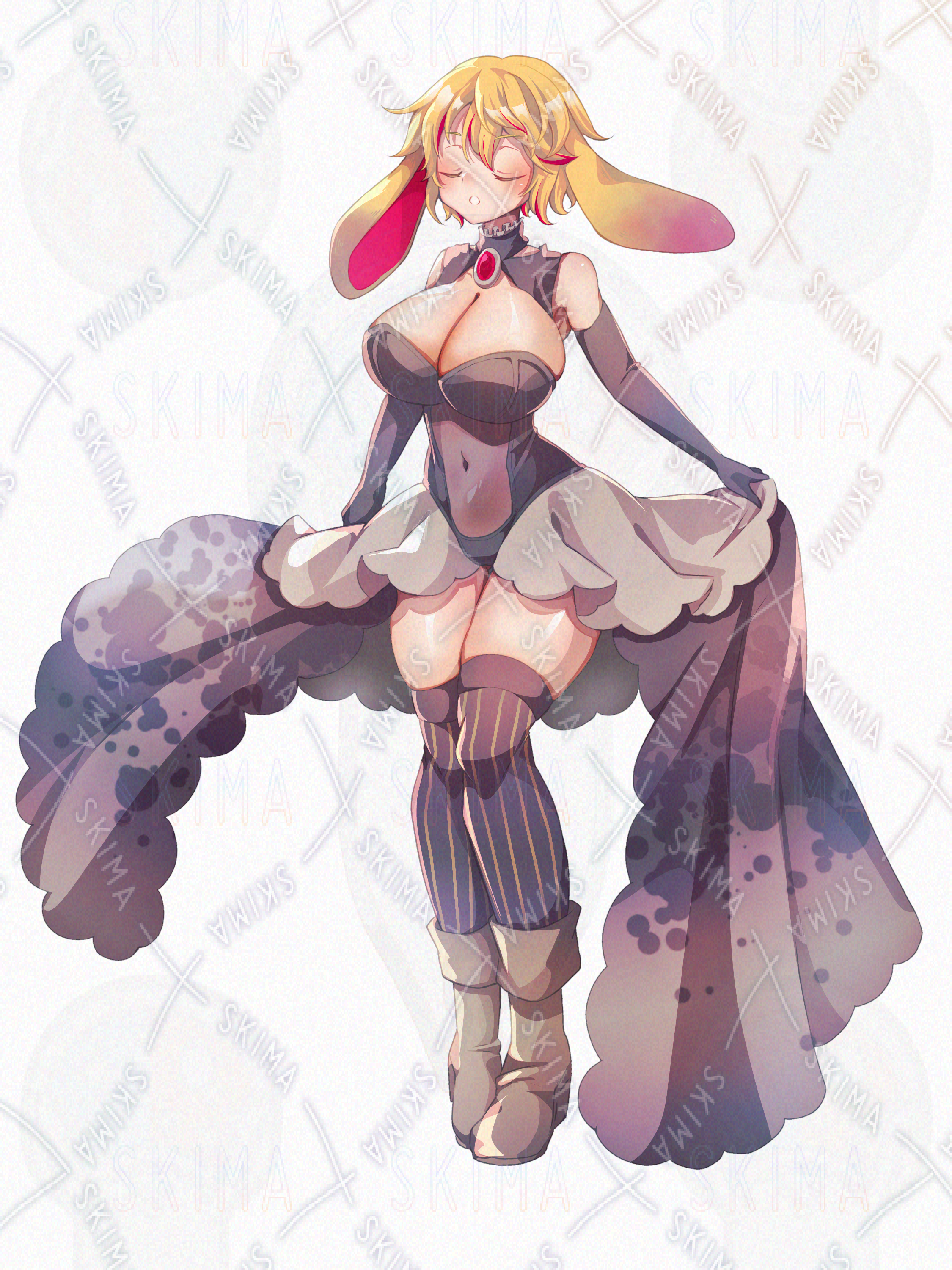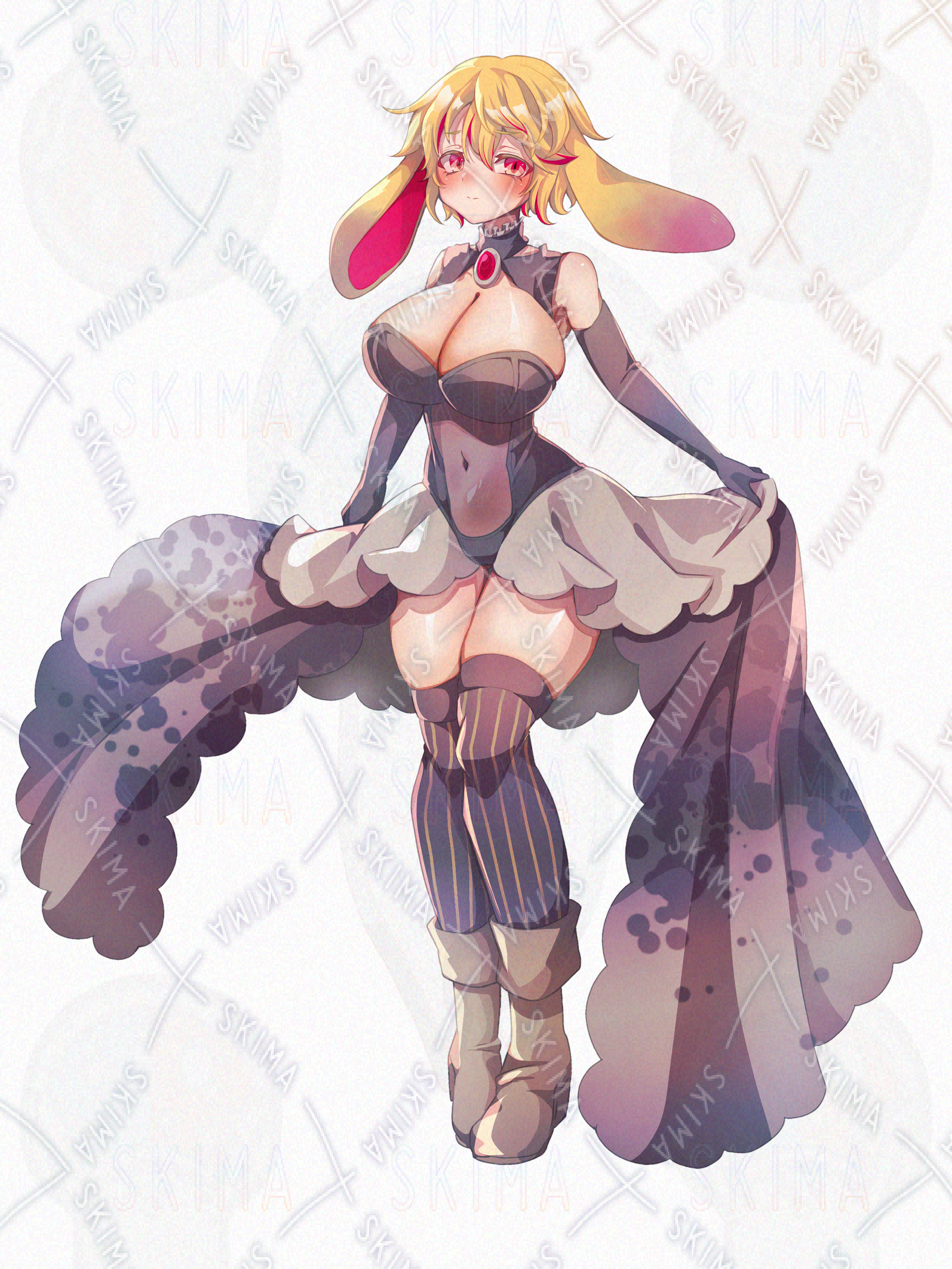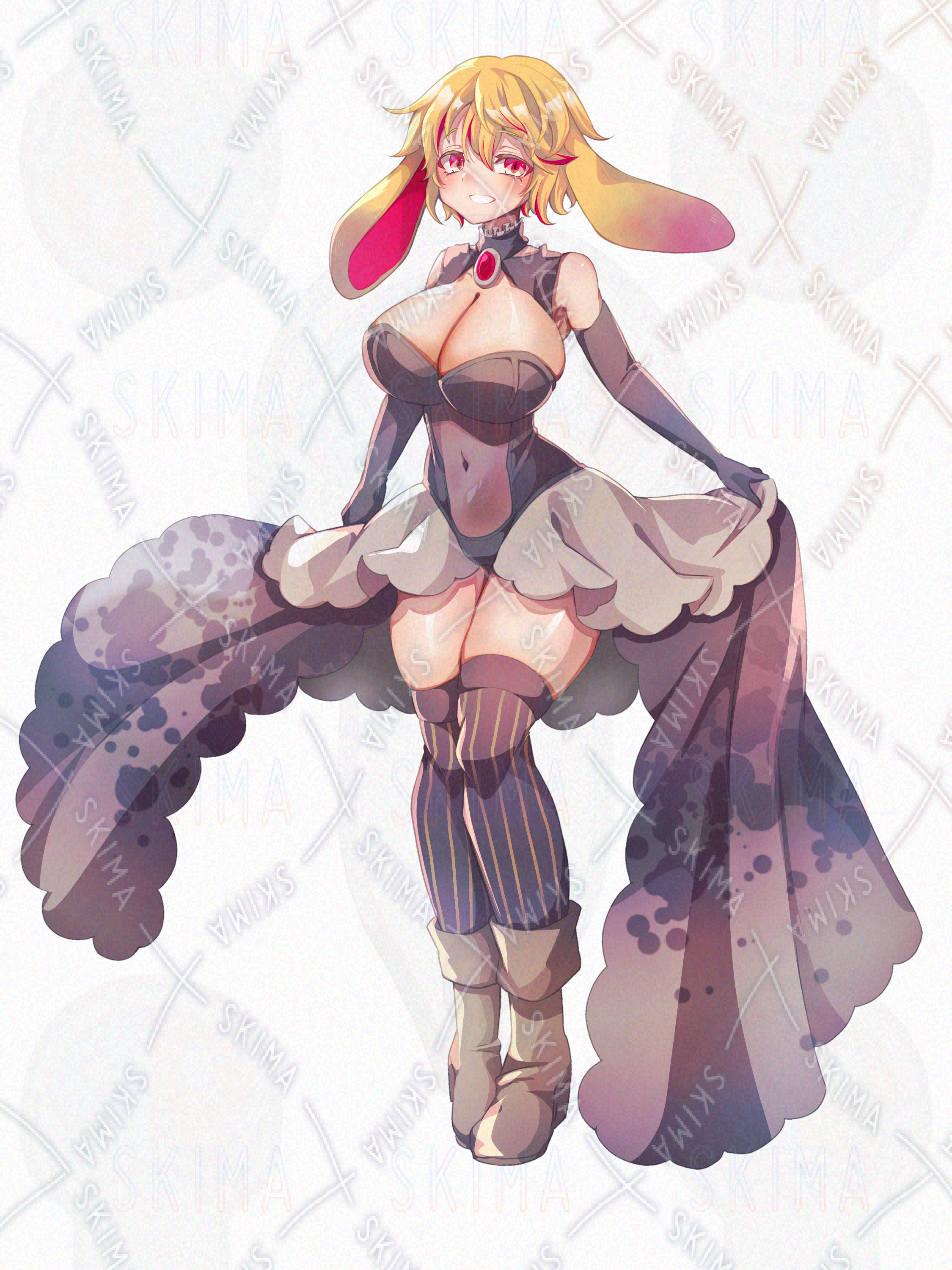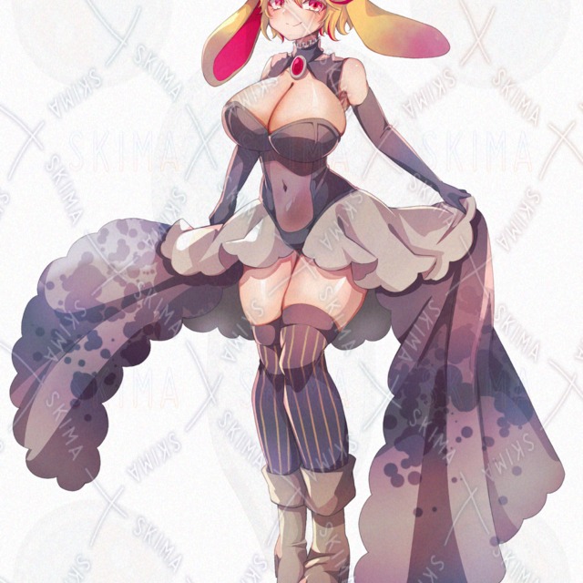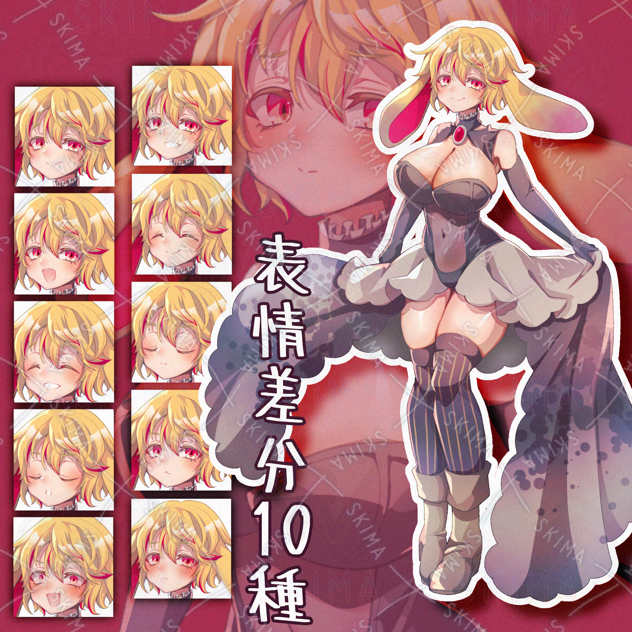 金髪に赤いメッシュ、垂れ耳うさぎの耳のようなケモ耳に、バニースーツを改造した服の女性キャラクターです。