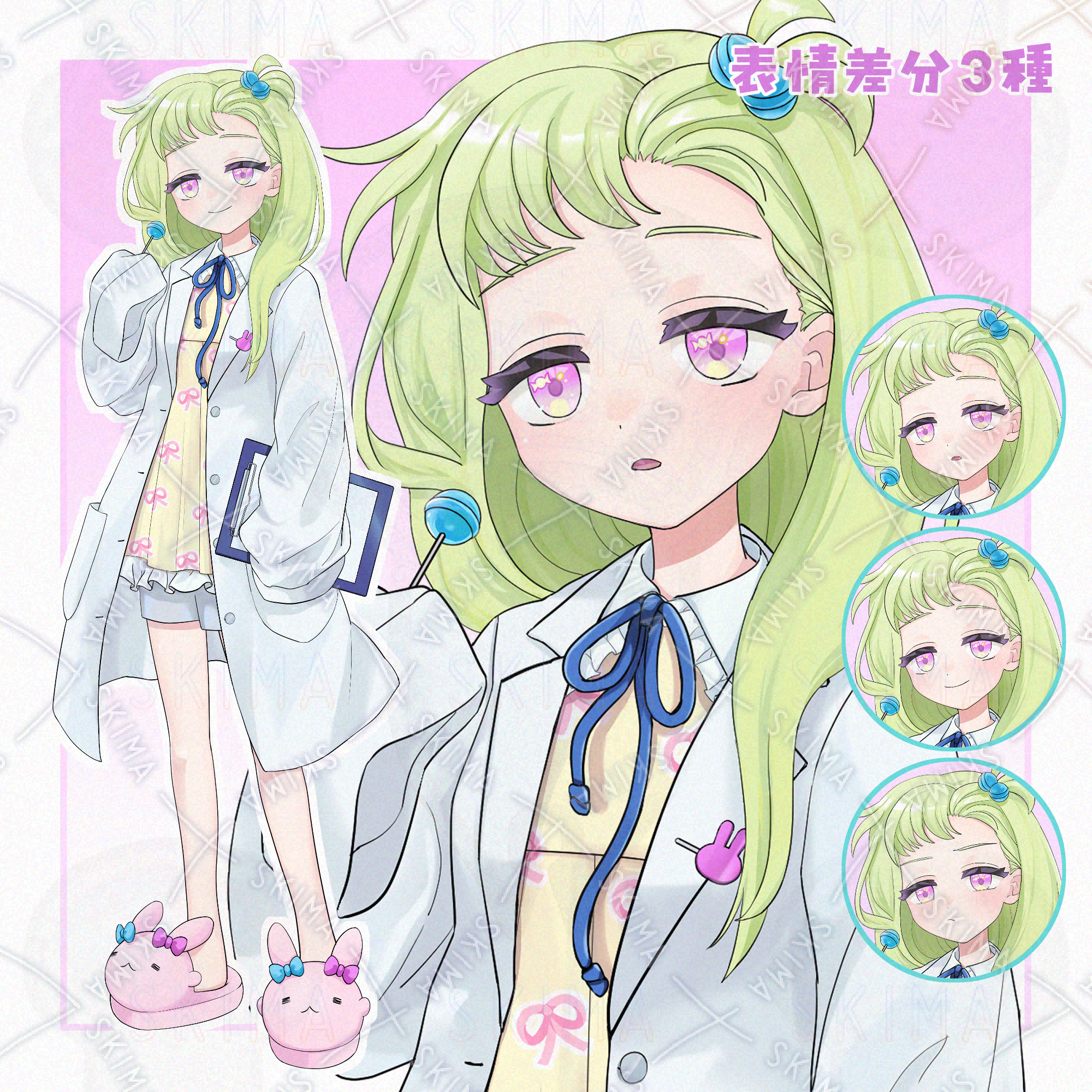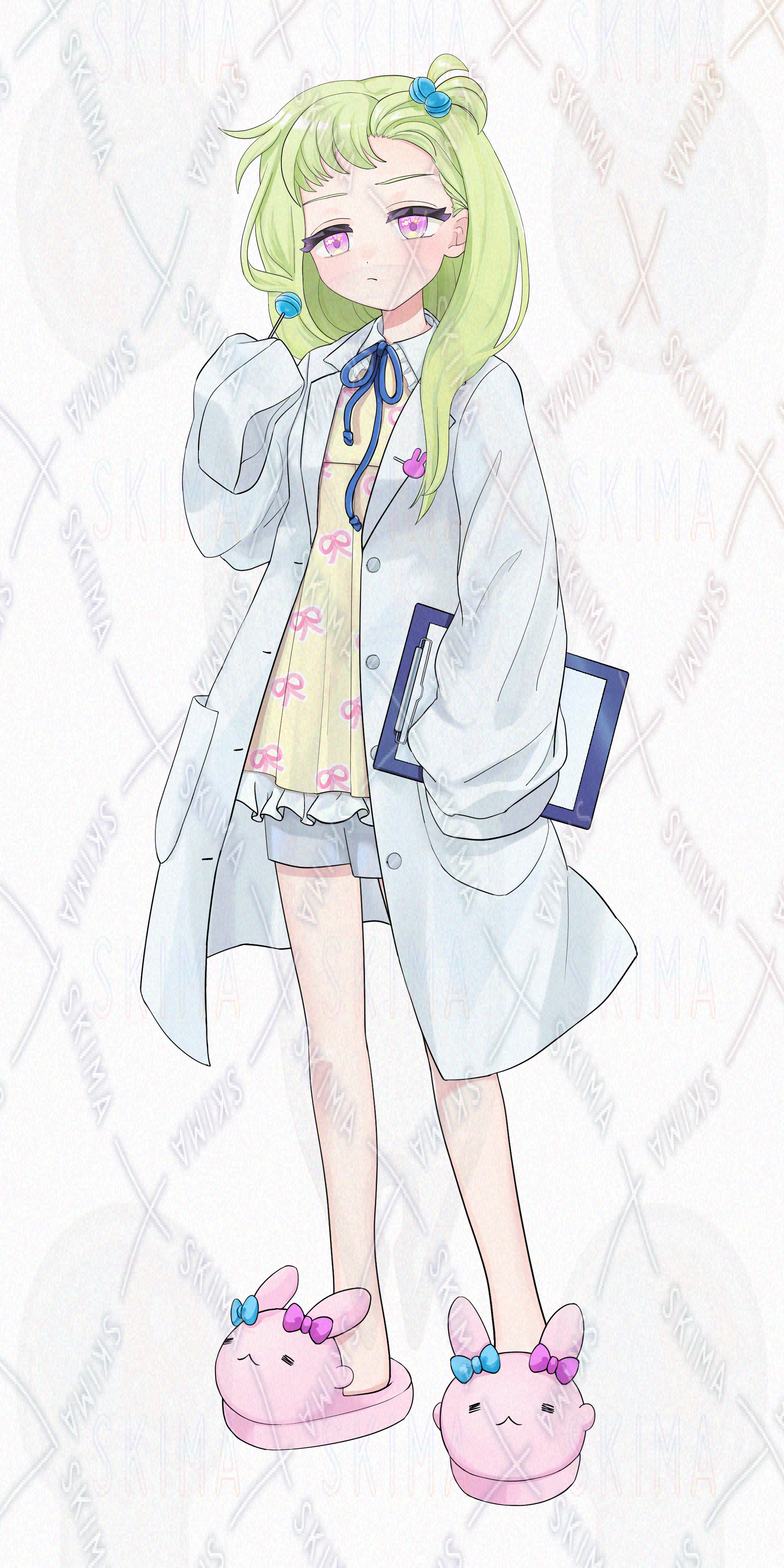 金髪/科学者/天才/タレ目/ロリ/少女/飴/キャンディ/ウサギ/うさぎ/スリッパ/おでこ/デコ出し/リボン/マイペース/バインダー/ピンク/水色/パステルカラー/フリル