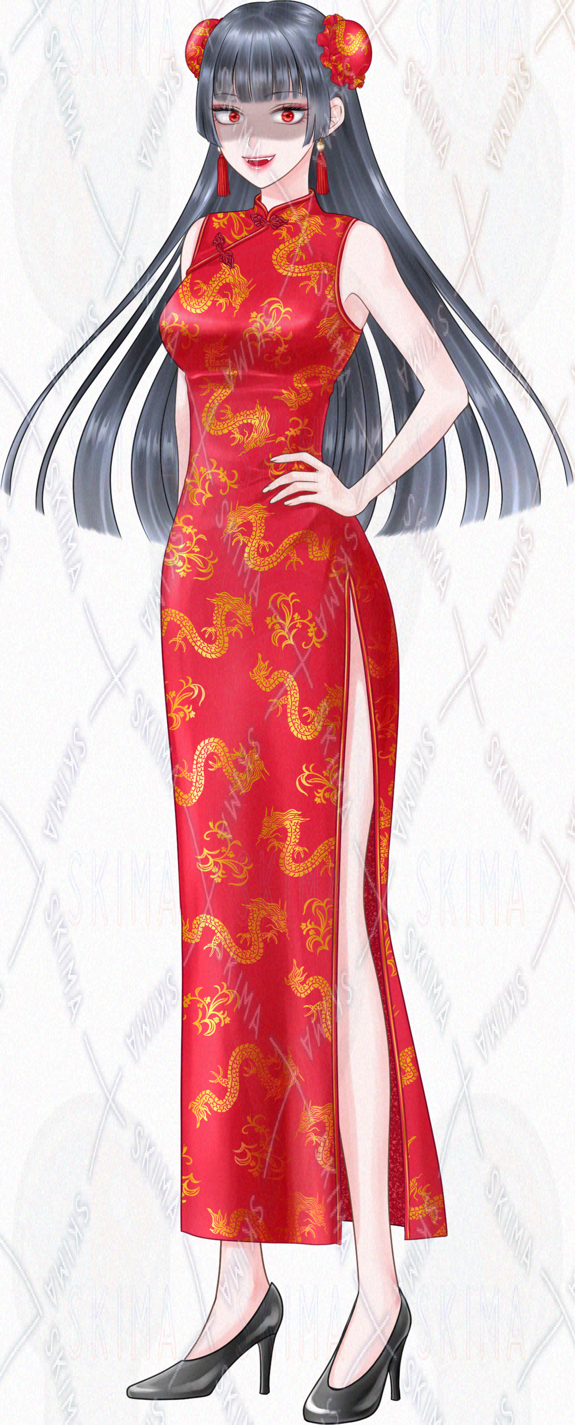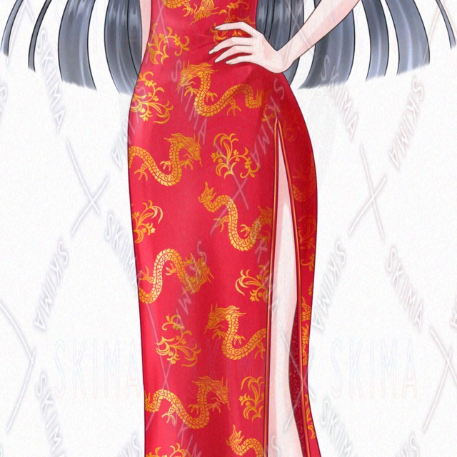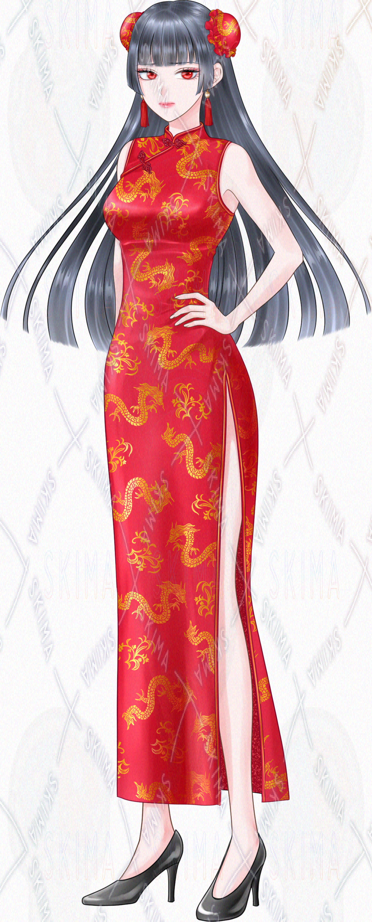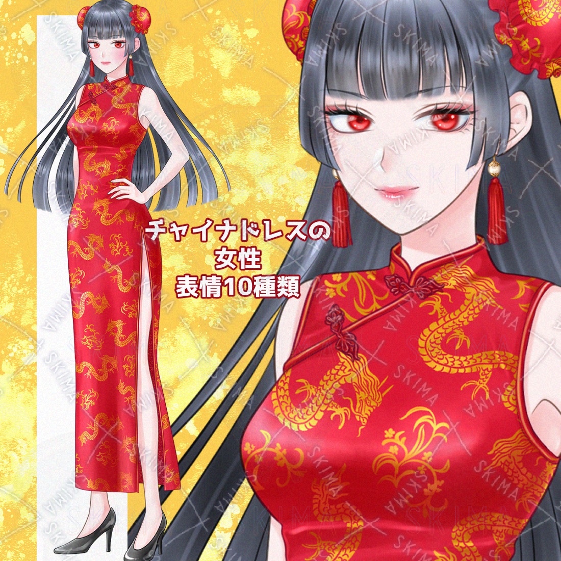 赤いチャイナドレスを着た女性の全身立ち絵です。
