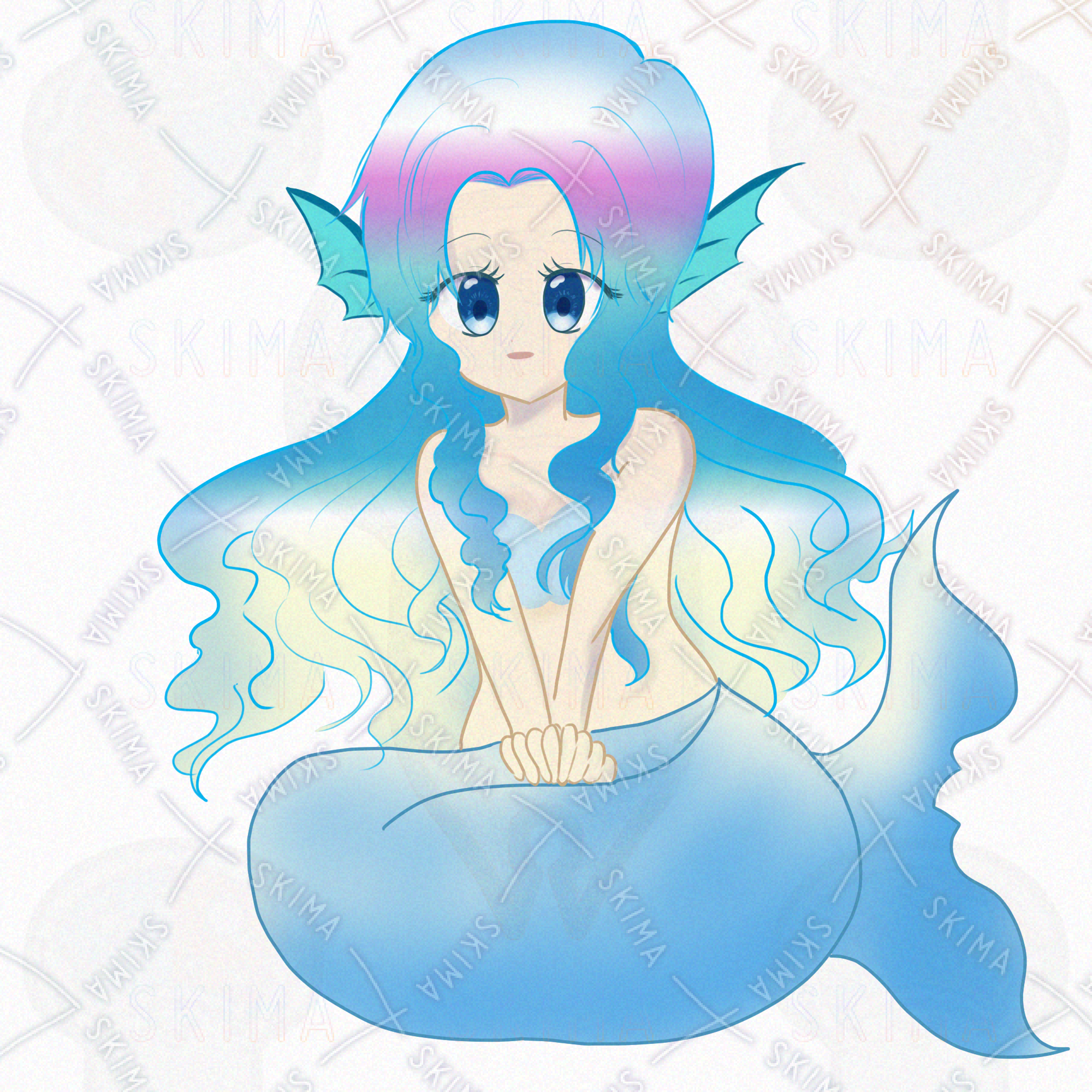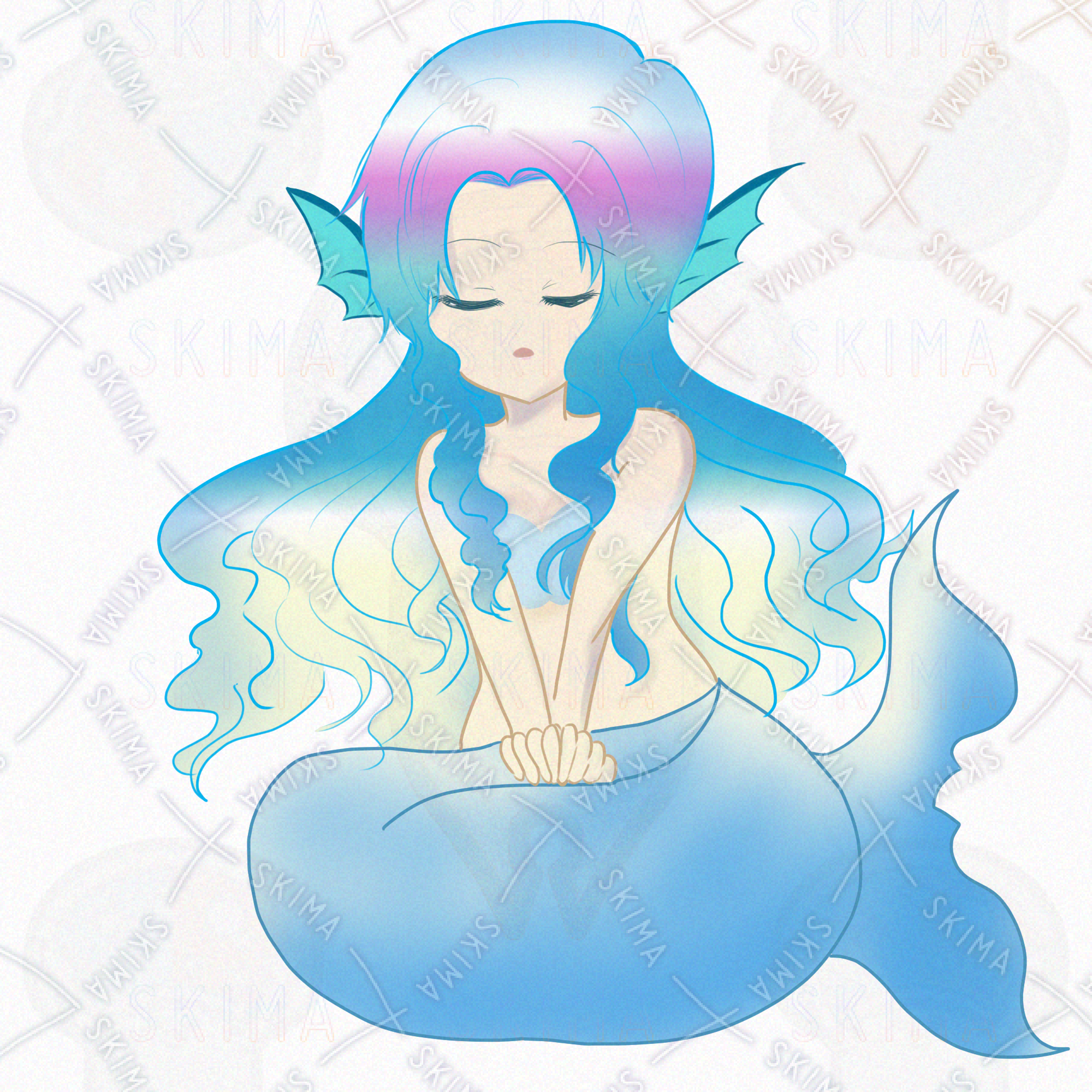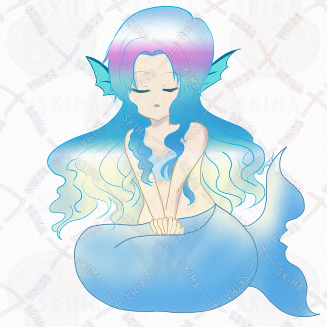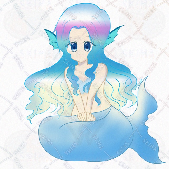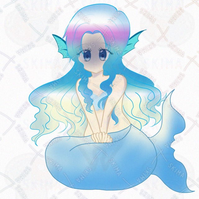 透明感のある水色の尾びれと、光を受けて輝くような髪の毛が魅力的。見ていると心が安らぐような、優しい雰囲気のイラストです。