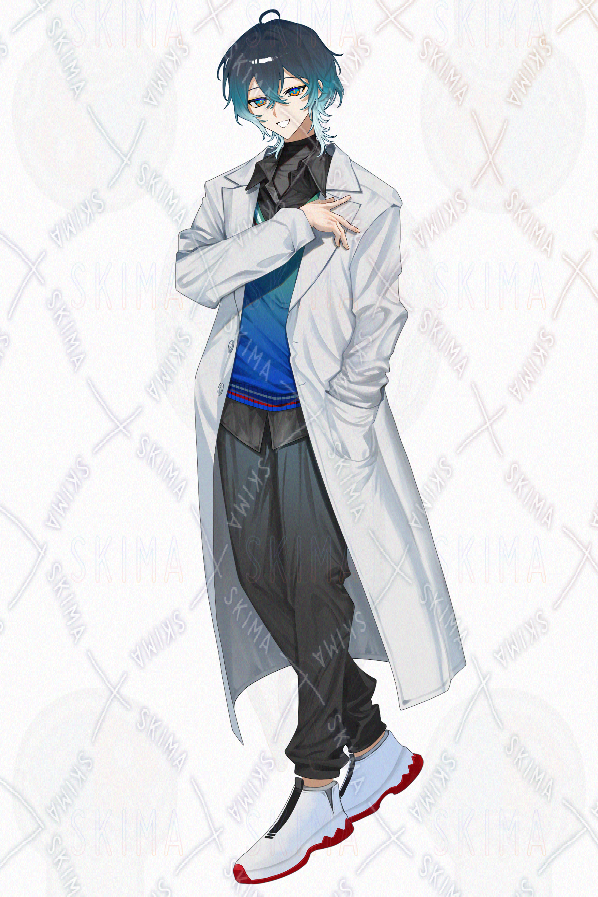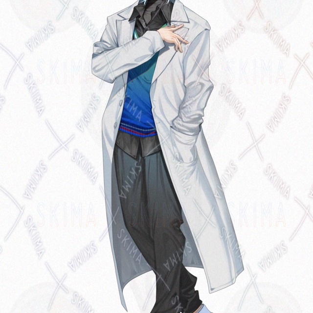 涼し気な顔立ちの、寒色系の私服の上に白衣を羽織った青年です。