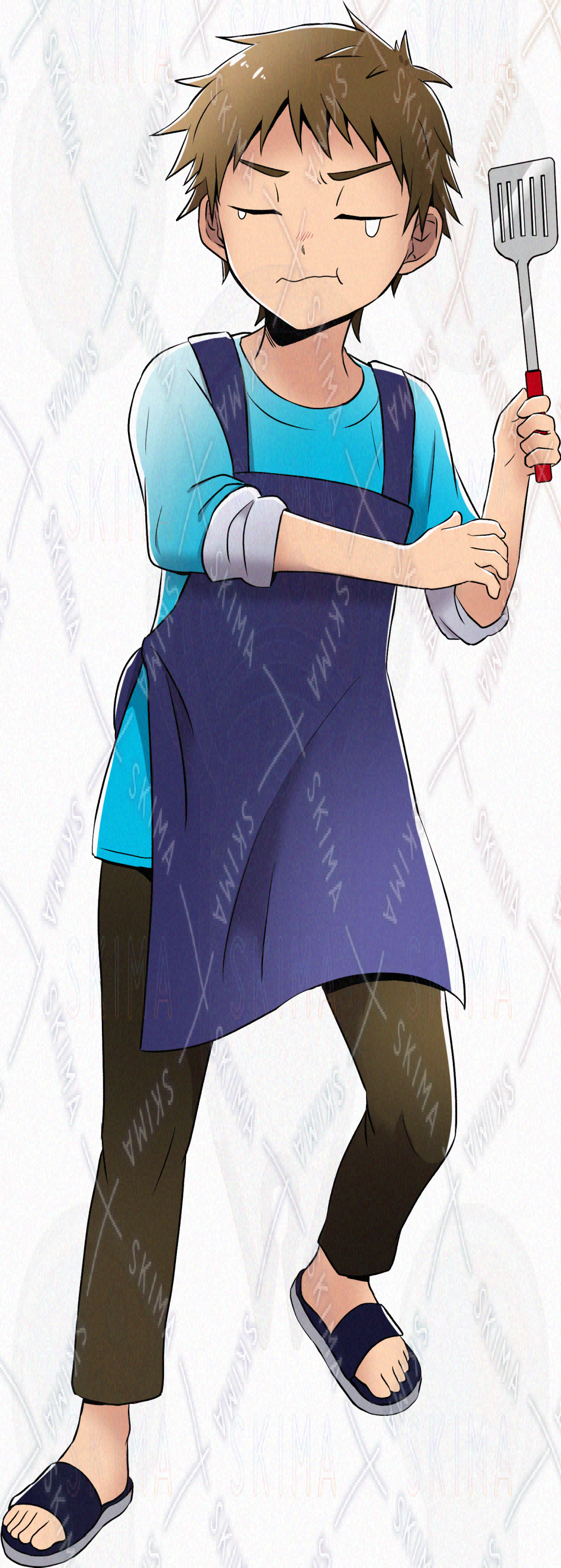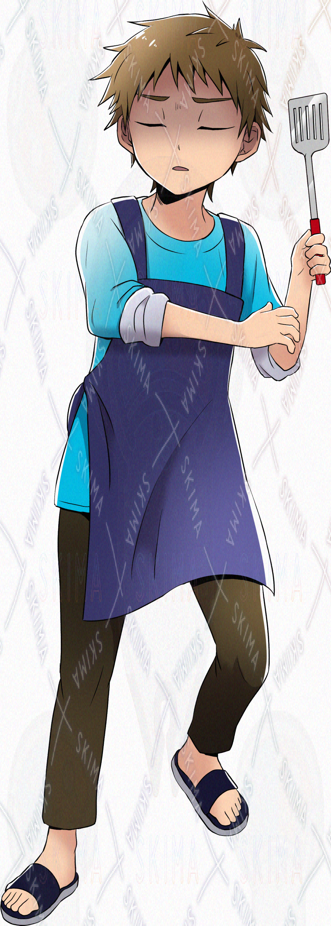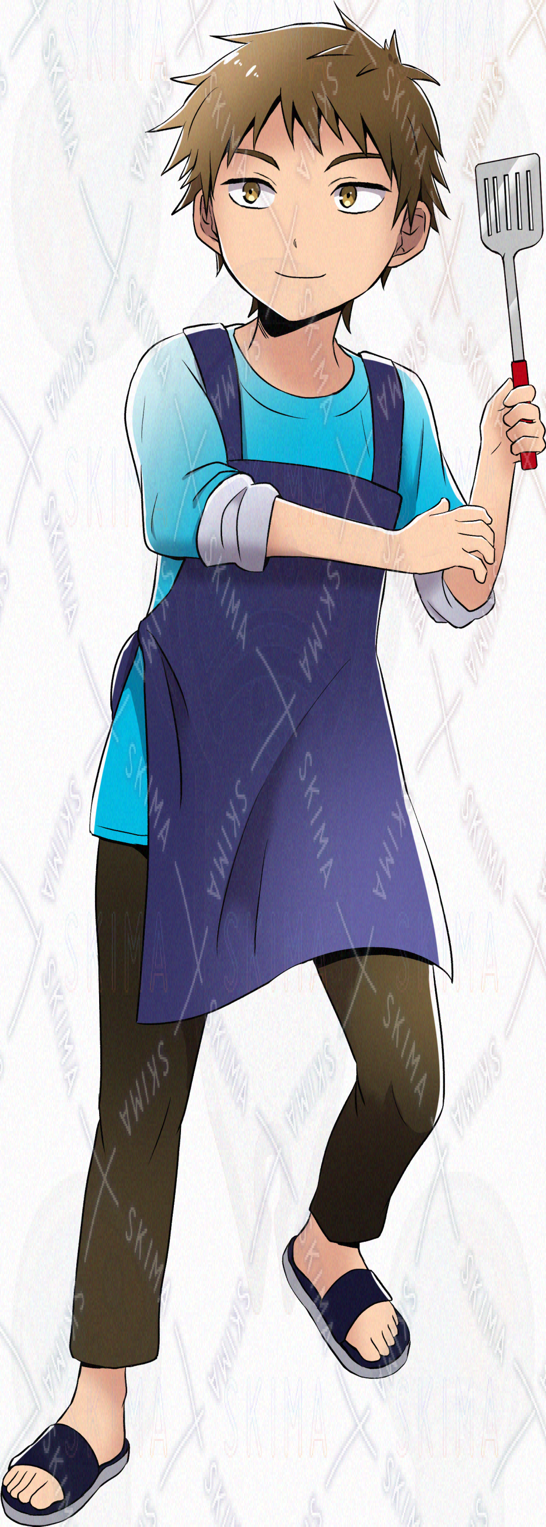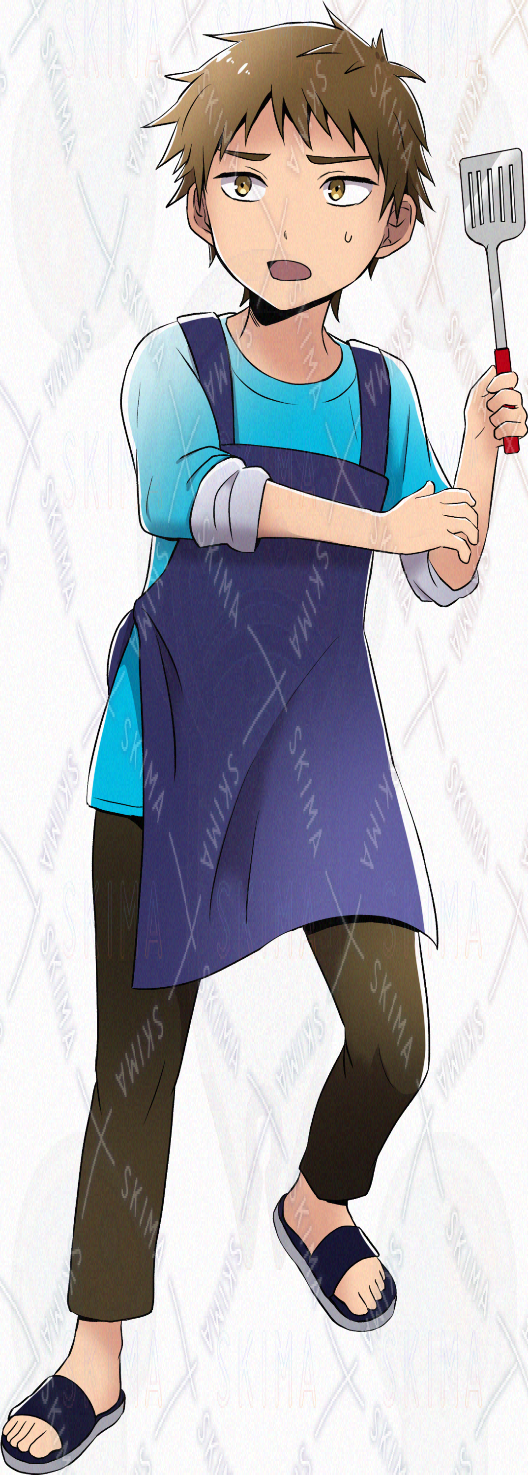 キーワード:男性/男の子/料理/クッキング/短髪/ショート/茶髪/エプロン/青/水色/寒色