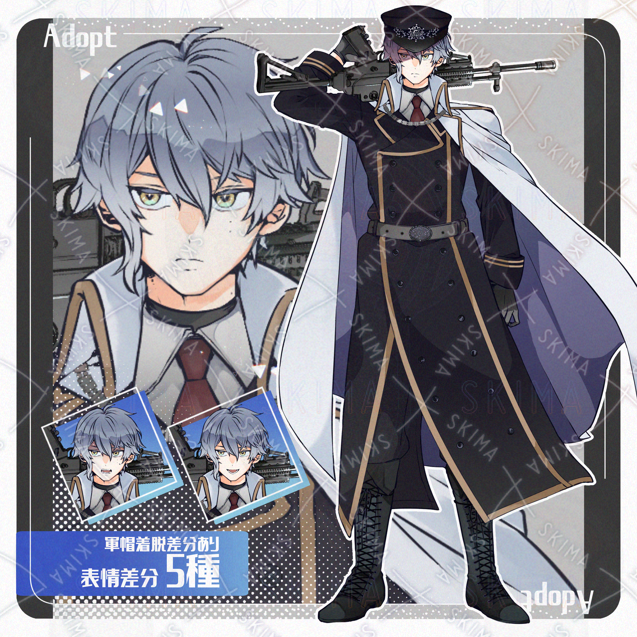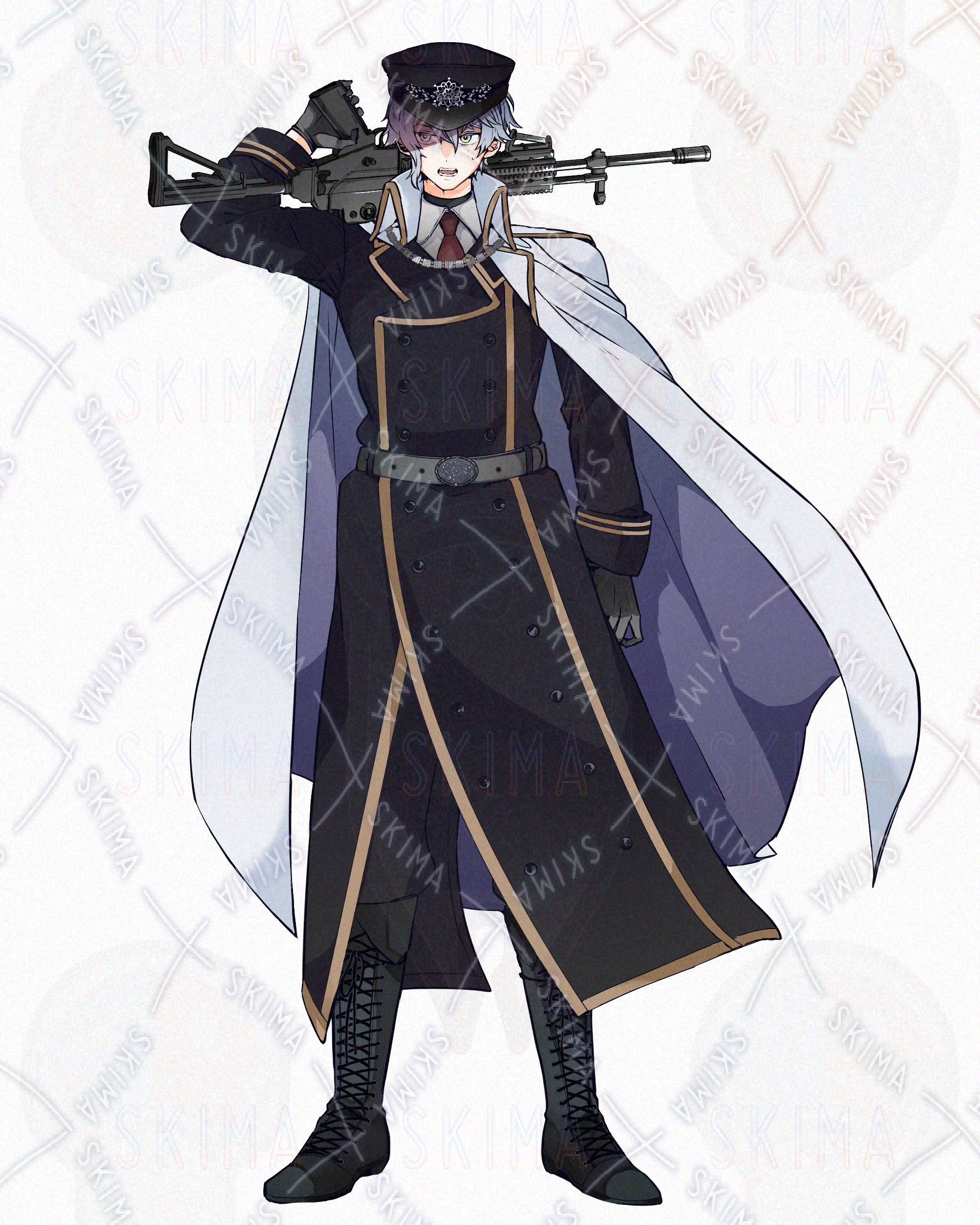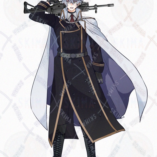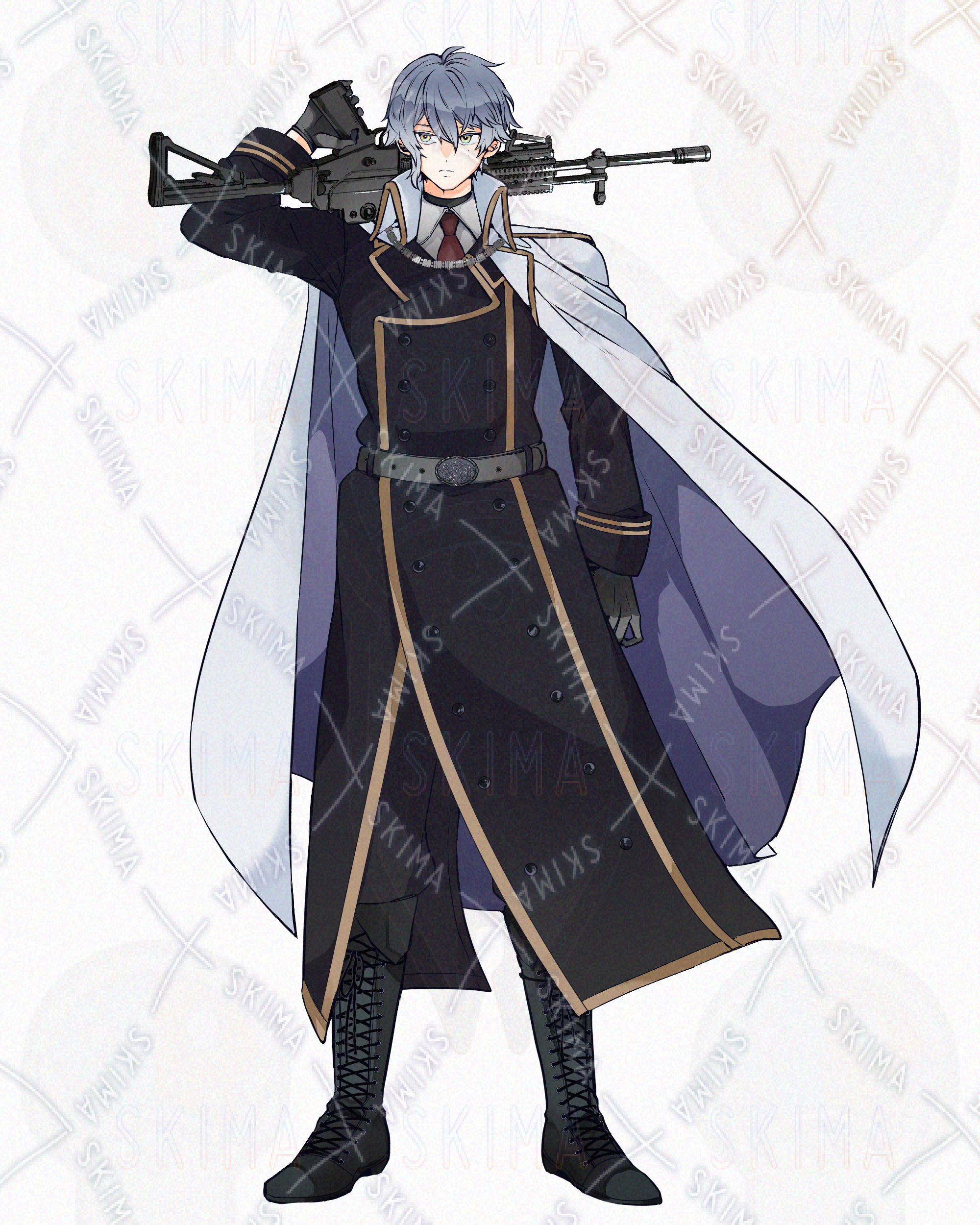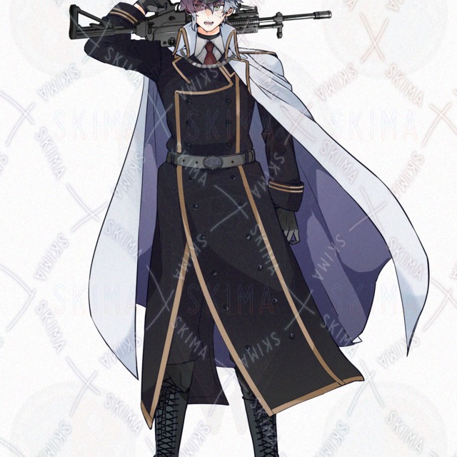 全身立ち絵 男性/青髪/ブルーグレー/金目/銃/アサルトライフル/軍服/マント/ほくろ