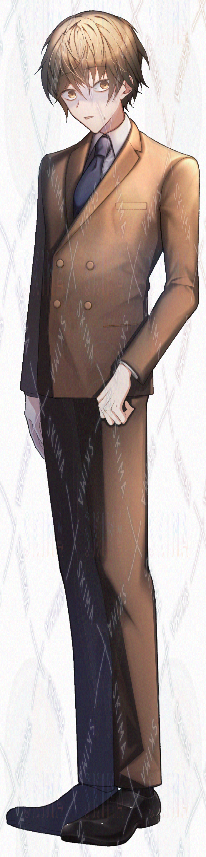 男/男性/男子/男の子/少年/青年/お兄さん/ダブルスーツ/ブラウンスーツ/白シャツ/ネクタイ/革靴/制服/正装/フォーマル/現代/短髪/ショートヘア/茶髪/茶目/茶眼/つり目/吊り目/色白