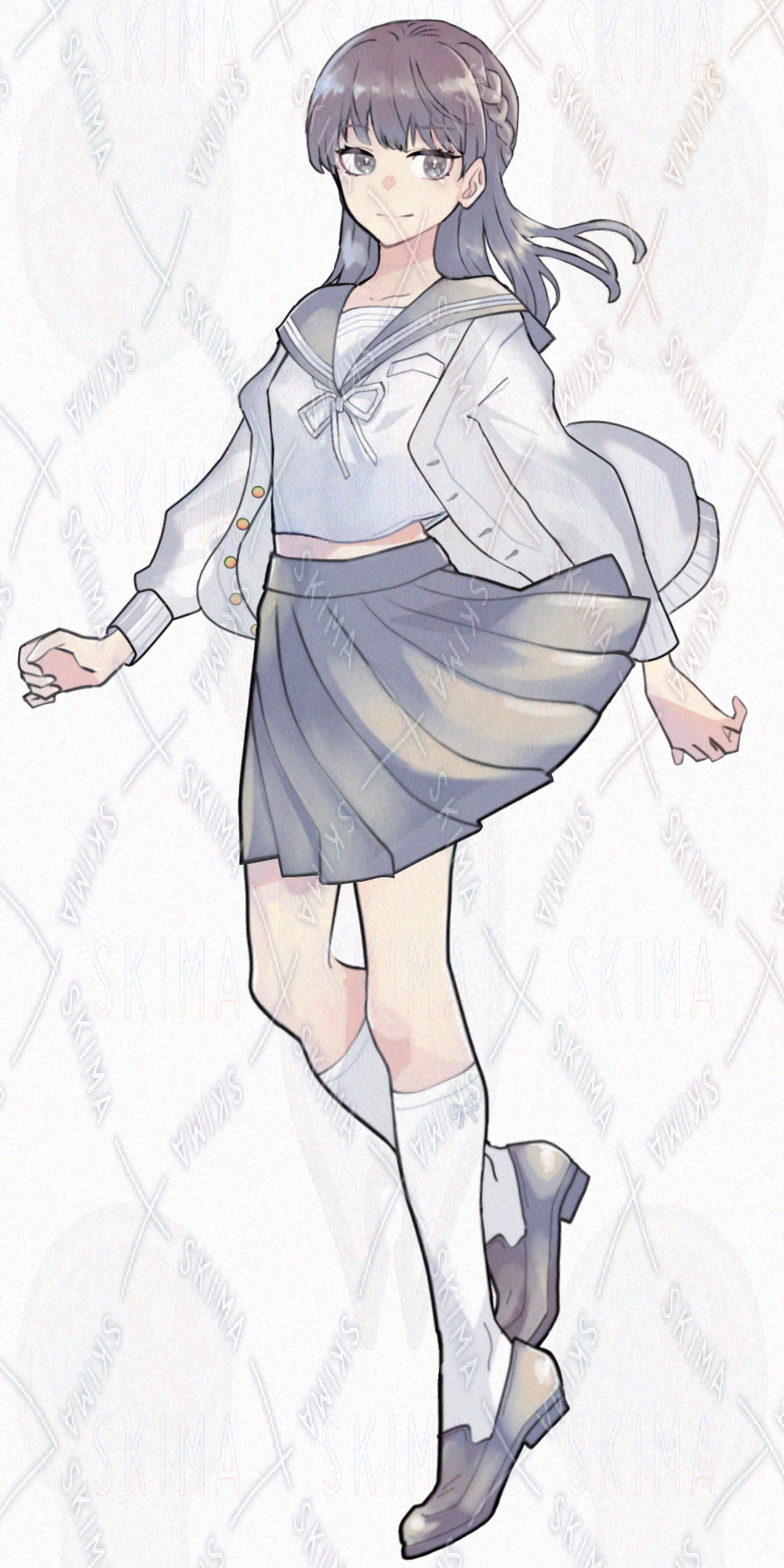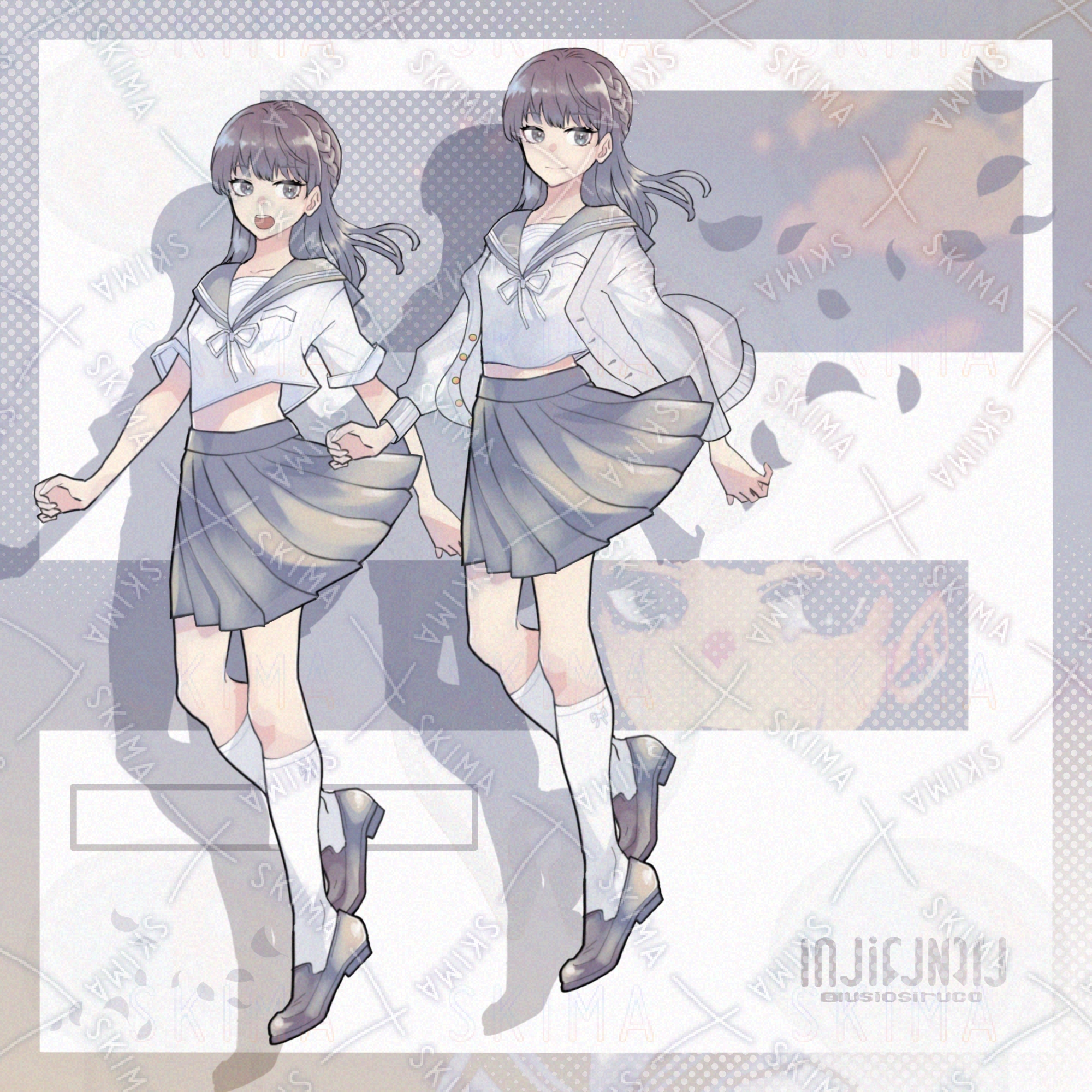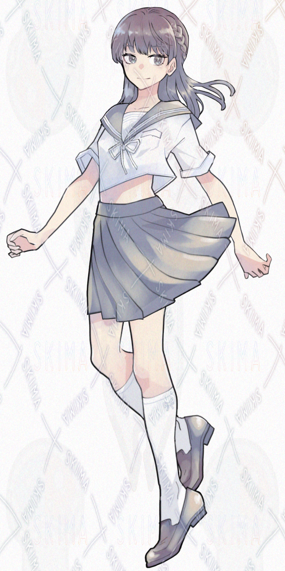 夏服のセーラー服を着た、三つ編みハーフアップの女の子です。