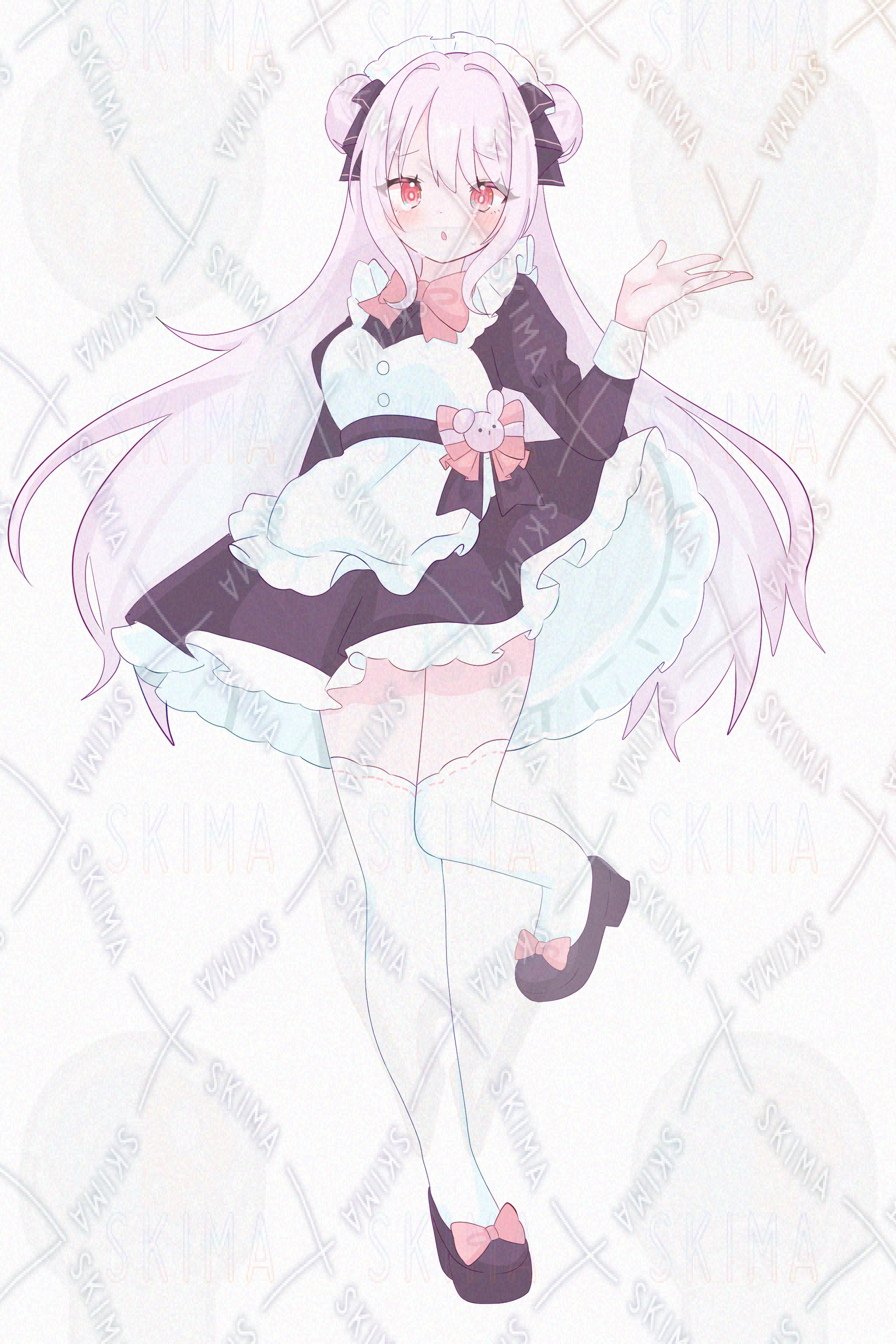 ピンク、赤、お団子、ハーフツインテール、メイド服、フリル、リボン、うさぎ、かわいい、女の子