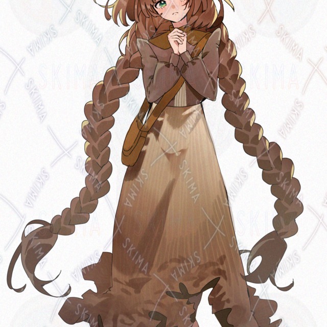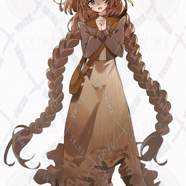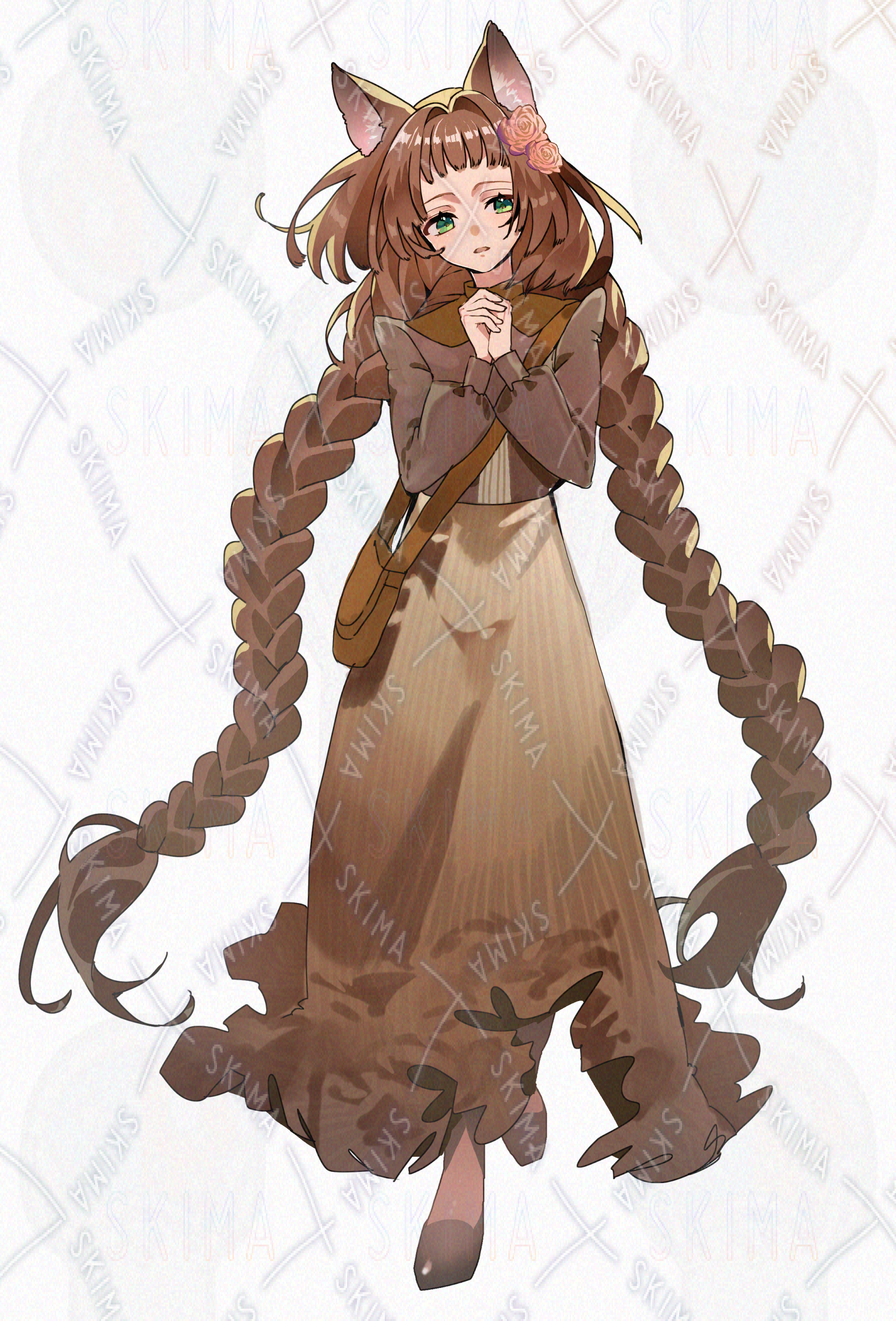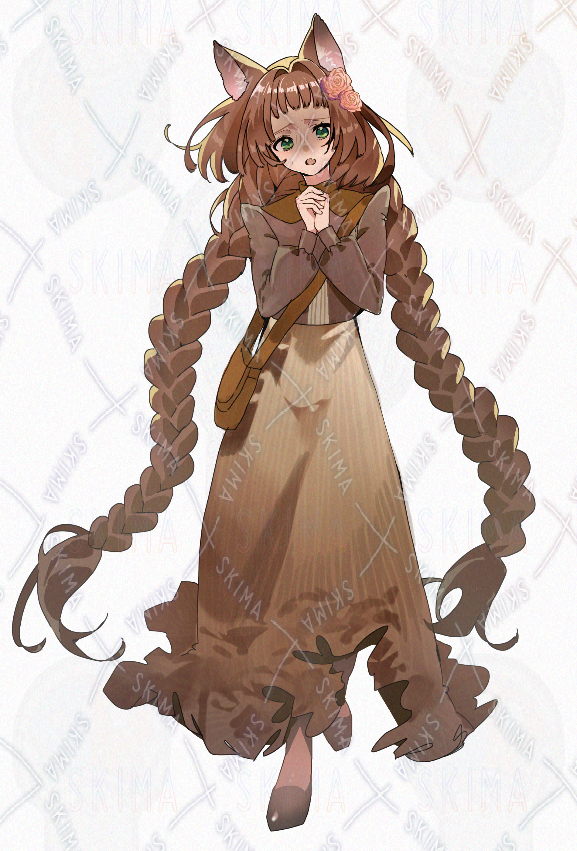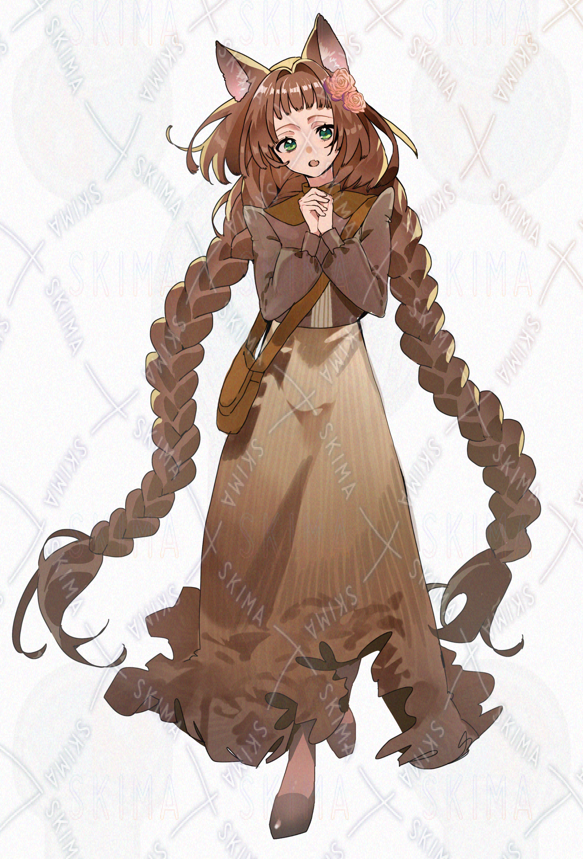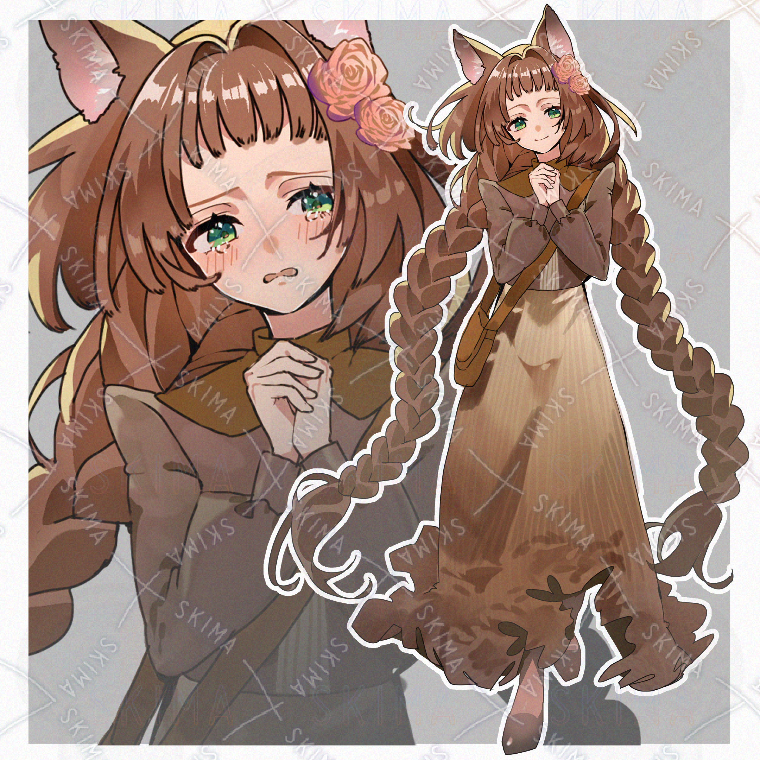 少女 猫耳 緑目 茶髪 三つ編み 花 バラ 立ち絵 全身