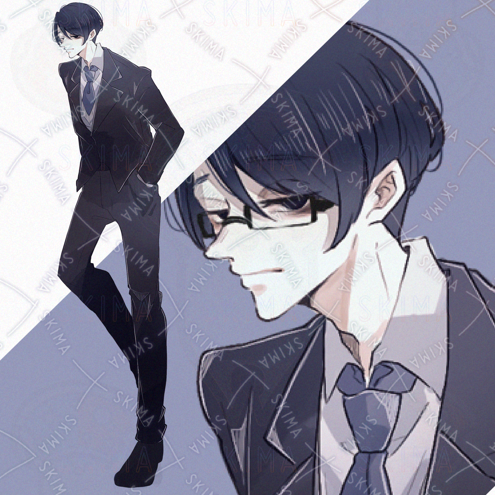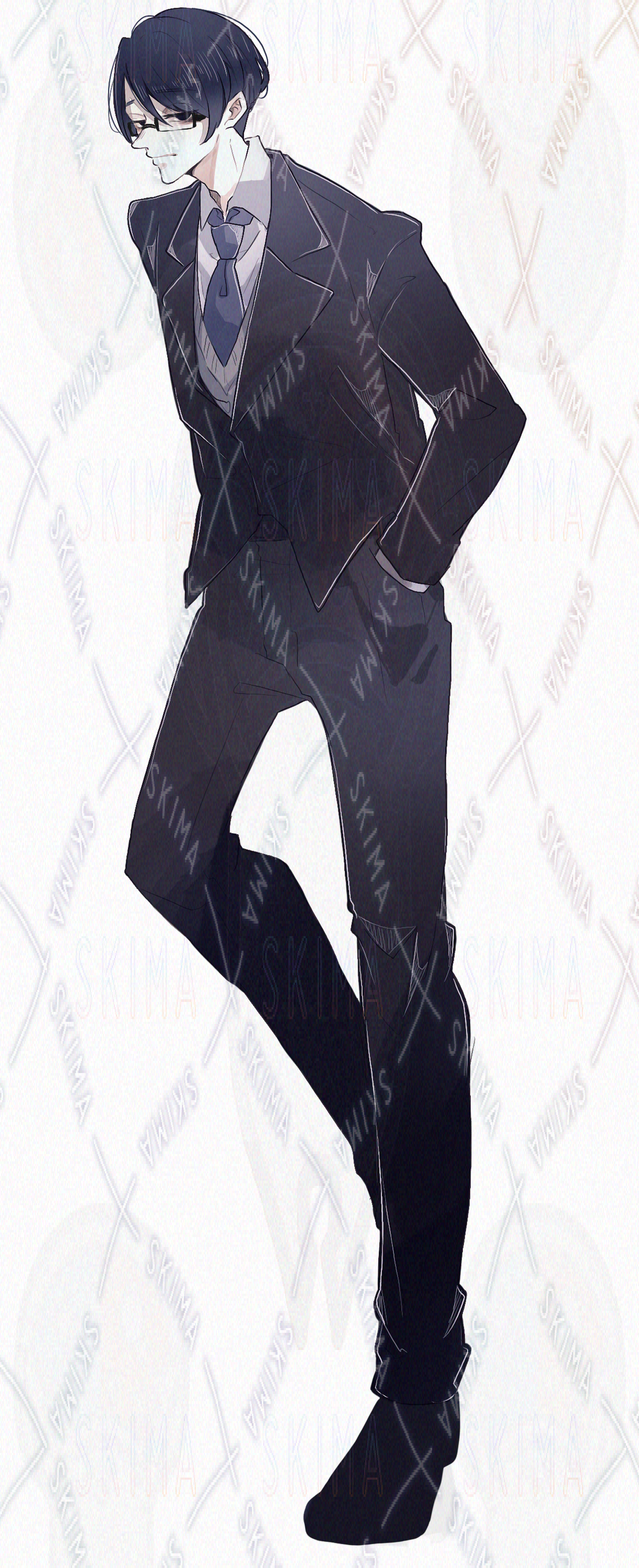 スーツ/サラリーマン/黒髪/眼鏡/黒/青/猫背/下がり眉/男/男性
