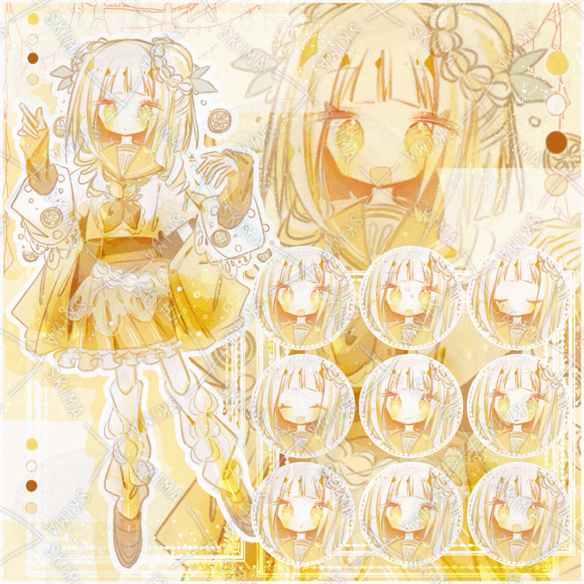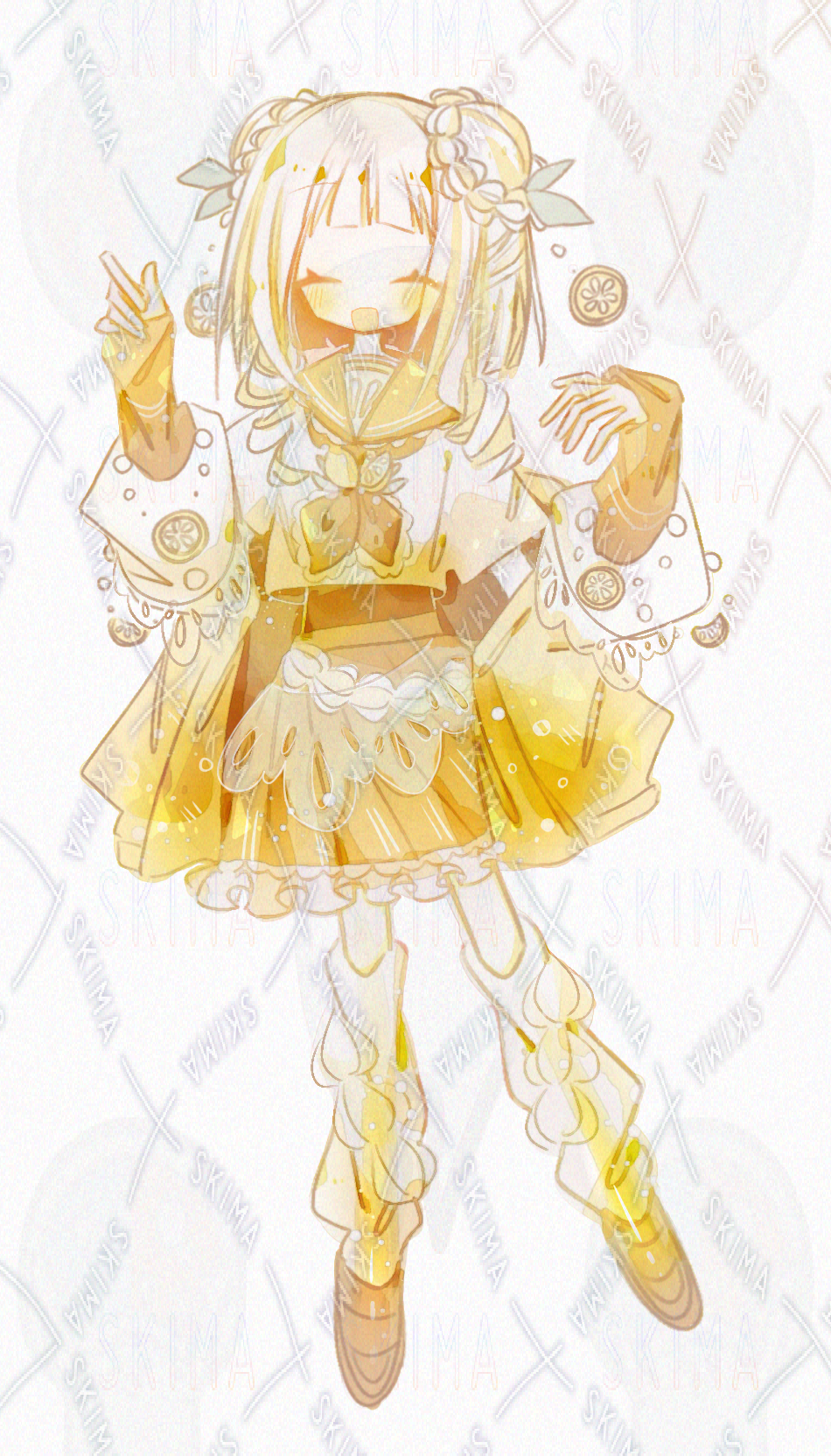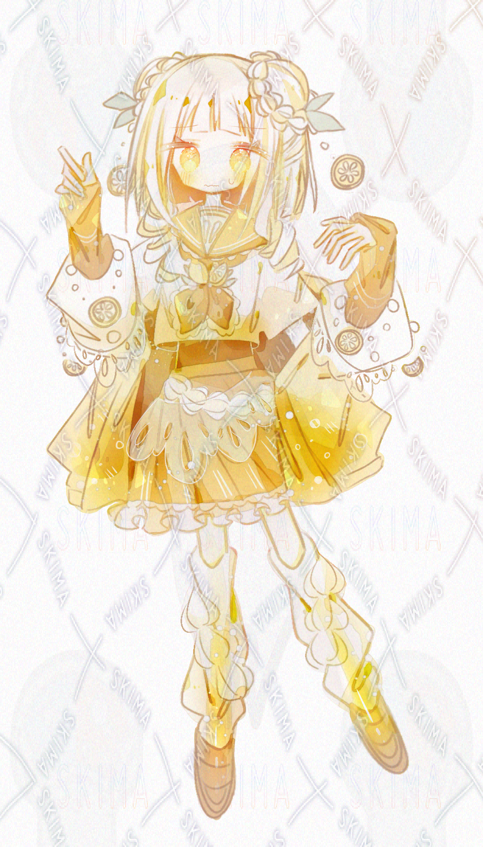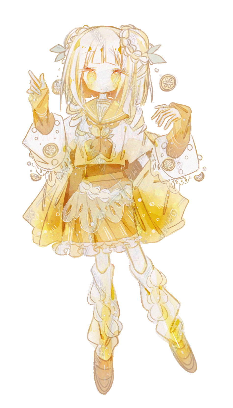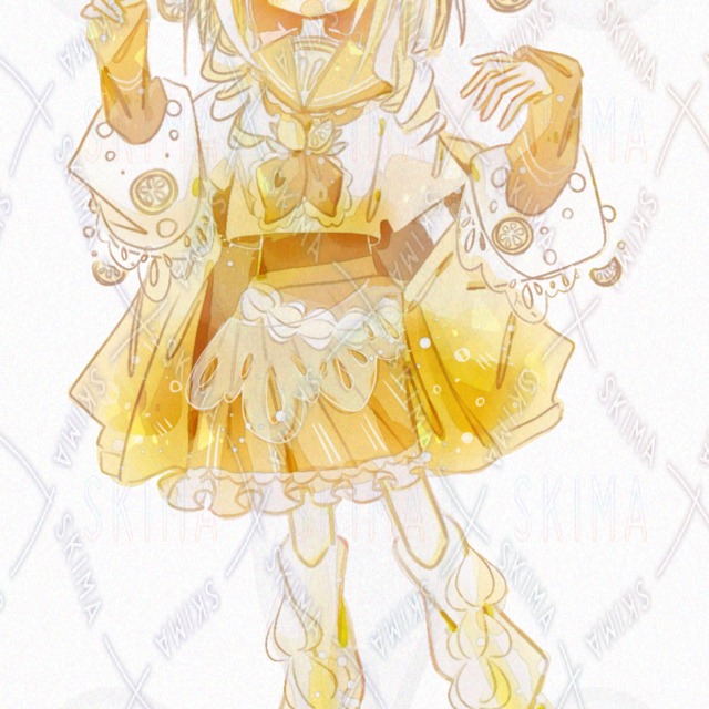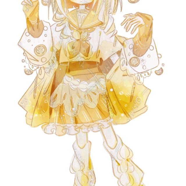 少女/女の子/女性/ガール/セーラー服風/フリルスカート/神秘的/ロリータ/ひらひら/かわいい/イラスト/ファンタジー/表情差分あり/綺麗/ふわふわ/レモンソーダ風/黄色/イエロー/リボン/キラキラ/ホワイト/フルーツ/お姫様/人形風/白色/お嬢様風/鮮やかな色/果物モチーフ/キラキラ目/高校生/中学生/ドリンクモチーフ