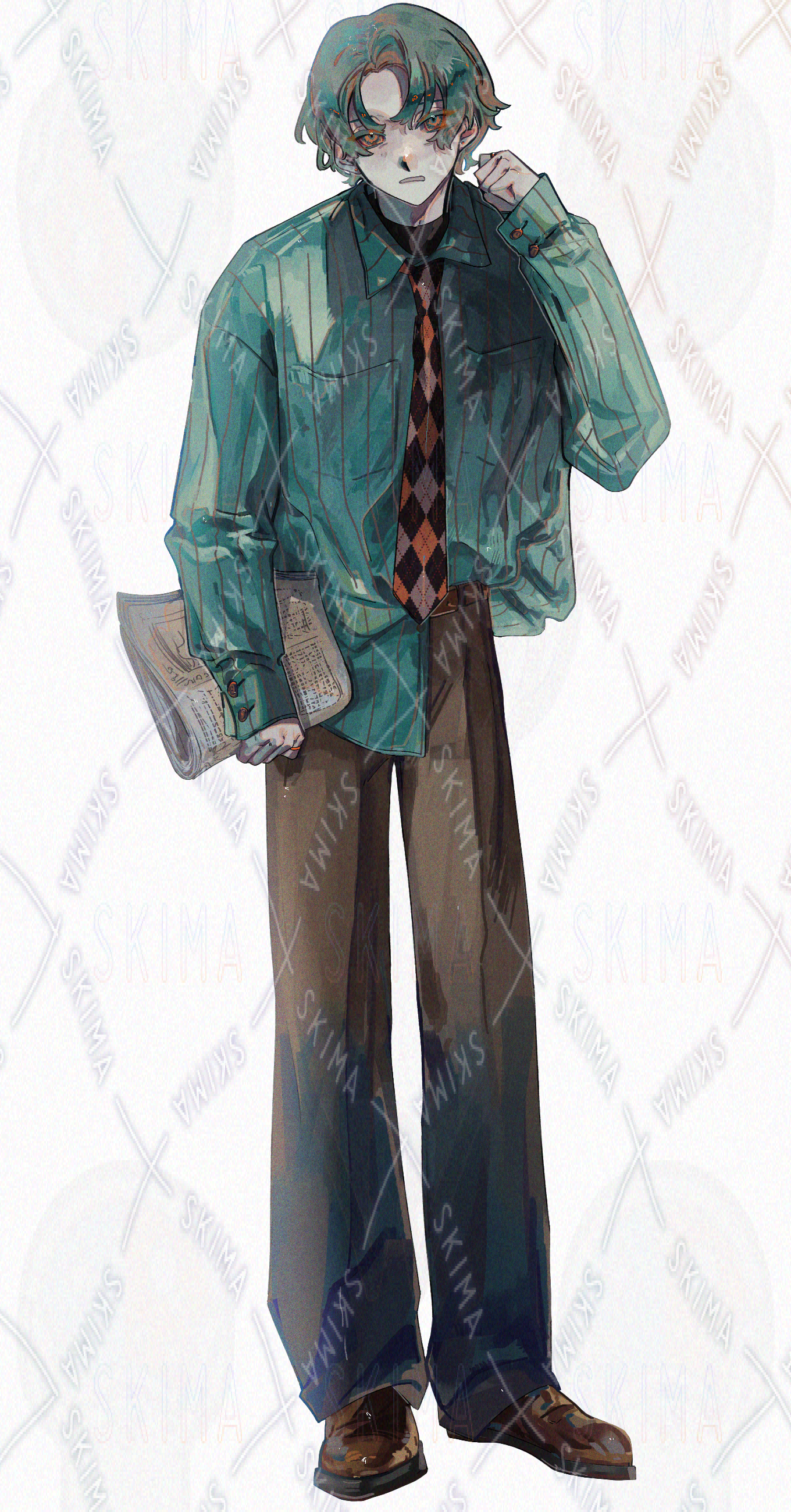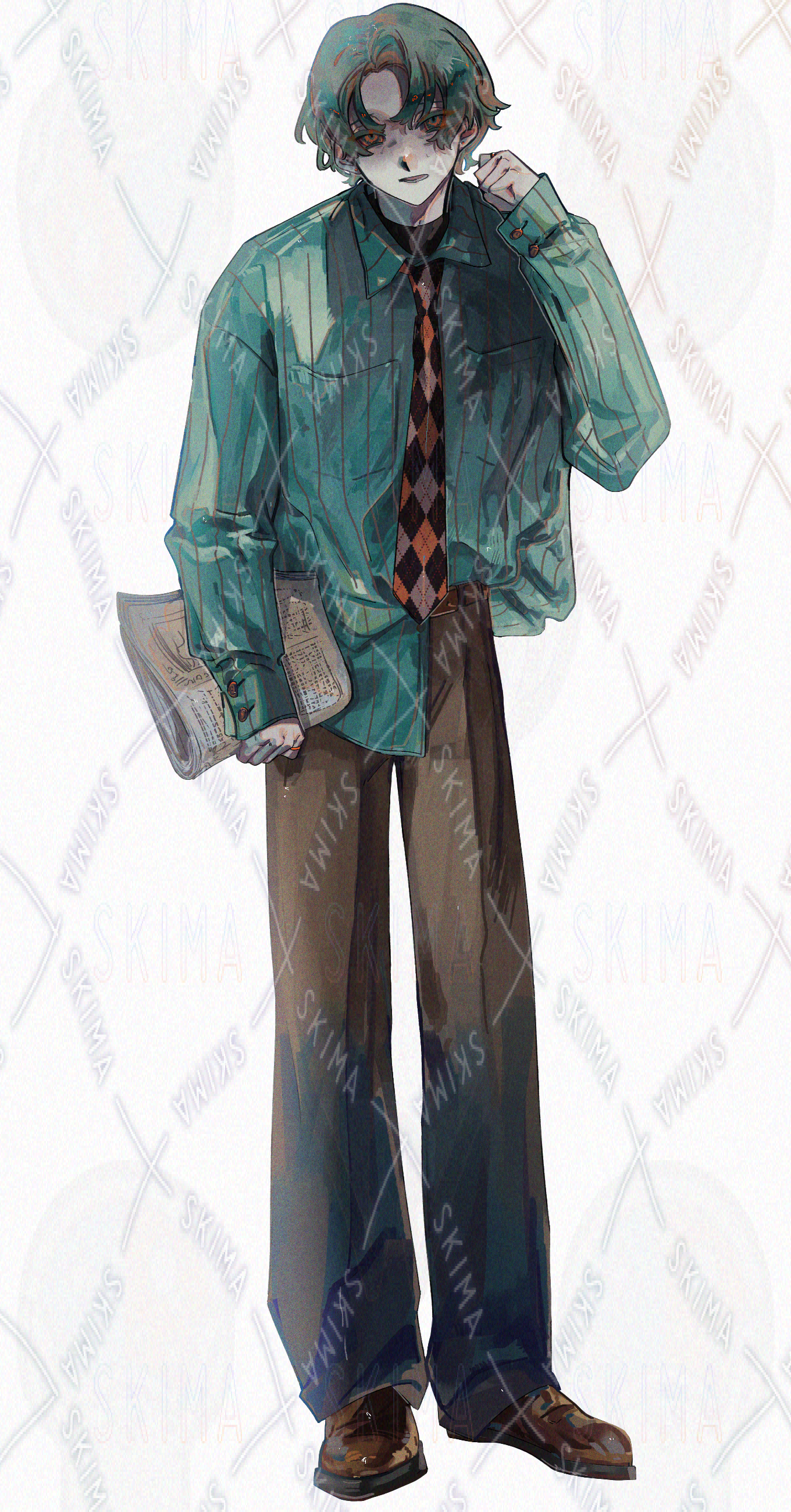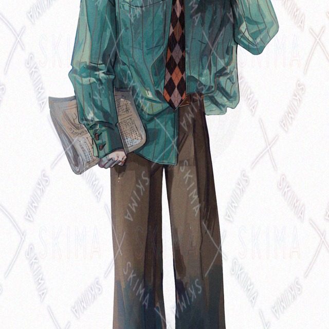 緑髪にオーバーサイズシャツの男性。会社員、探偵や作家など。
