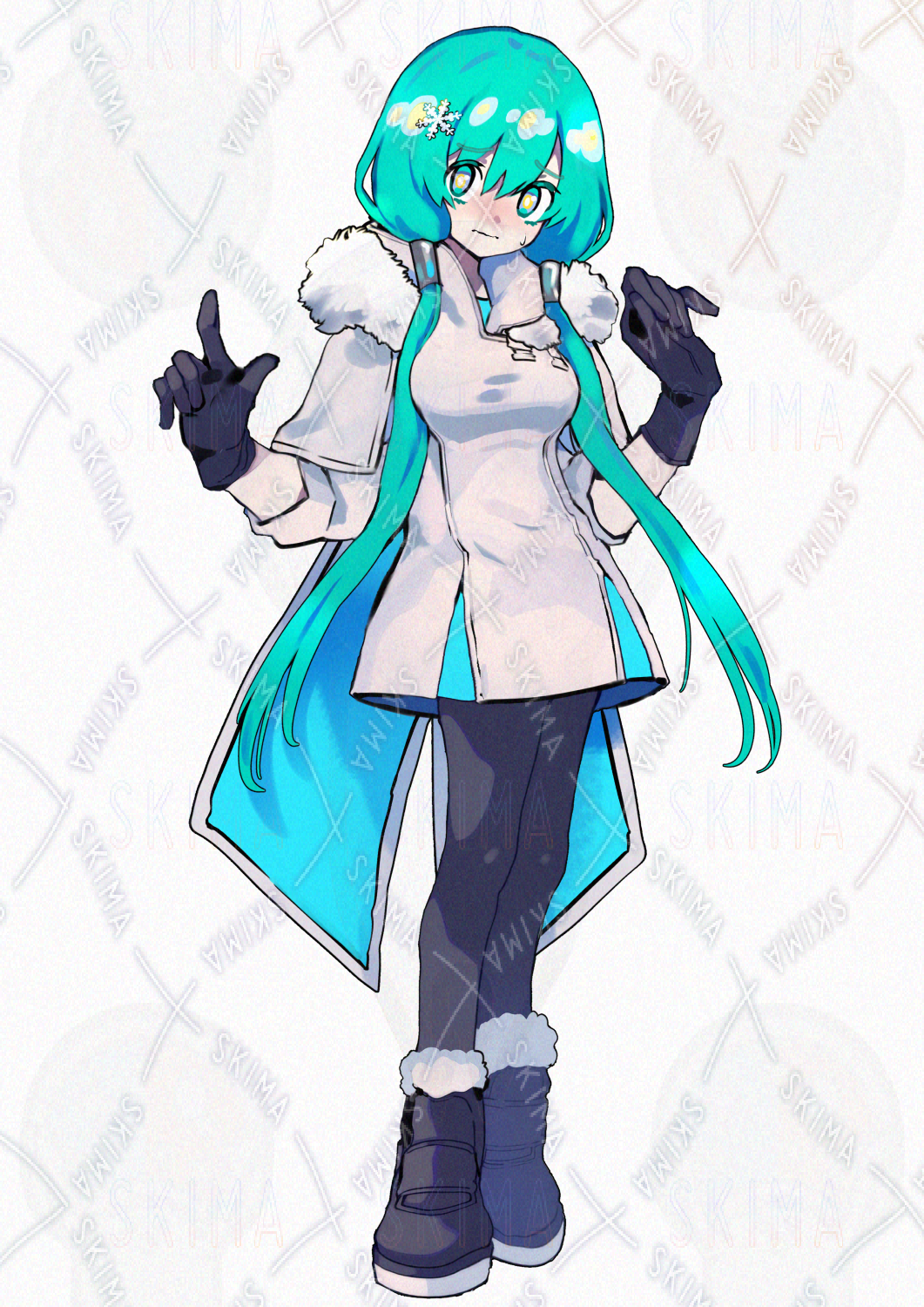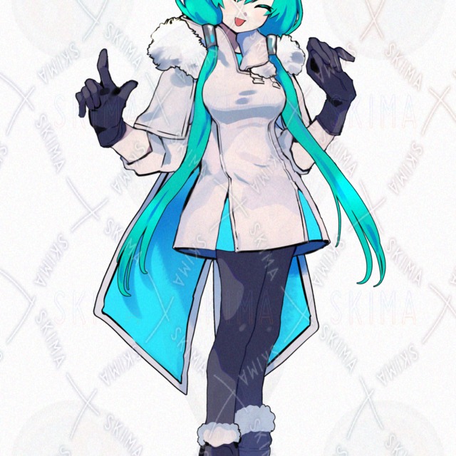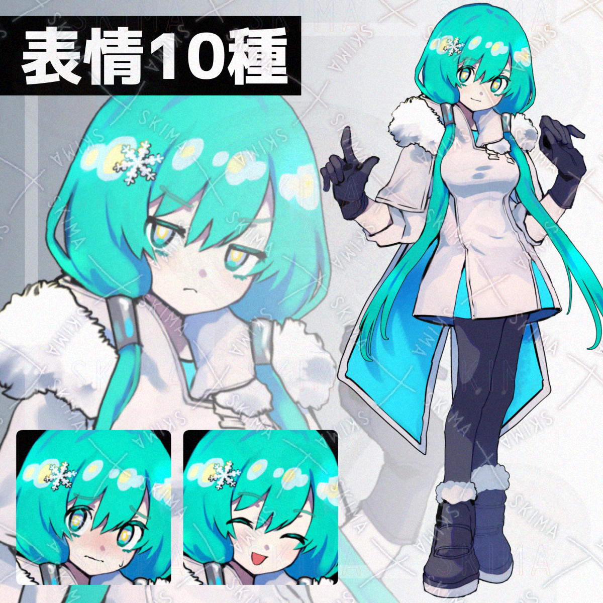 白いファー付きコート(マント)を着て、緑髪おさげに氷の結晶の髪飾りを付けている女の子です。