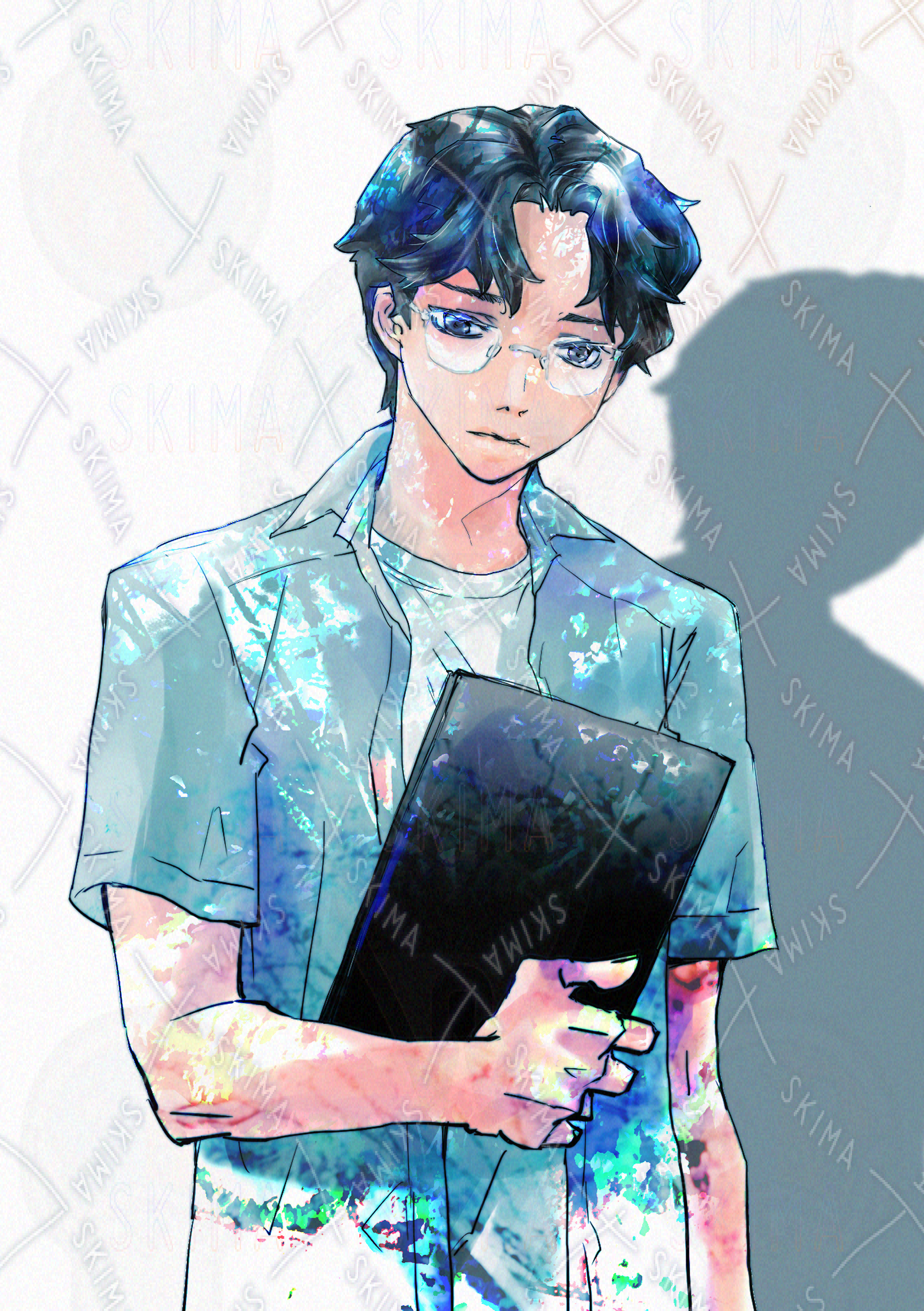 木陰でノートパソコンを手に立っている眼鏡男子大学生のイラストです。