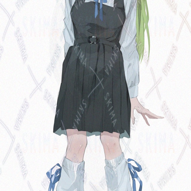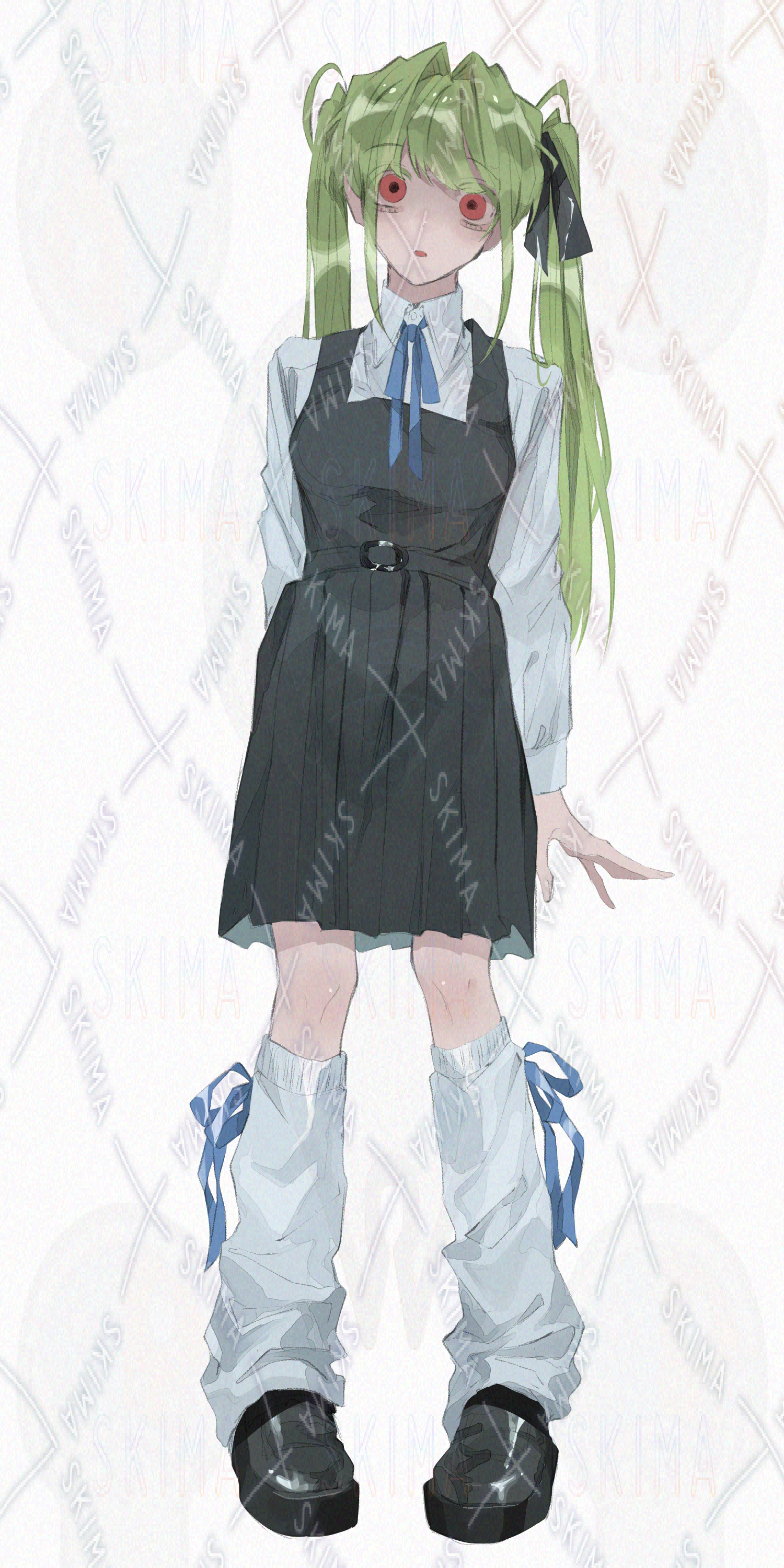 女の子/女子高生/ツインテール/緑髪/制服/ジャンパースカート/ルーズソックス/リボン/闇