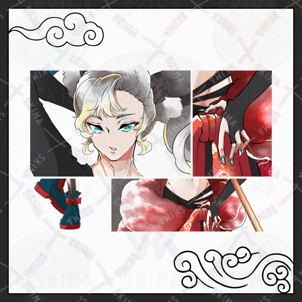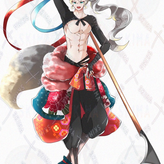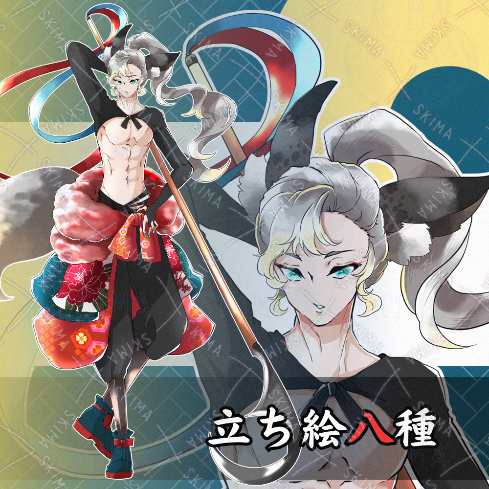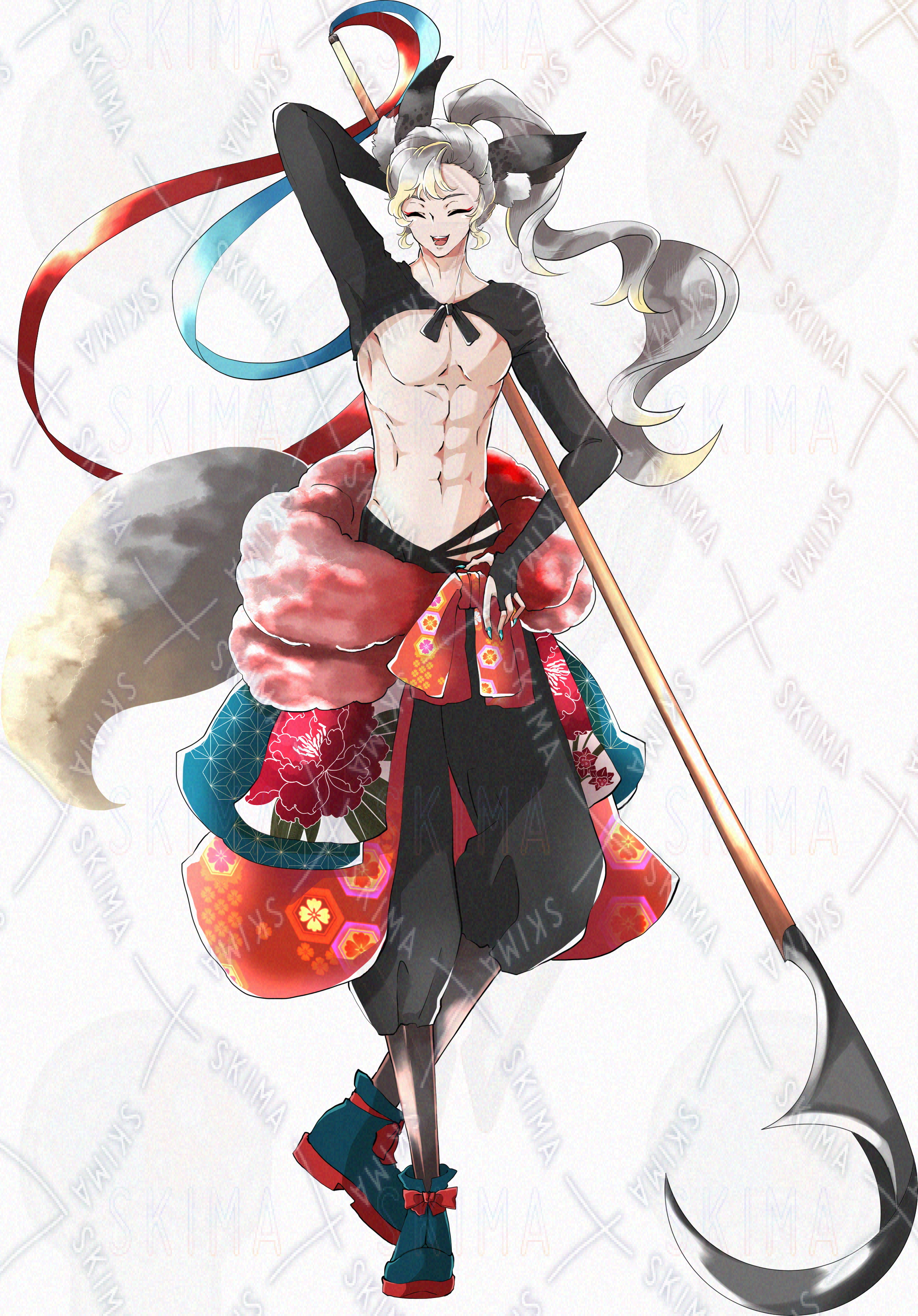 男性/銀髪/獣耳/狐耳/獣耳/獣人/武器/槍/鎌/和服/着物/赤/青/緑目/半裸/腹筋/戦国時代/長手甲