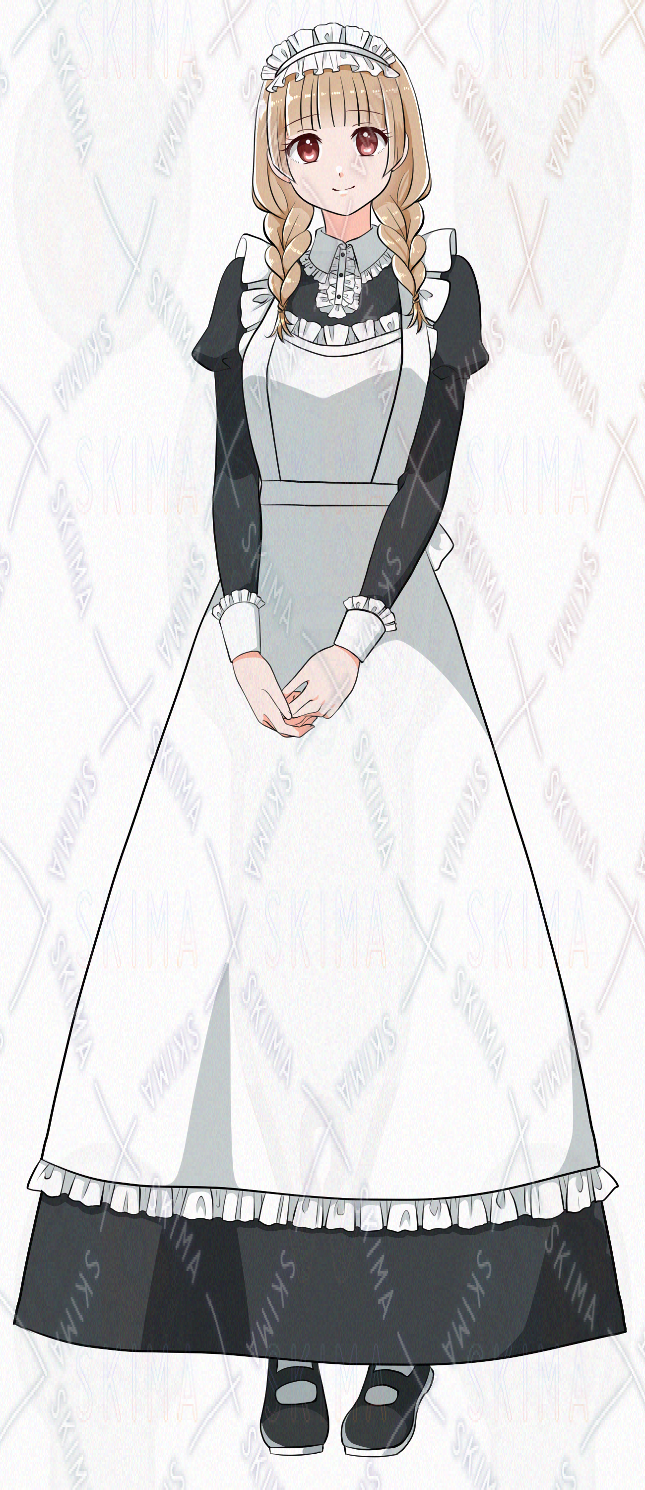 ロングスカート、白エプロン、三つ編み、おさげ、茶髪、ぱっつん
