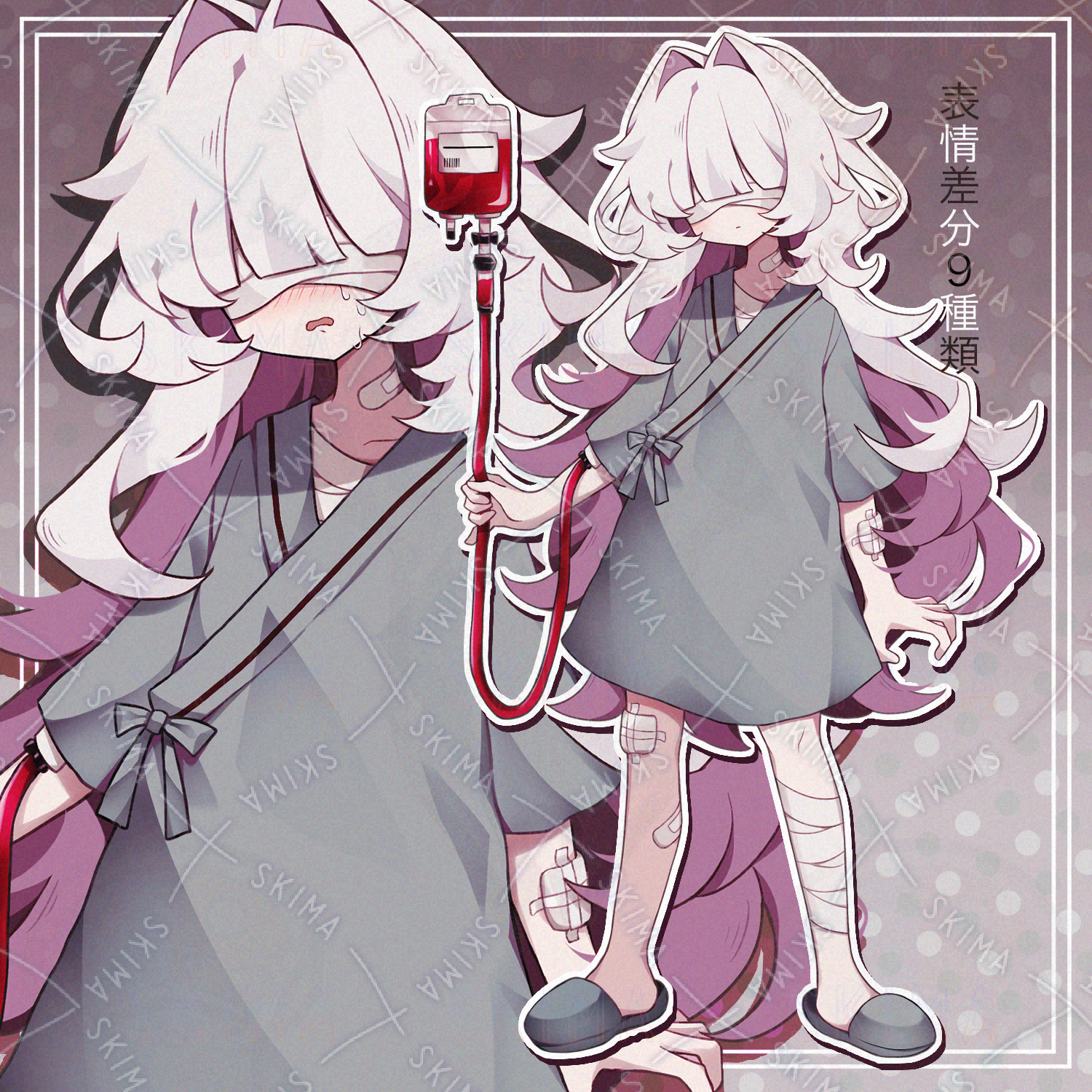 かわいい/女の子/美少女/中性的/メカクレ/白髪/隠れ目/患者衣/病院/入院/血液パック/包帯/絆創膏/スリッパ