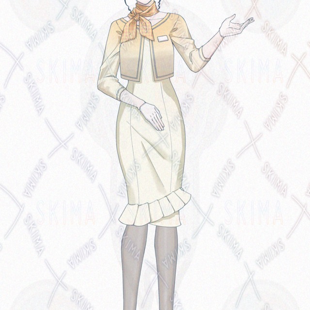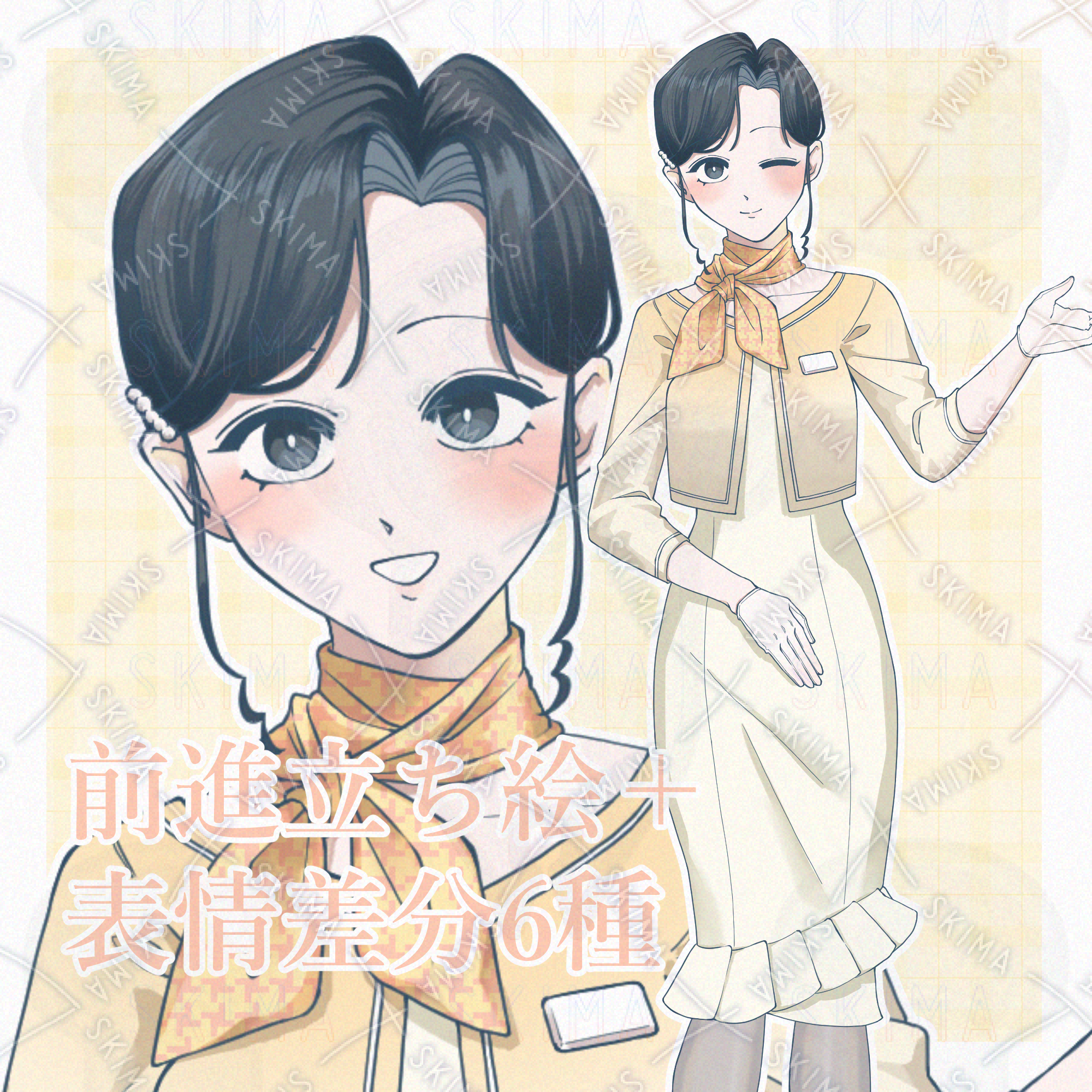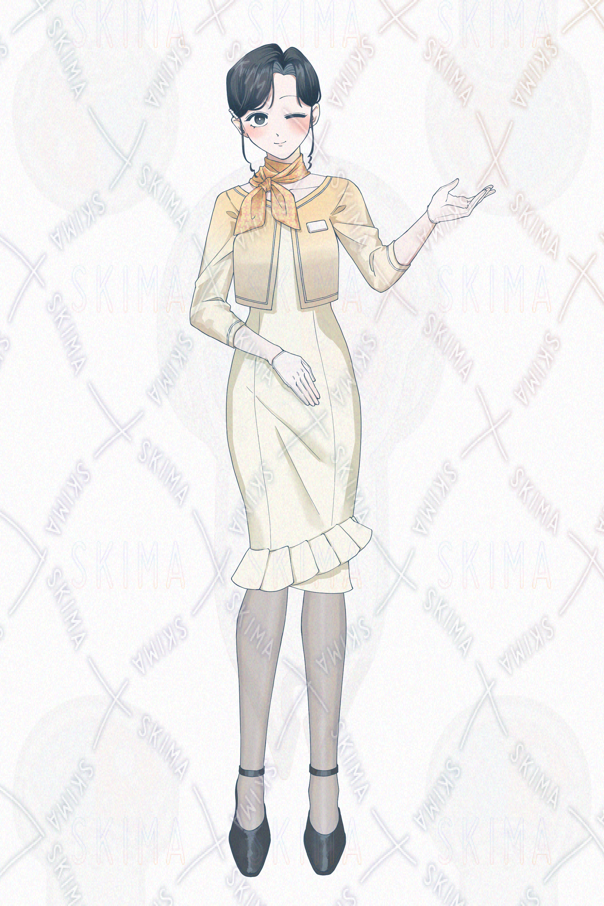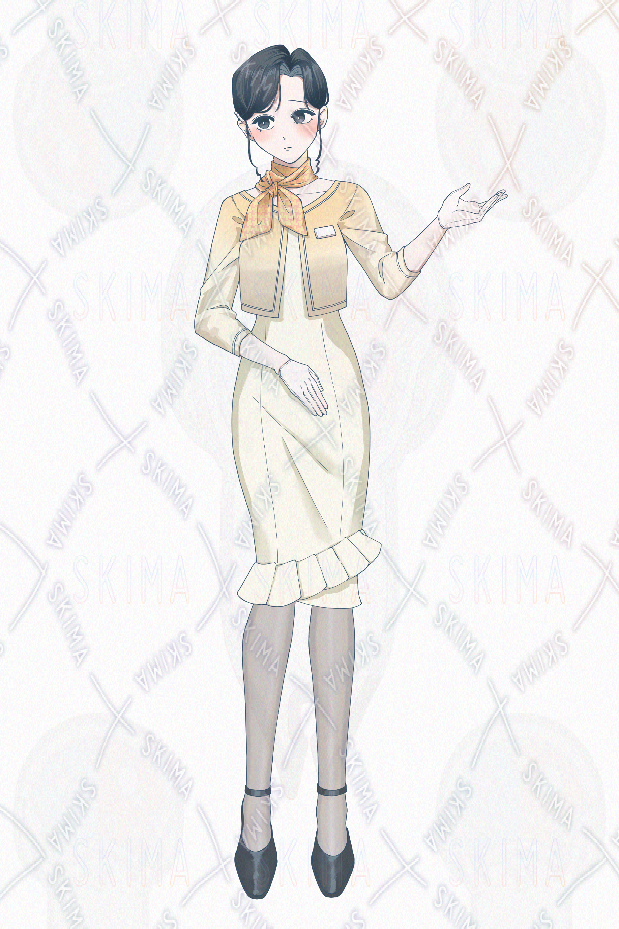 キャラクターデザイン/受付嬢/ひっつめ/黒髪/ワンピース/ボレロ/スカーフ/黄色/たまご色/オレンジ