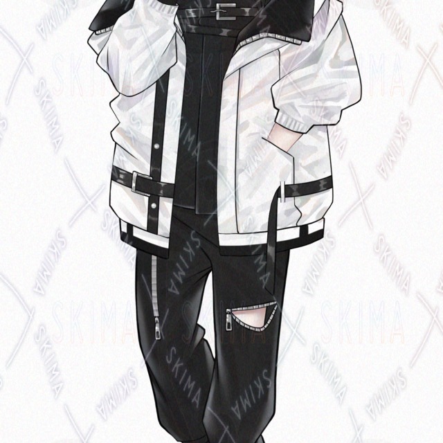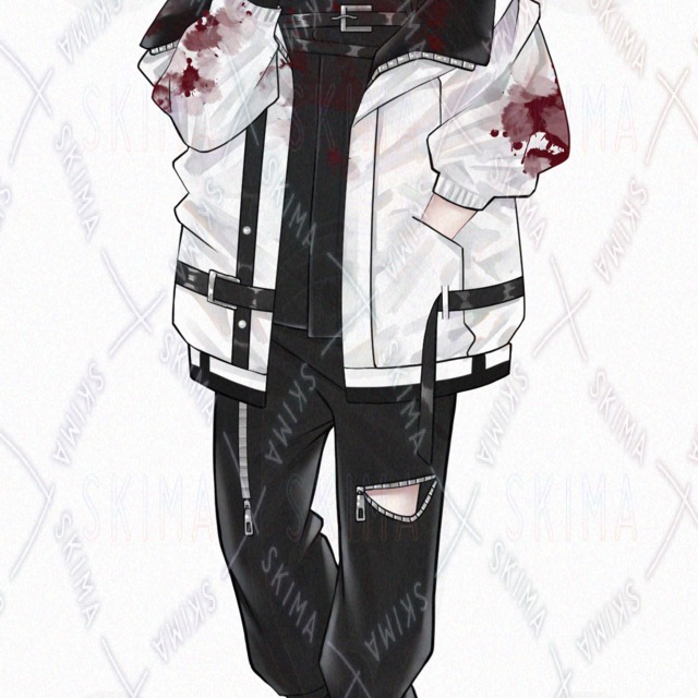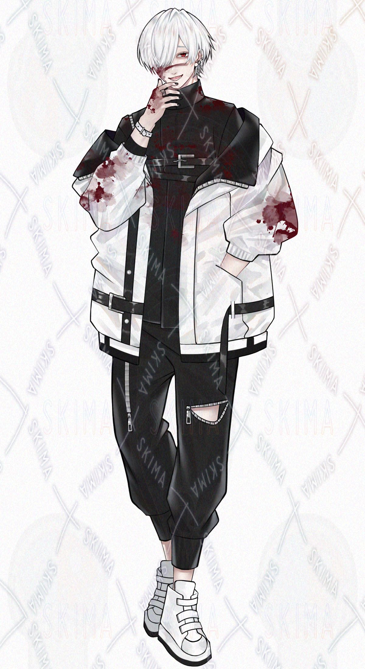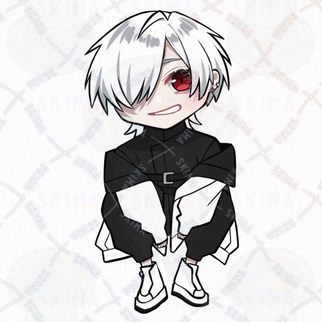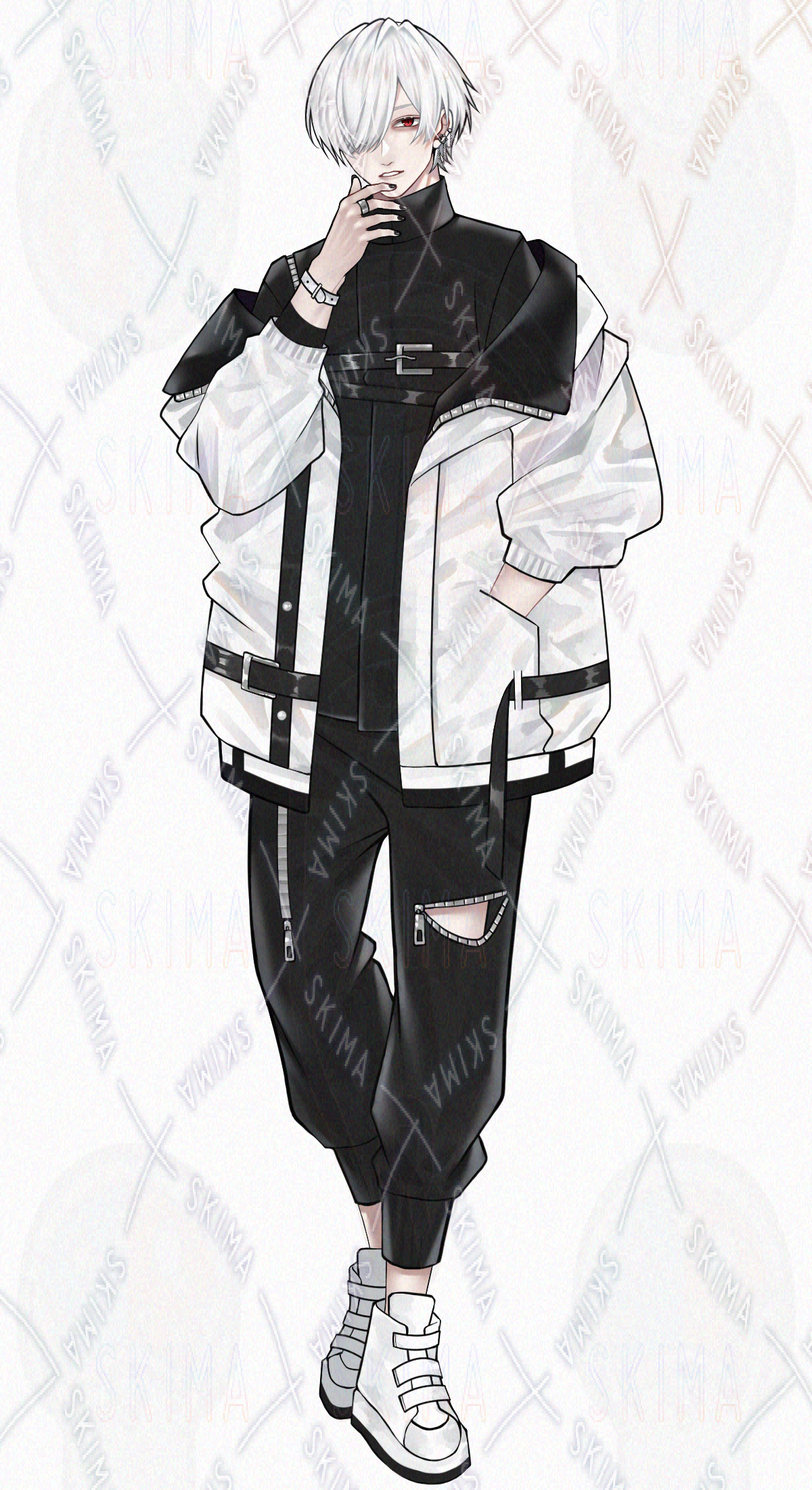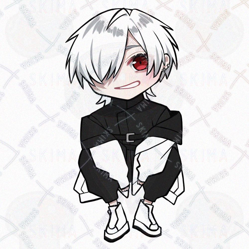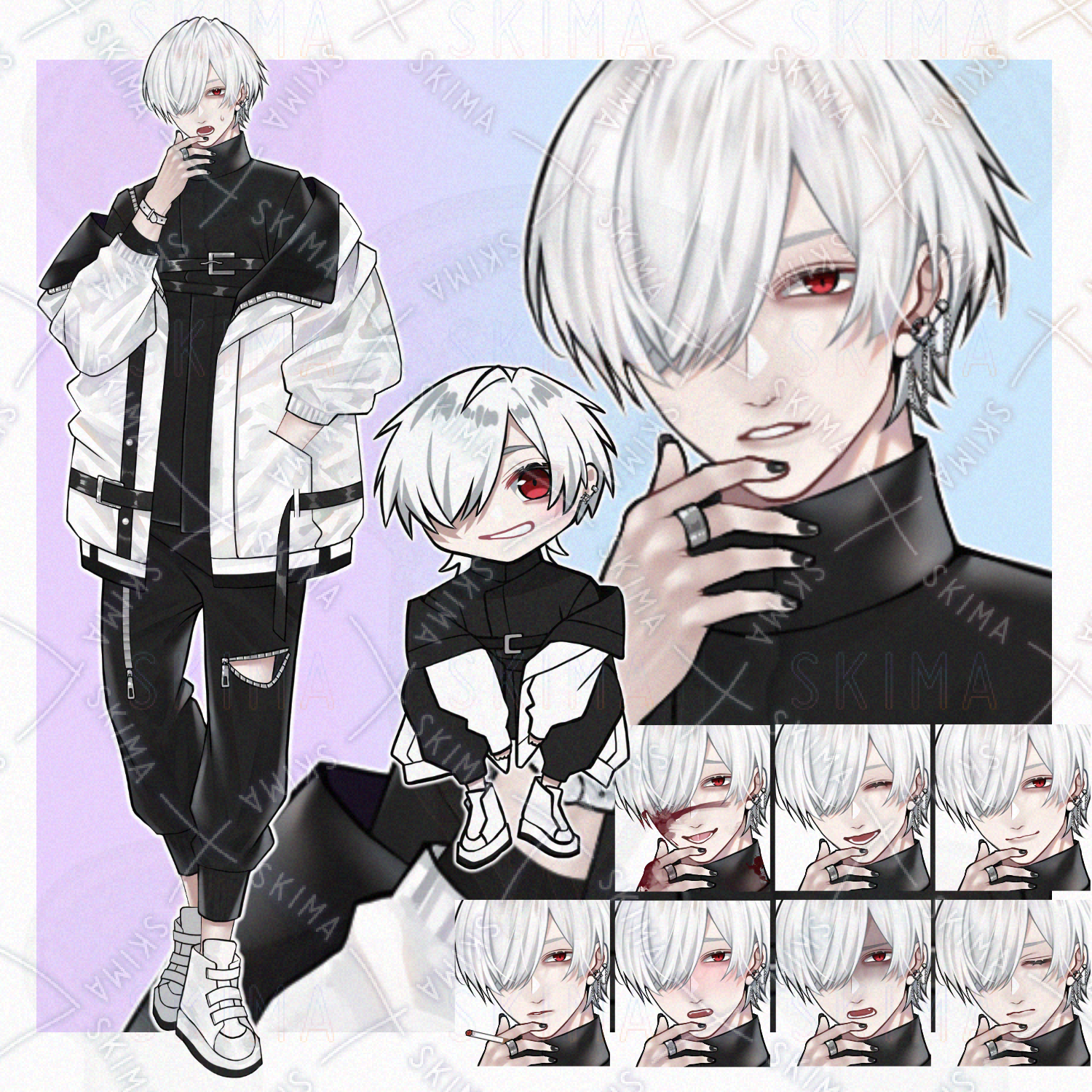 男の子/男性キャラクター/立ち絵/白髪/TRPG/全身/アルビノ/モノトーン/SDキャラ/ミニキャラ/タクティカル/サイバー風/煙草/赤眼/片目隠れ/黒ネイル