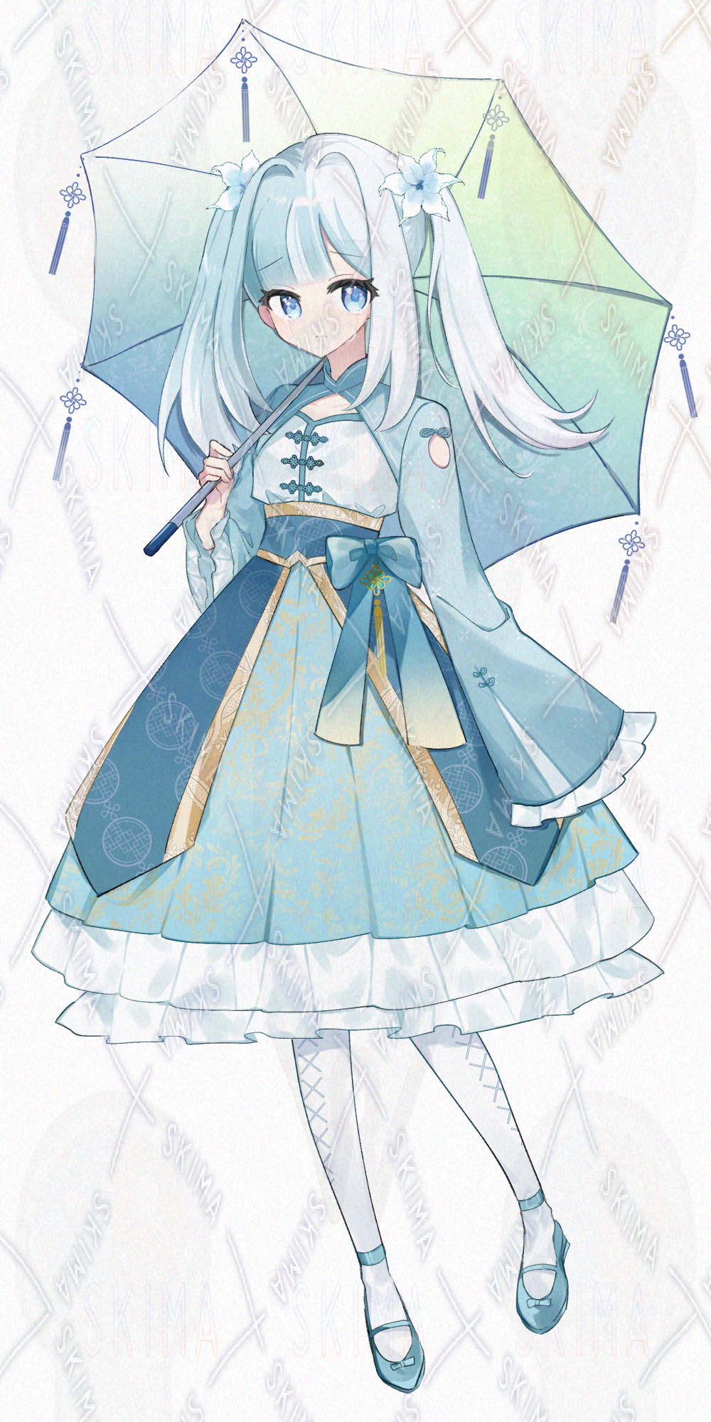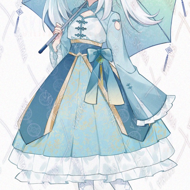 水色と白のツートーン髪をツインテールにした中華ロリータの少女の立ち絵です。