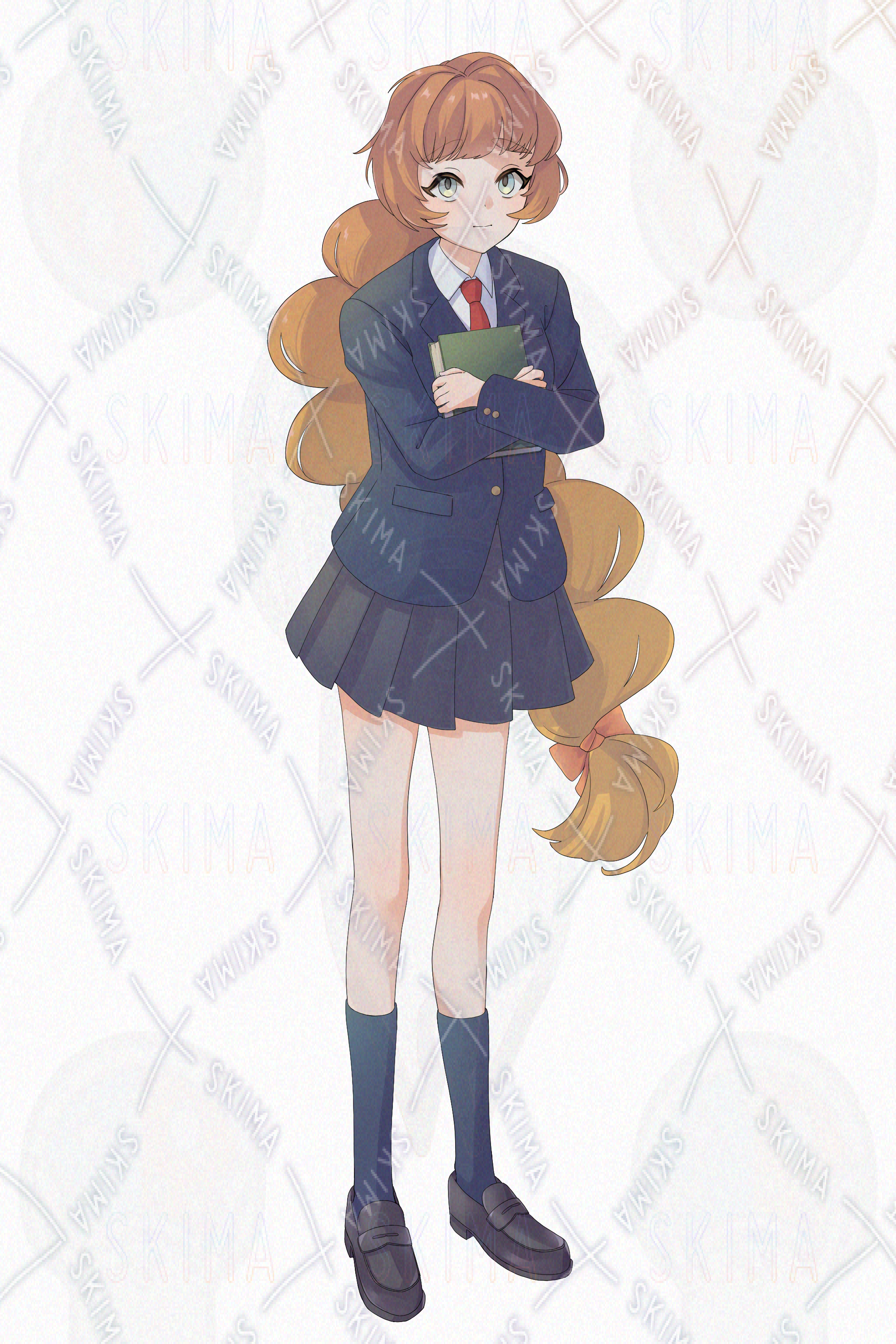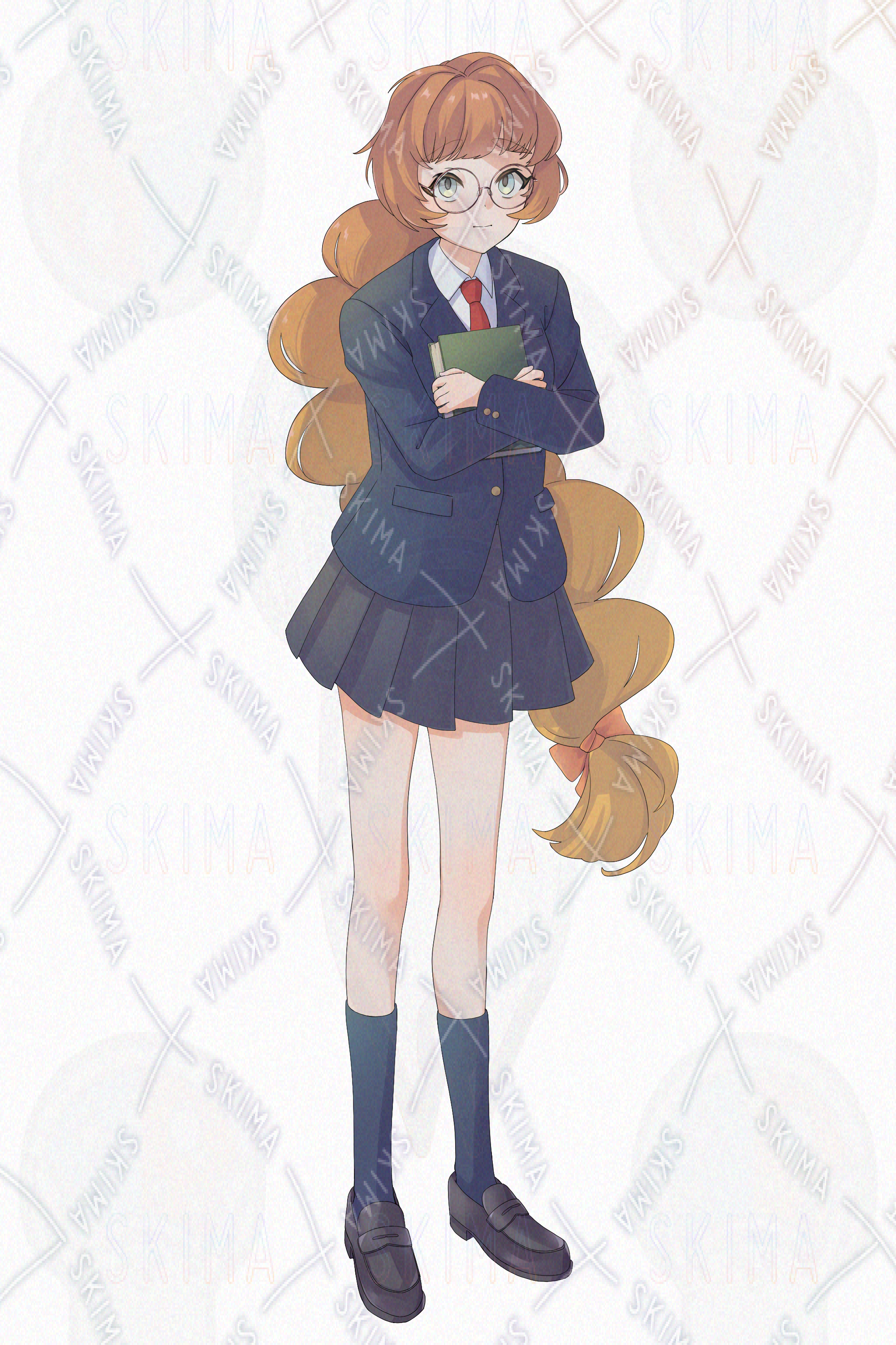 三つ編みで眼鏡をかけ、本を抱えている女子高校生の立ち絵イラストです。