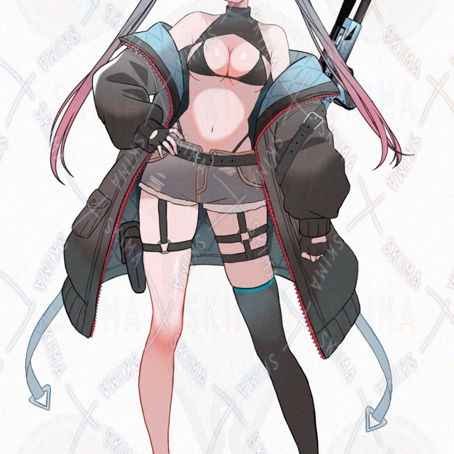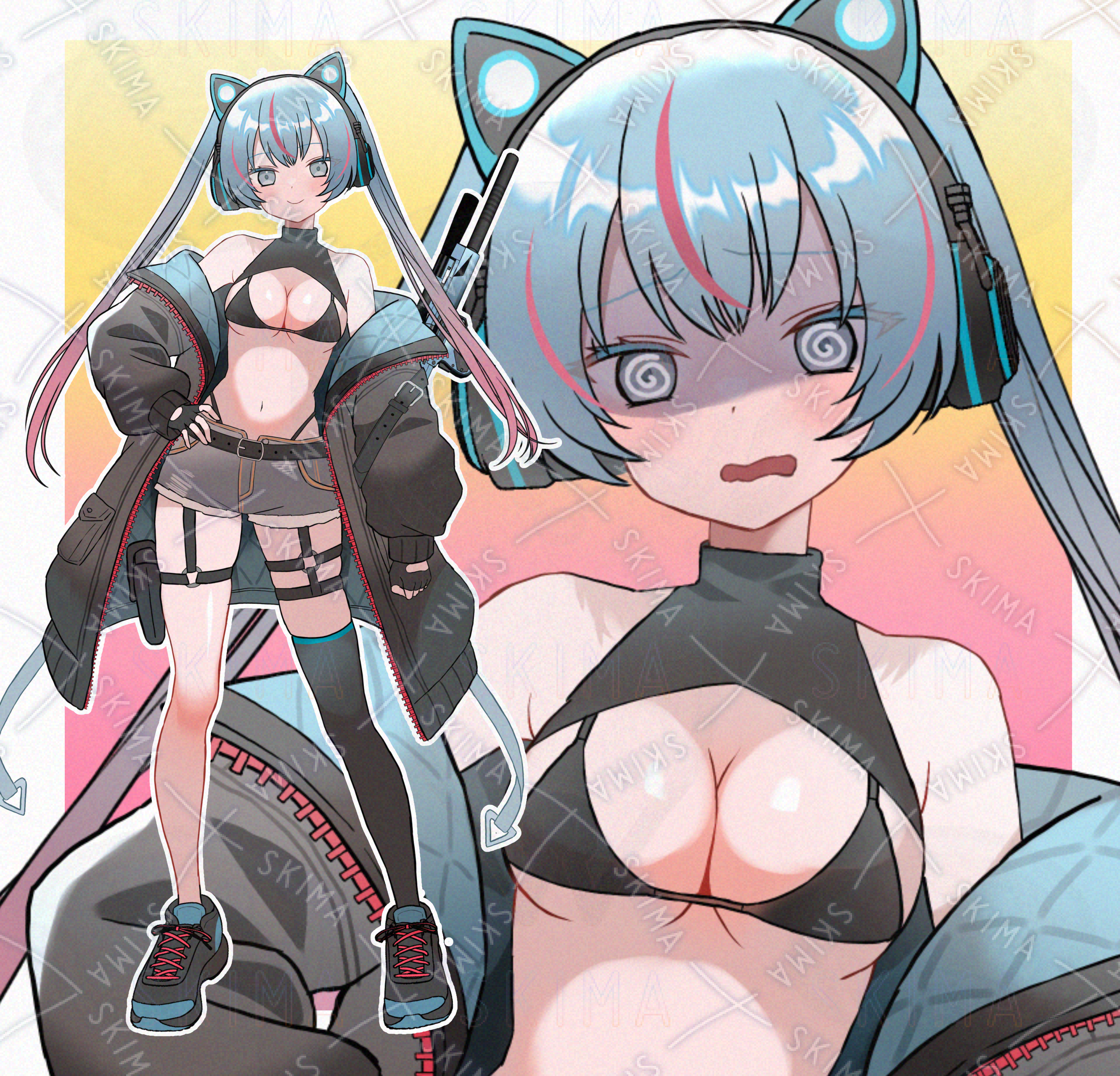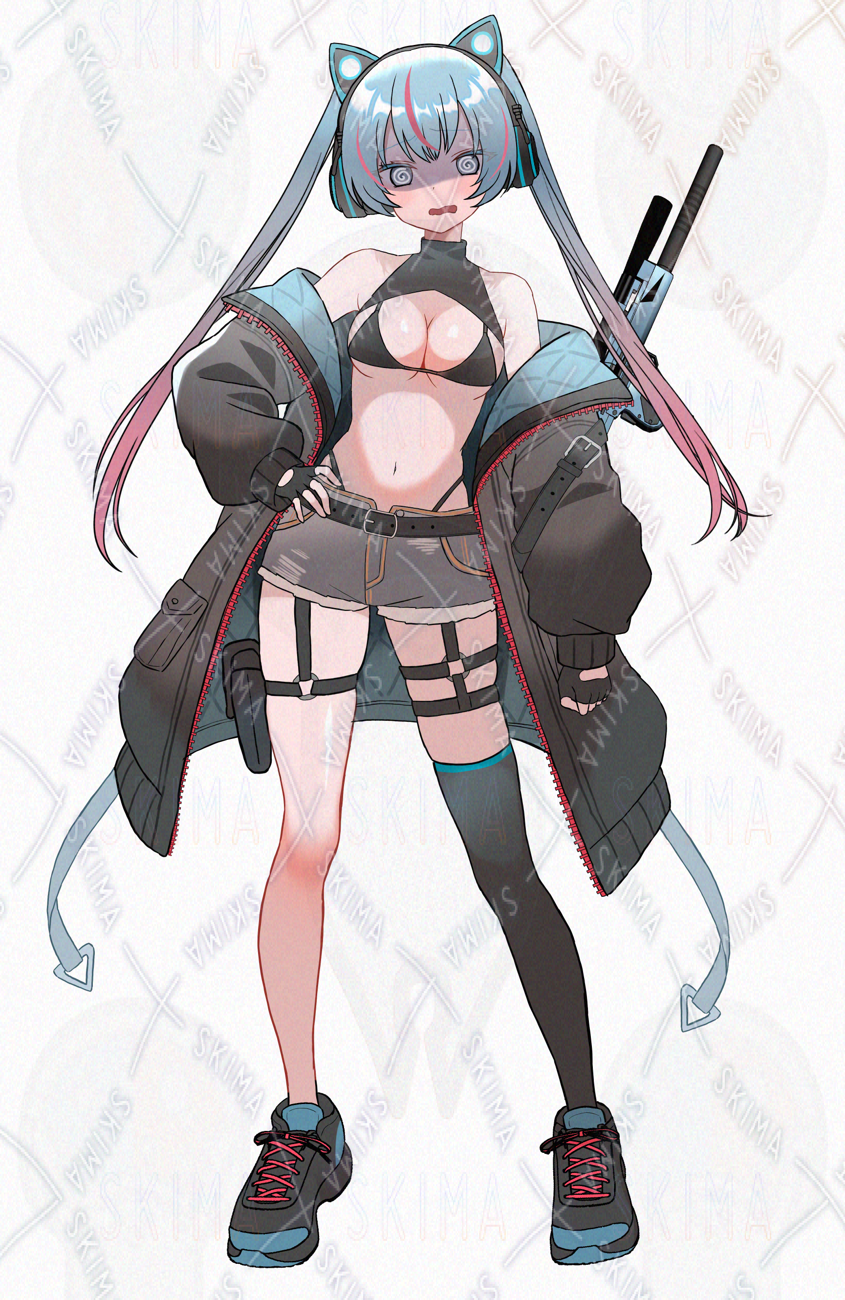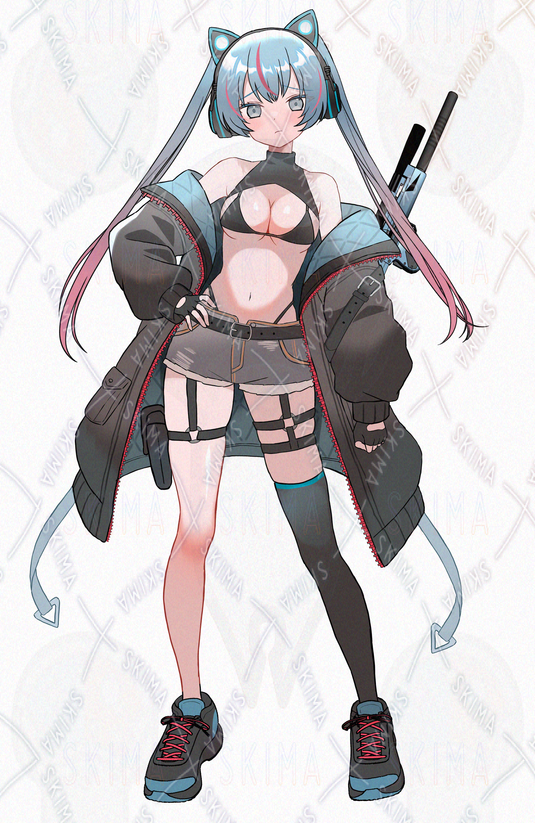 ネコミミヘッドホン、マイクロビキニ、狙撃銃、水色