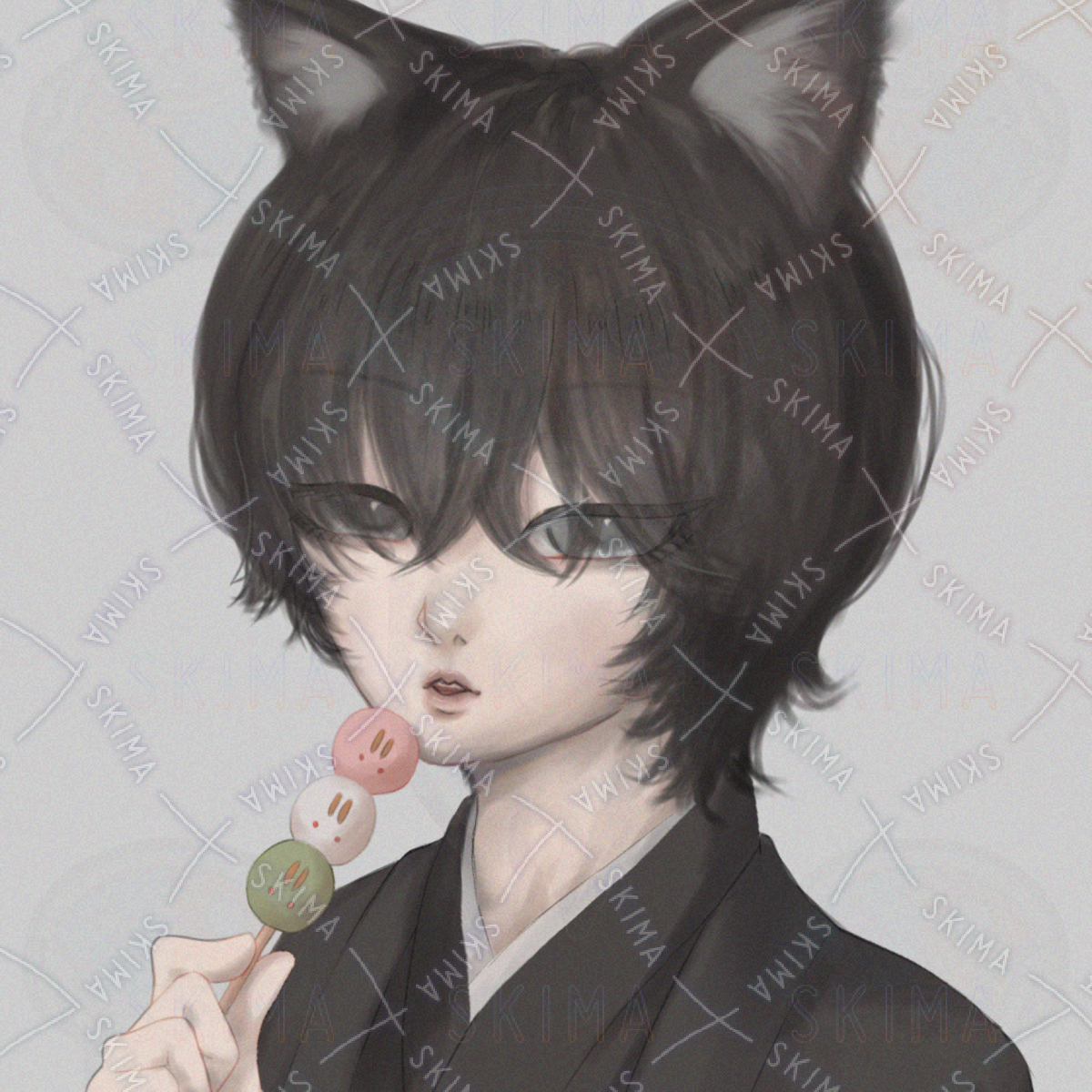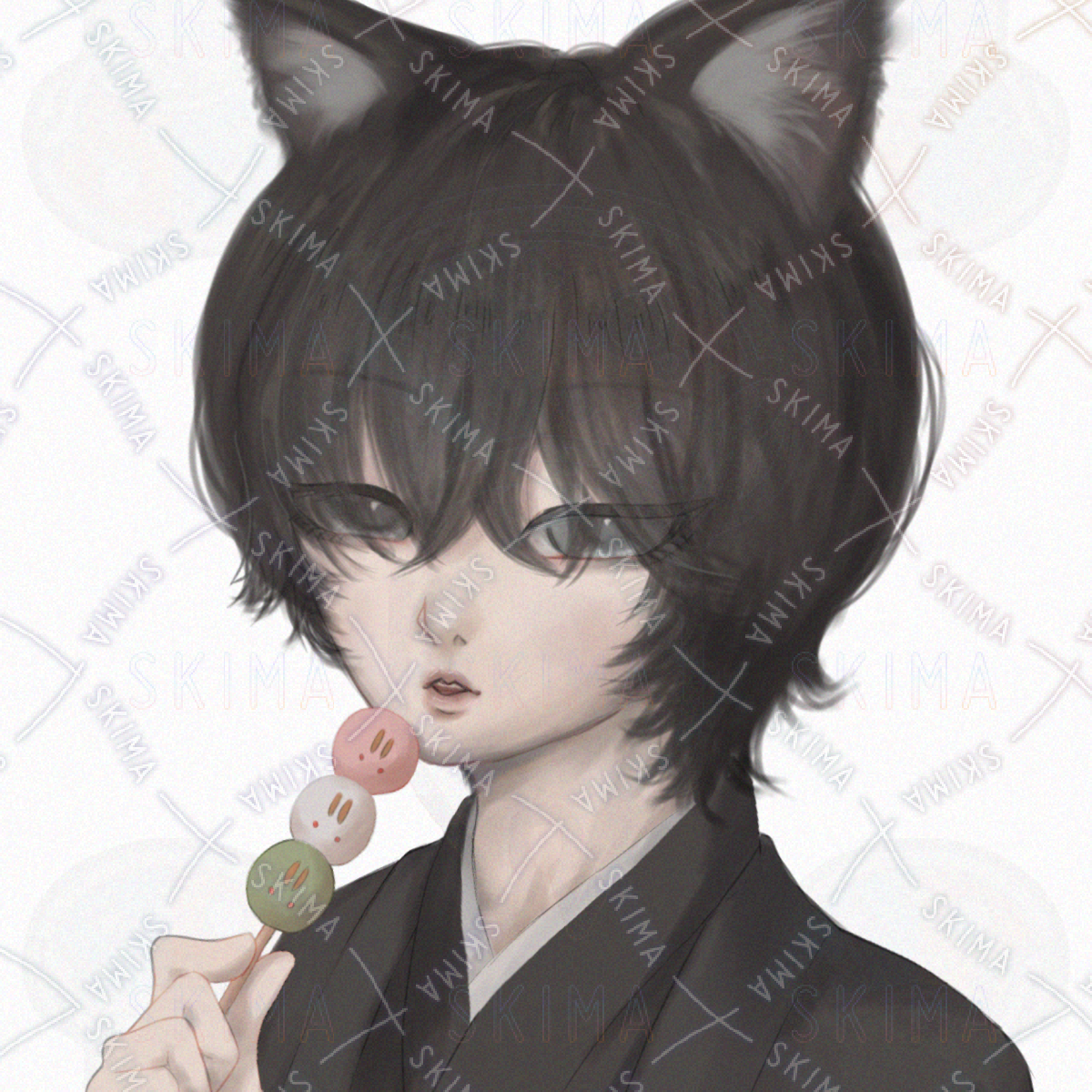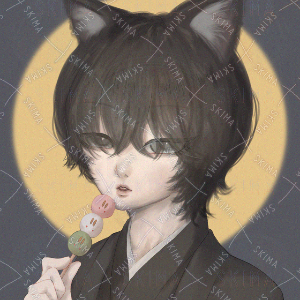 お月見しながら団子を食べている黒猫少年の厚塗りSNSアイコンイラストです。月見背景・無彩色背景・透過の3つです。