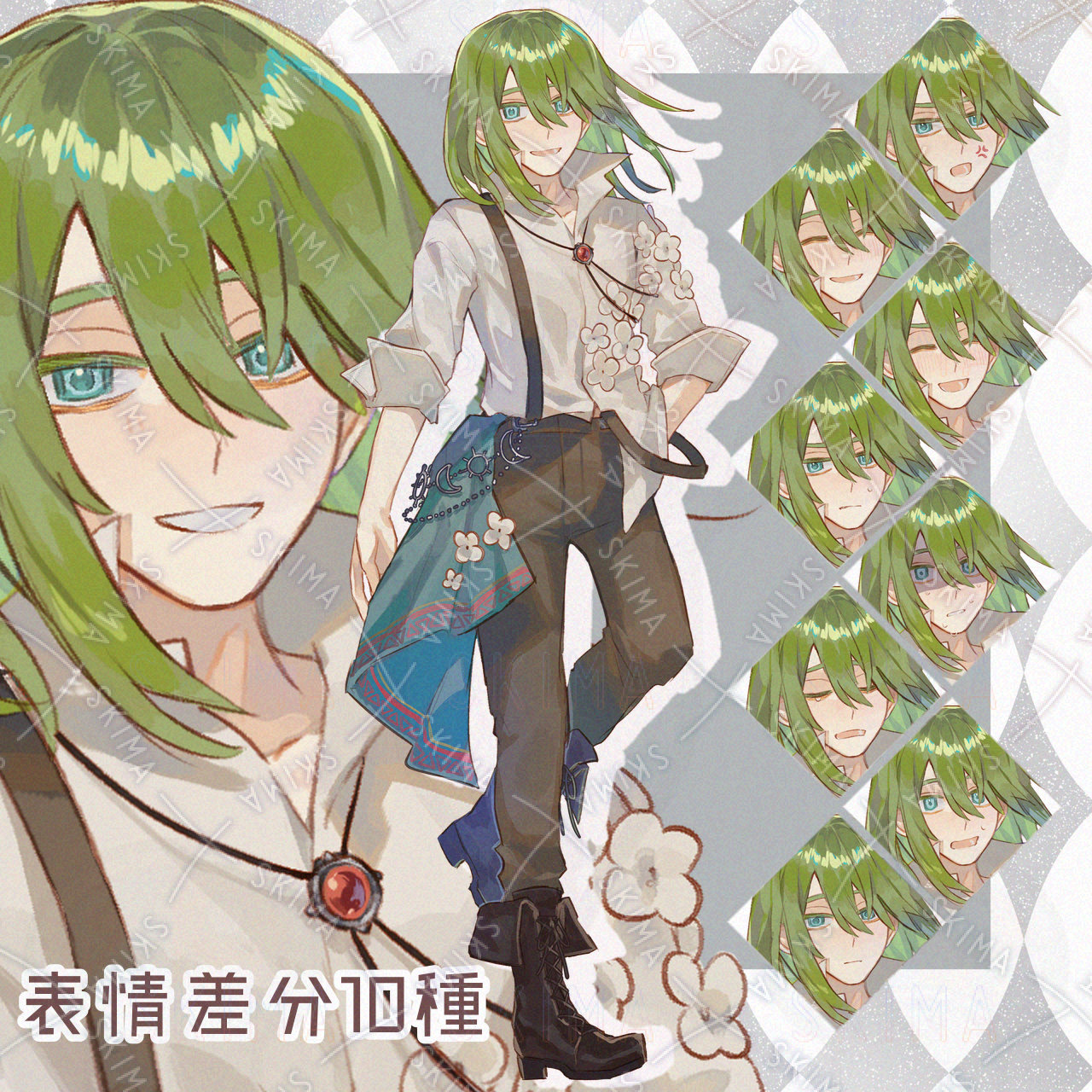 ファンタジーっぽい服装の長髪男性の立ち絵です。気持ち明るい雰囲気の表情が多めです。