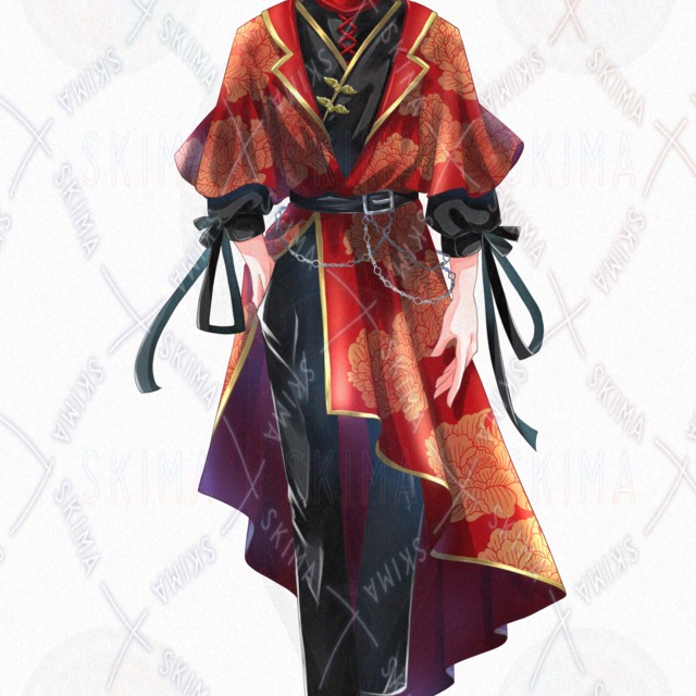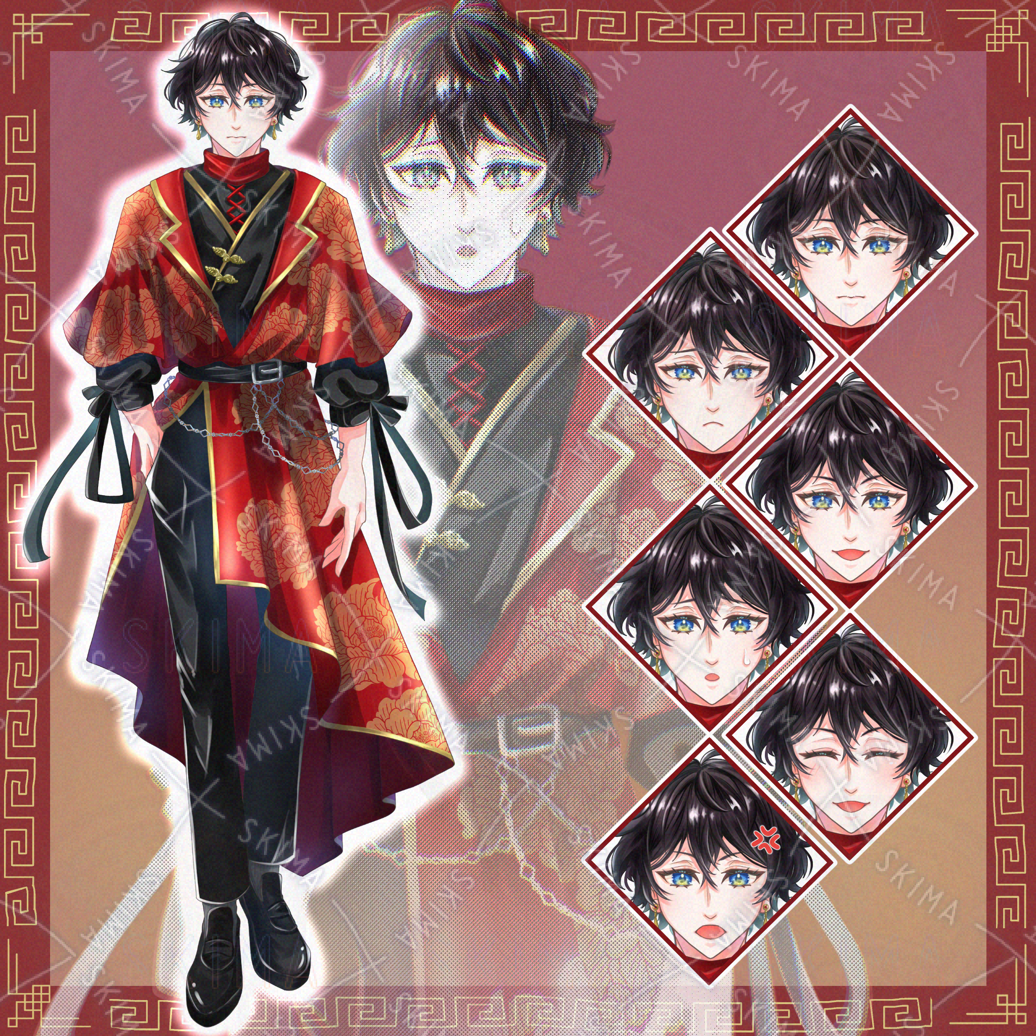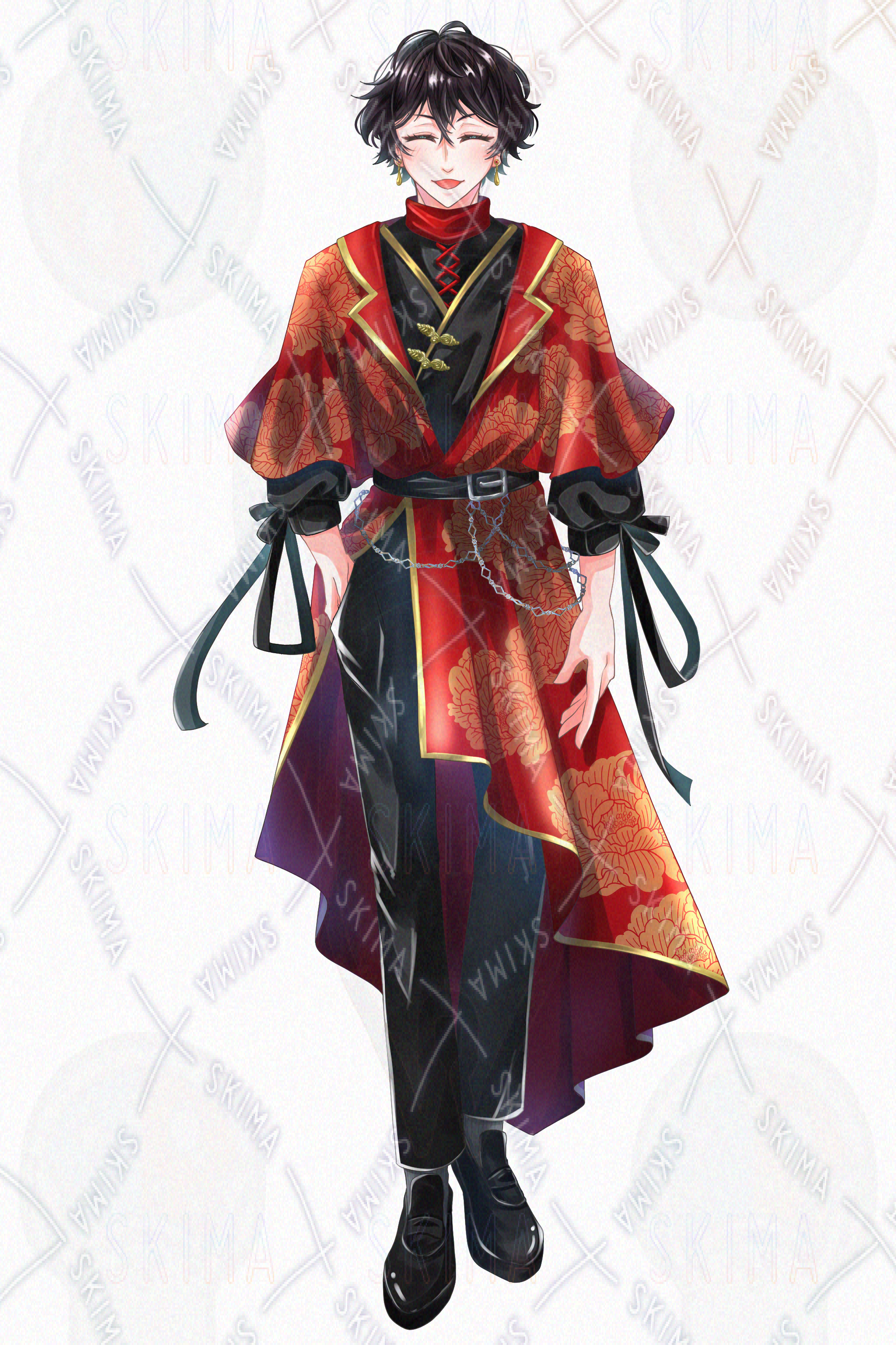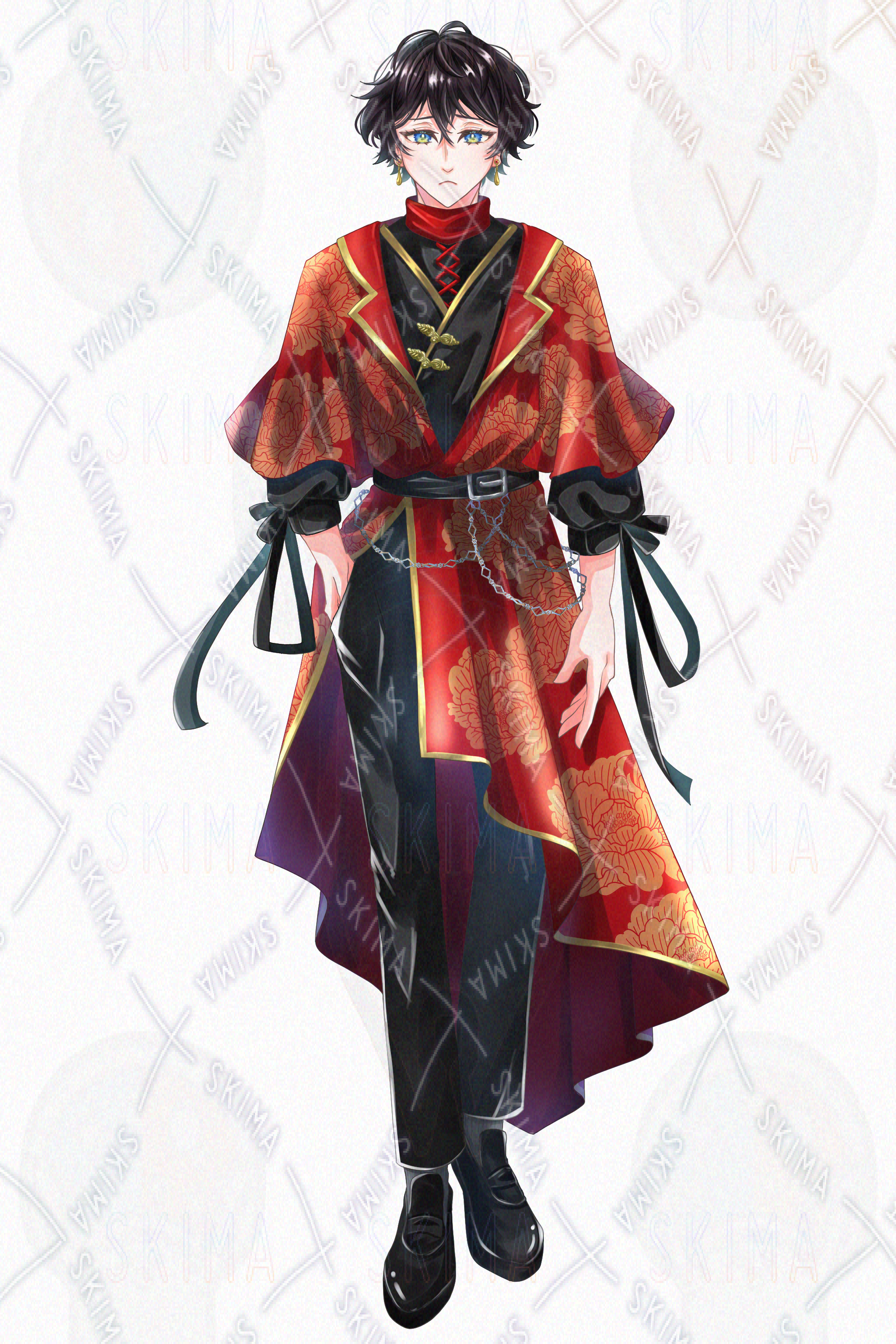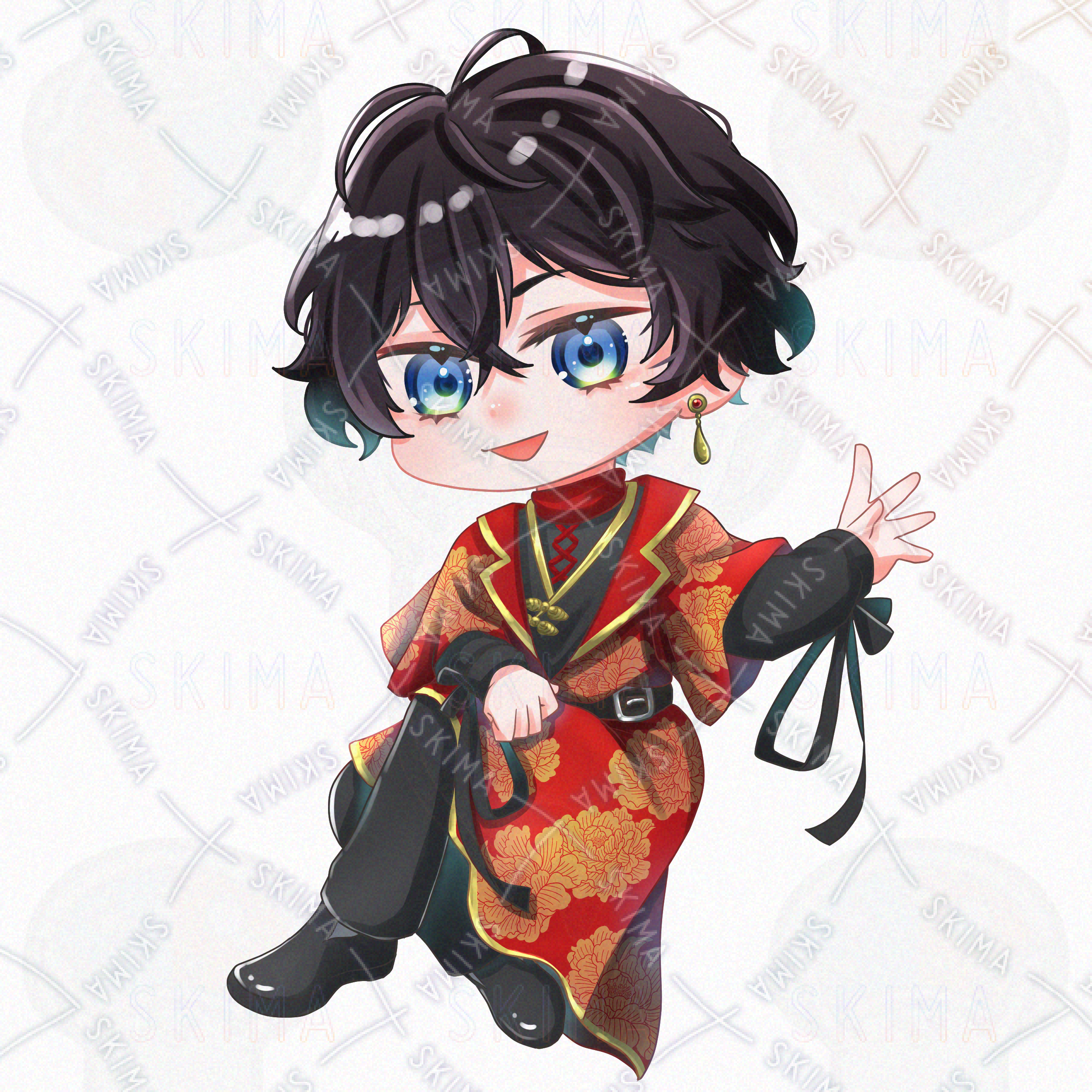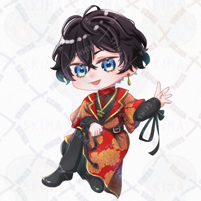 男性/青年/チャイナ/ファンタジー/黒髪/中華風/赤/黒/牡丹柄/ピアス/立ち絵/SDイラスト/ミニキャラ/IRIAM対応