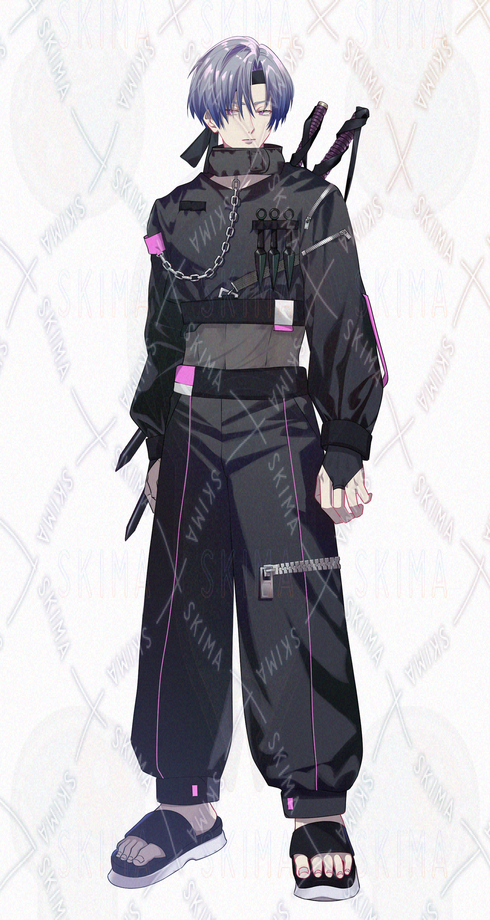 和風/黒装束/シルバー/青髪/クナイ/チェーン/刀/二刀流/クール