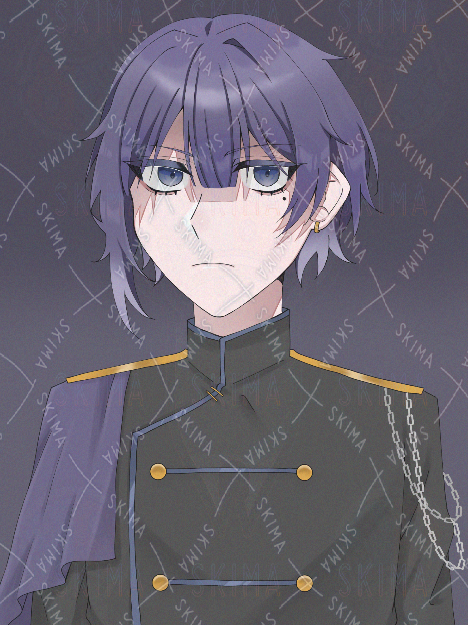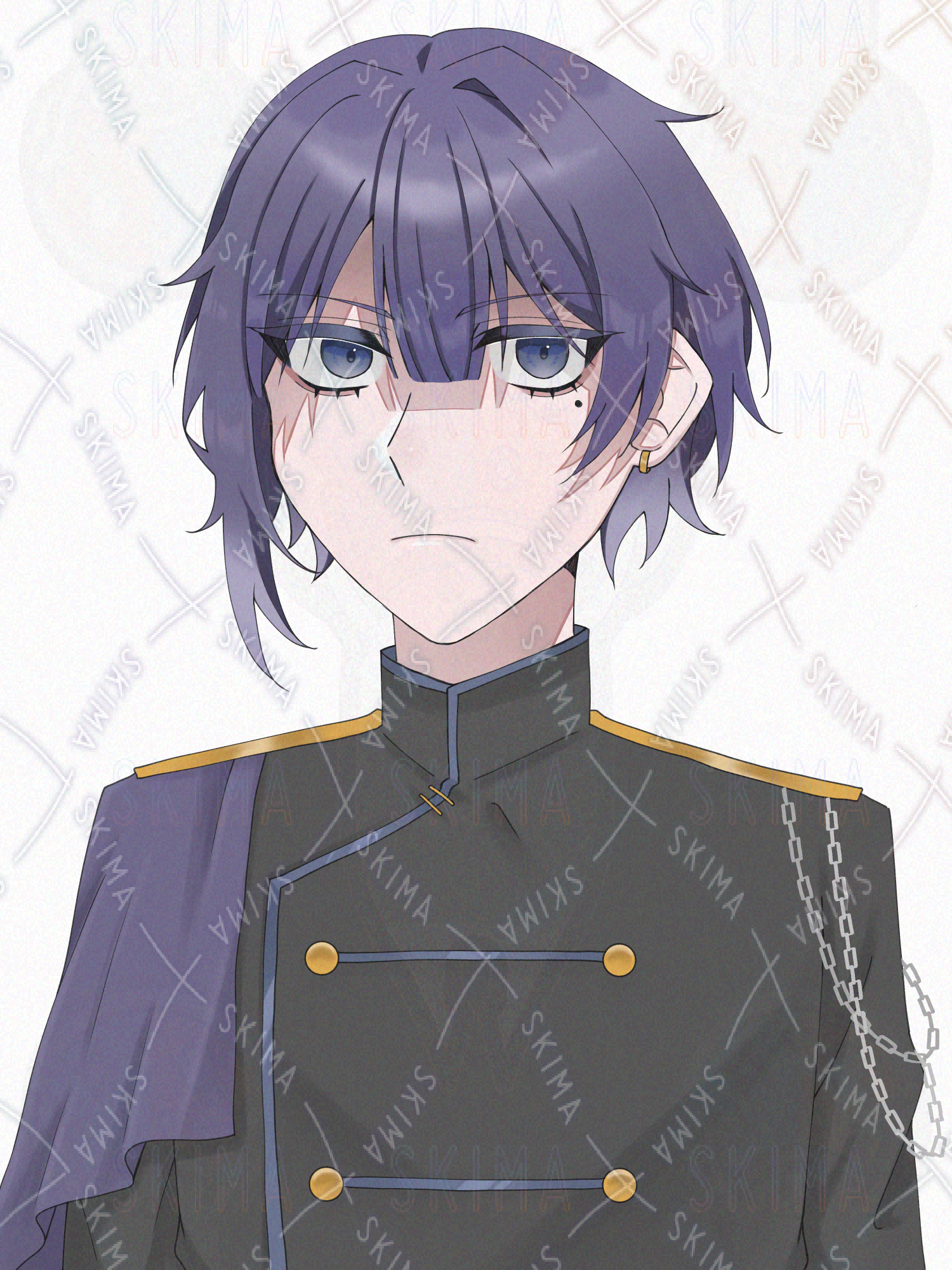 金色の装飾とチェーンがアクセントになった、重厚感のある軍服を着たミステリアスな雰囲気の青年です。