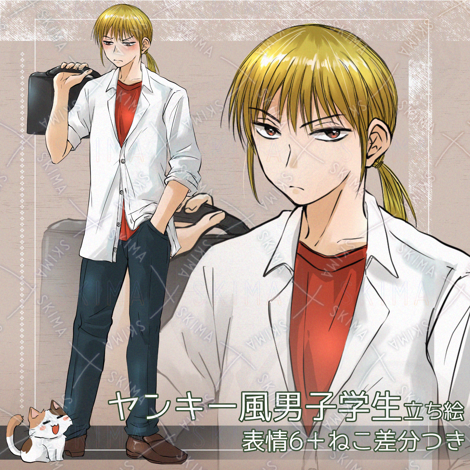 ヤンキー風男子学生の立ち絵(表情6種+ネコ差分つき)