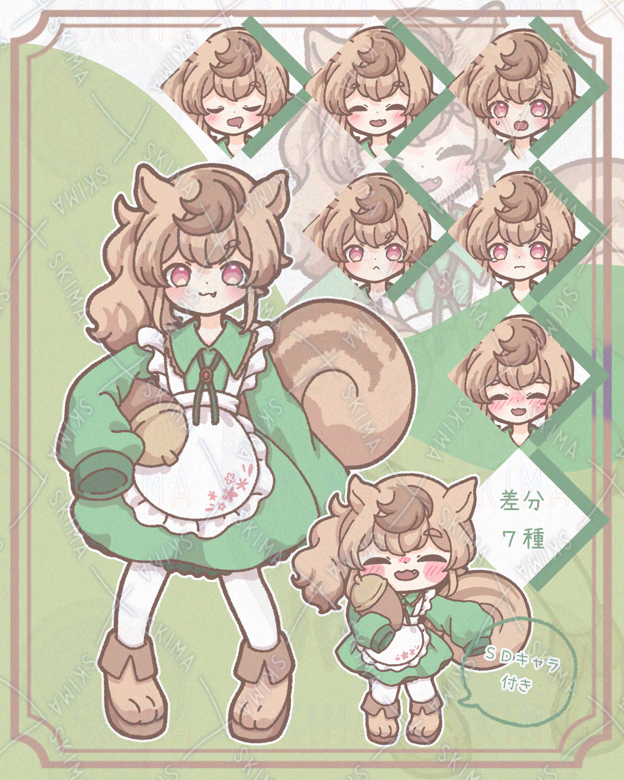 エプロンドレスを着たリスの女の子の立ち絵とSDキャラのセット販売です。
