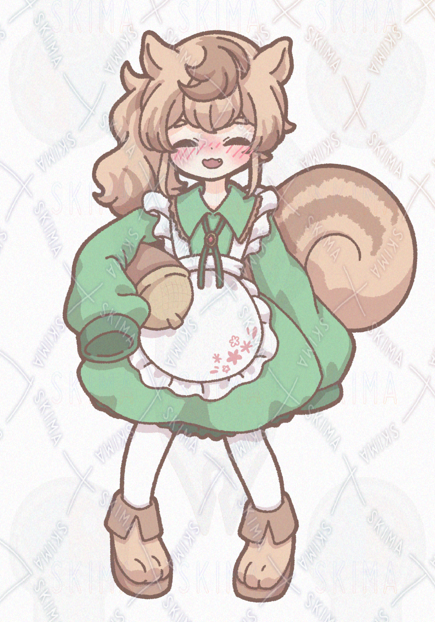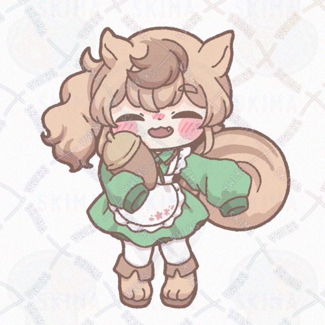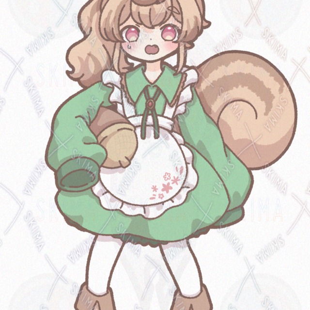 かわいい 女の子 リス エプロンドレス サイドポニーテール ふわふわ どんぐり 八重歯 萌え袖 ケモ 緑 立ち絵 ミニキャラ SD