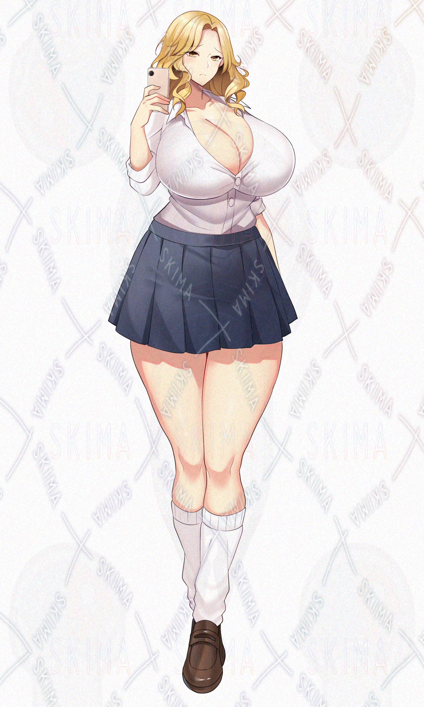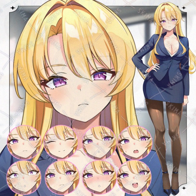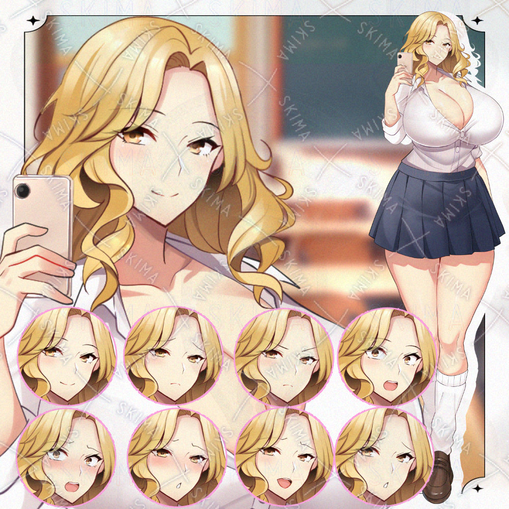 ギャル / 金髪 / カールヘア / 立ち絵 / アドプト / キャラ販売 / 表情差分 / 学園 / 制服 / JK / お姉さん / 明るい / 陽キャ / 美人 / 巨乳 / セクシー / フレンドリー / Live2D対応 / キャラクターデザイン / 美少女立ち絵 / adopt character / ゲーム素材 / 透過PNG