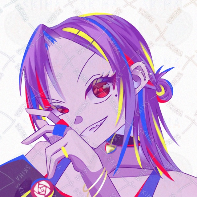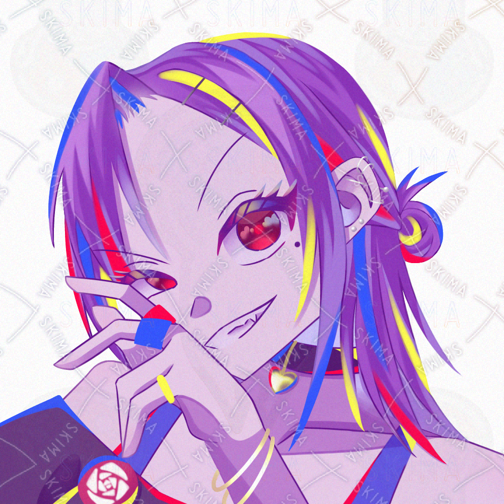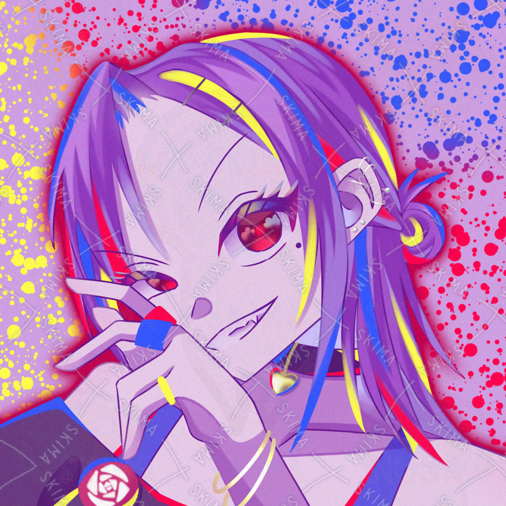 キャラクターデザイン/セミロング/お団子/ピアス/ほくろ/チョーカー/紫髪/赤目/肩出し/指輪/パンク/バンド/パンキッシュ