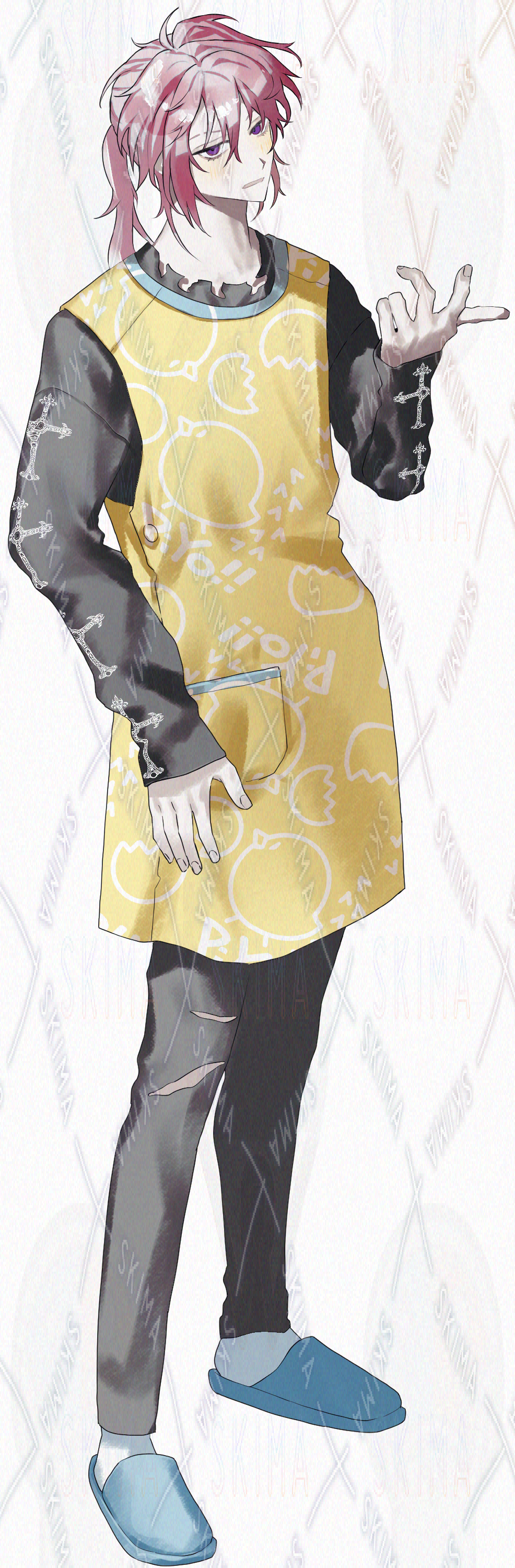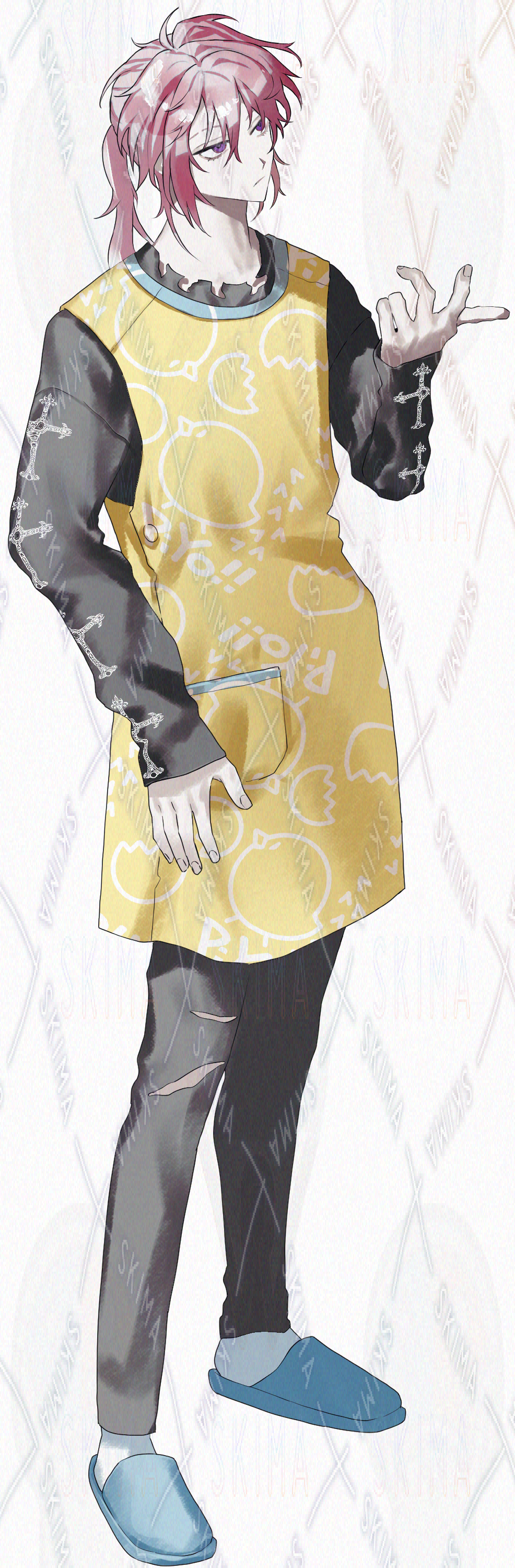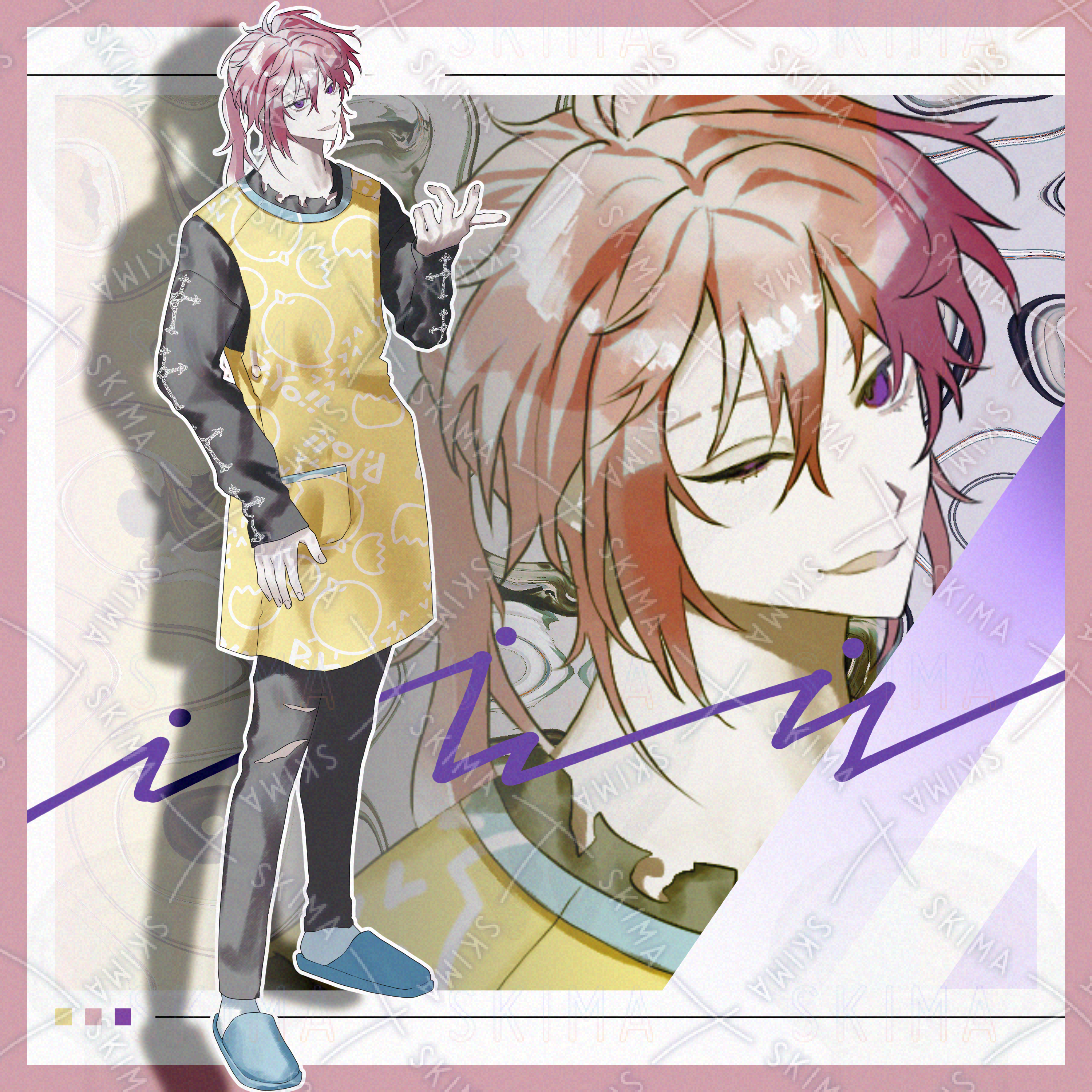 ひよこエプロン、ポニーテール、ポニテ、ピンク髪、紫目、ツリ目、下まつ毛