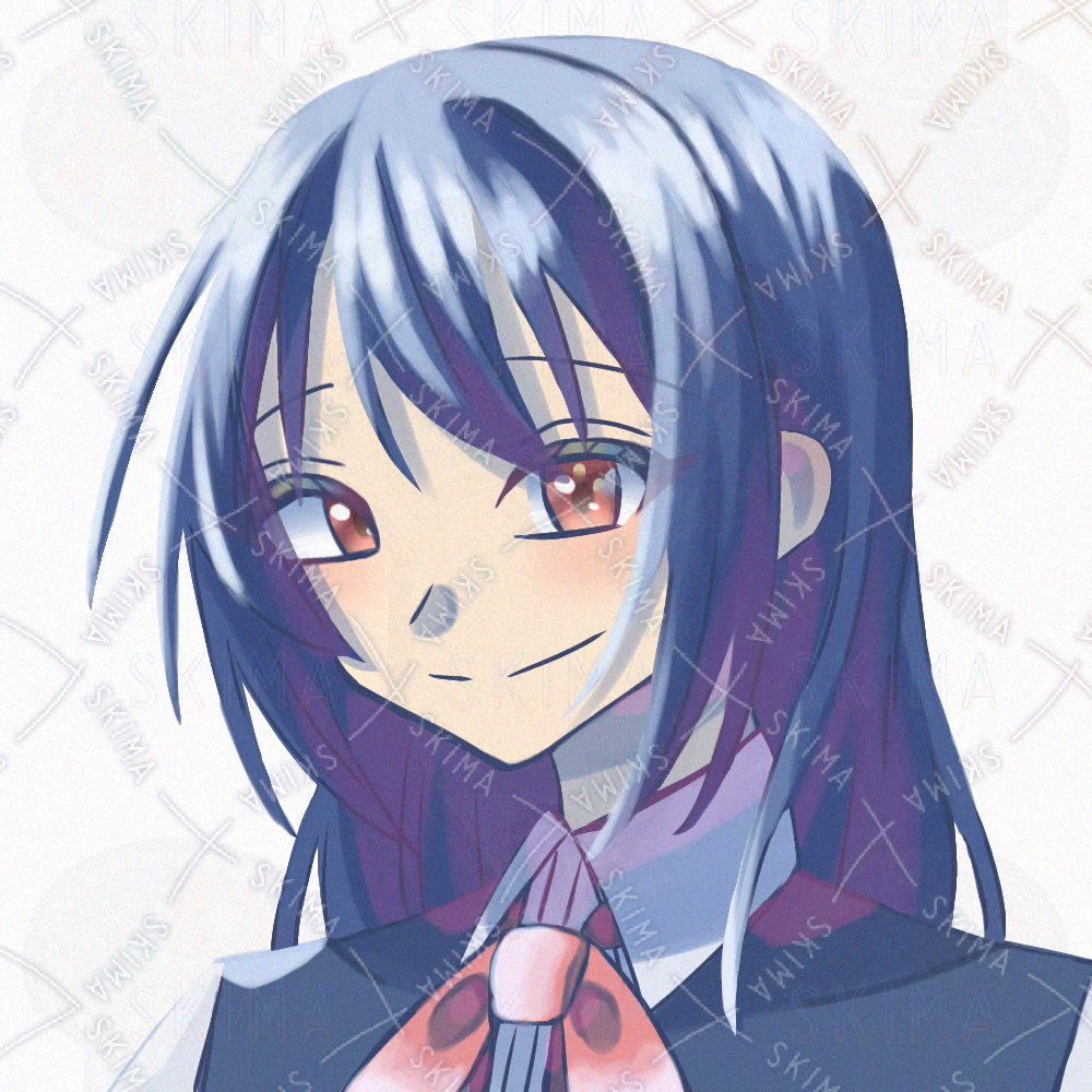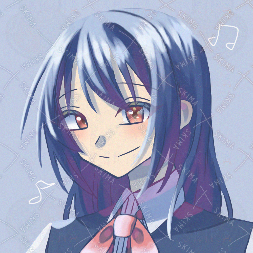 キャラクターデザイン/ピアニスト/音楽家/演奏家/しっとり/笑顔/赤リボン/ロングヘア/青髪/赤目